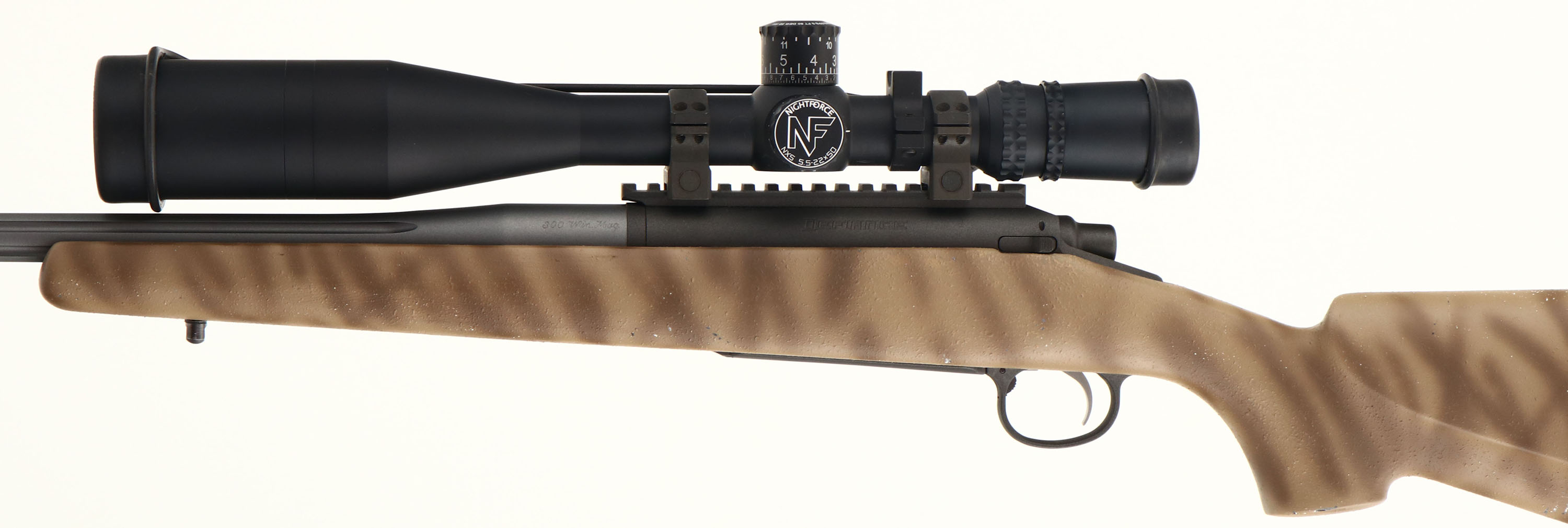 CUSTOM, Defiance, Model ''Rebel'', CAL: 300 WIN MAG, MFG: Modern, SN: NONE, Bolt Action Rifle, 26 1/2'' barrel. This gun was made by a Wyoming custom gun maker. It was originally custom built & auctioned off at a Wild Sheep Foundation event as a fundraiser. The custom, flat pistol & cheeked Monte Carlo synthetic stock is excellent, with a tan tiger striped & textured finish. The finish is excellent, but with a handful of minor scuffs & nicks. The matte gray custom fluted barrel is excellent. The left side of the barrel is stamped with the caliber & the right side is hand engraved ''Longshot Precision''. The parkerized finish on the receiver is excellent. Bore is excellent, near mint. The receiver carries a NightForce NXS 5.5-22x50 scope, while the barrel has no open sight provisions. The stock carries a solid black rubber recoil pad. Sling studs present. Adjustable trigger, currently under 1lb trigger weight. This is a nicely custom built rifle, with a high quality scope. This rifle is in a popular big game hunting caliber & is ready for the hunt! FFL Req. - Value: 1500 to 3000