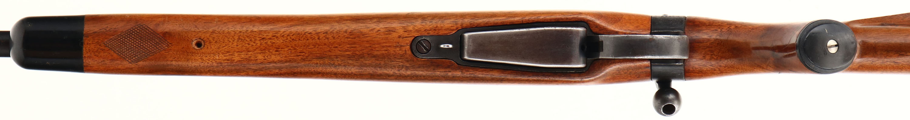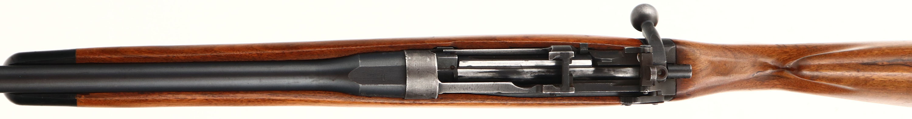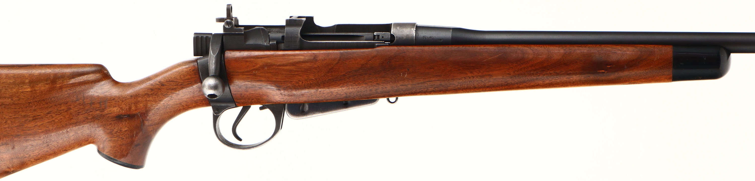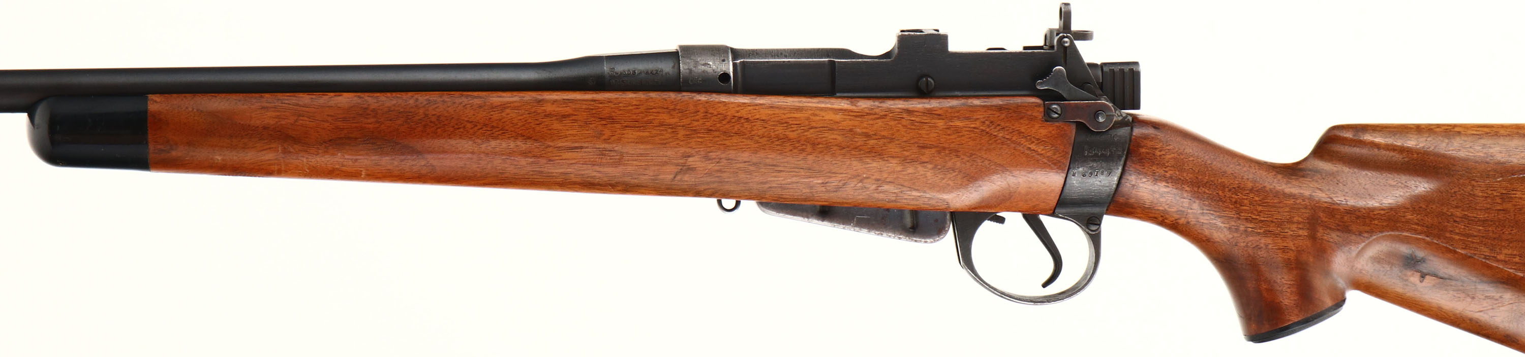 British, No 4 Mk 1 SMLE, Sporterized, CAL: 303 British, MFG: 1944, SN: M39I87, Bolt Action Rifle, 22'' barrel. The cheeked & capped pistol grip Monte Carlo style wood stock is good & solid. Finish is good, with multiple scratches, scrapes & dings. There is a small diamond of checkering near the black forend tip. The metal blue/gray finish on the barrel rates 85%, 70% on the receiver. Bore is good, with strong rifling. The receiver holds a dual flip-up peep rear sight, while the barrel holds a ramped blade front sight. Buttstock carries a grooved black plastic buttplate. The belly of the stock has two open holes & one filed hole from vacated sling studs. FFL or C&R Req. - Value: 250 to 500