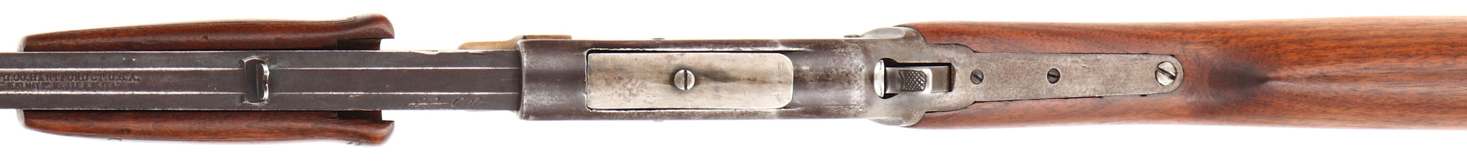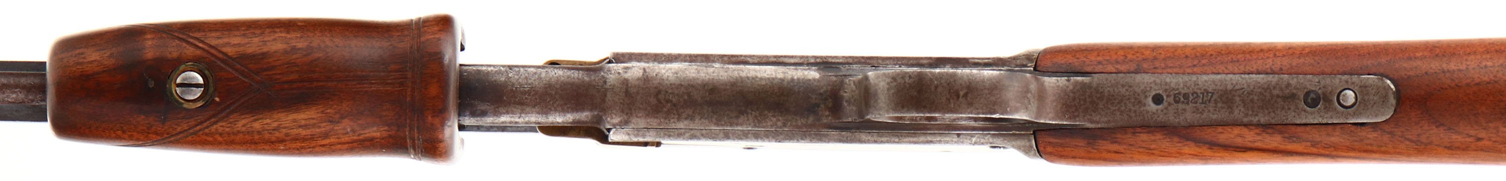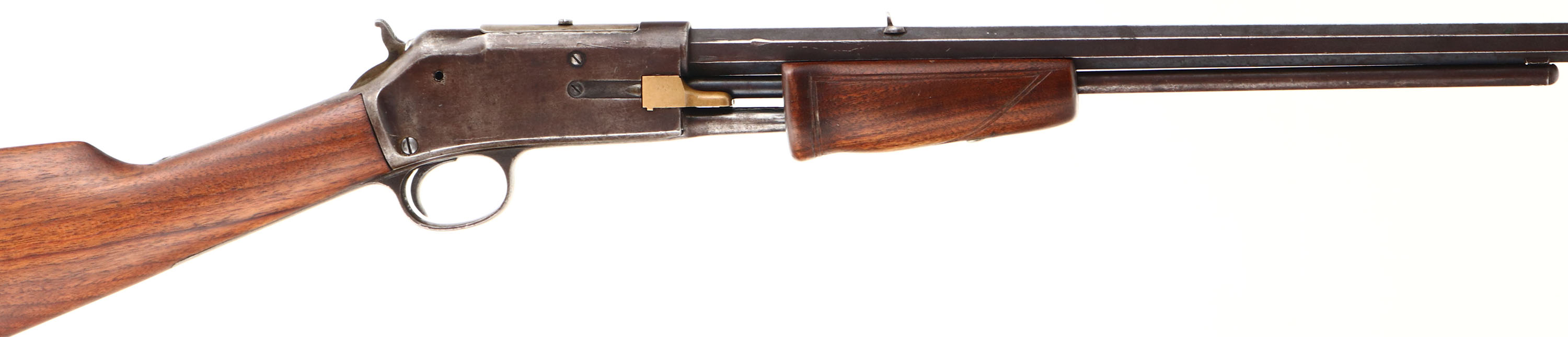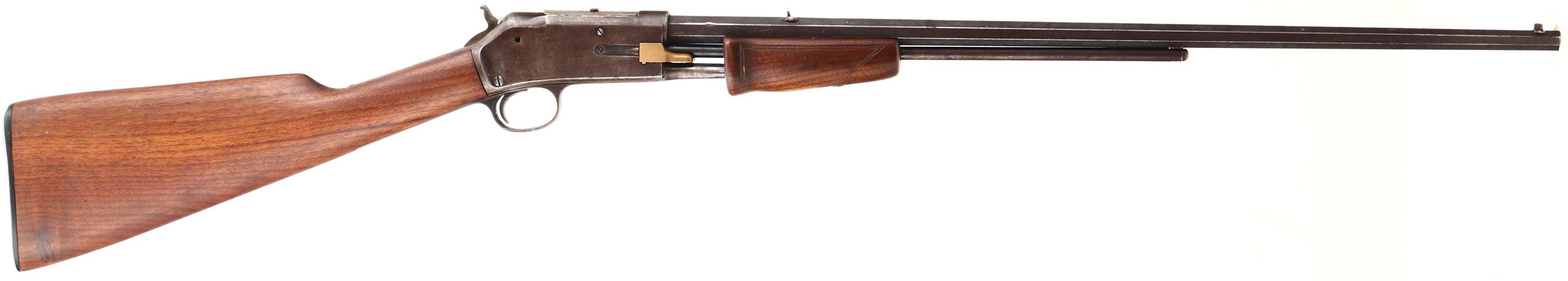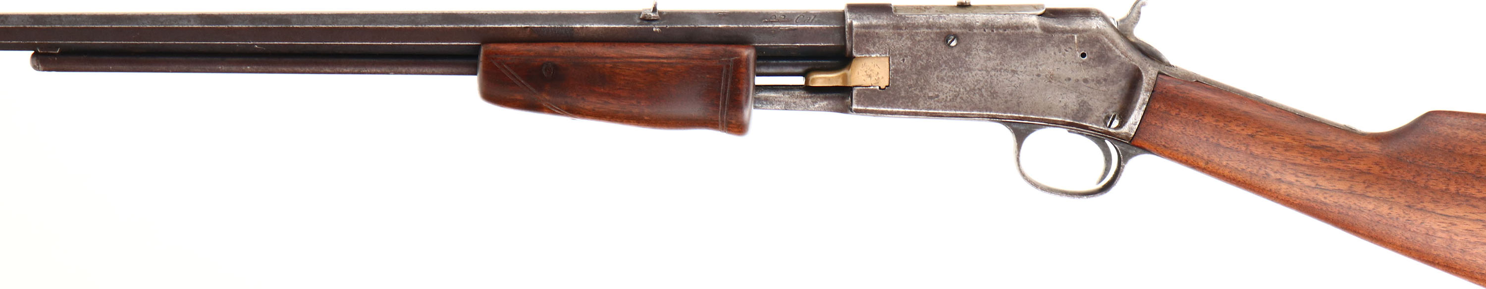 Colt, Lightning Small Frame, Marked: 22 CAL, MFG: 1902, SN: 69217, Pump Action Rifle, 24'' Octagon barrel, The original straight grip wood stocks are very good, as sanded & refinished. The forend is the smooth variety with border lines. The original metal blue finish on the barrel rates 60%, toning to a brown patina, with thinning & spotting. The receiver has worn to a mix of gun metal gray & a spotty thin brown patina. Bore is fair, with rough spotting/pitting amongst worn rifling. The barrel holds a fixed rear sight & small blade front sight. Buttstock carries a Colt marked checkered plastic buttplate, which fits a bit proud to the wood. A neat old early .22 pump rifle. FFL or C&R Req. - Value: 600 to 1200