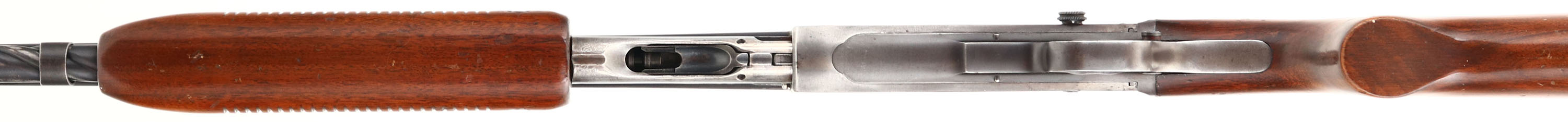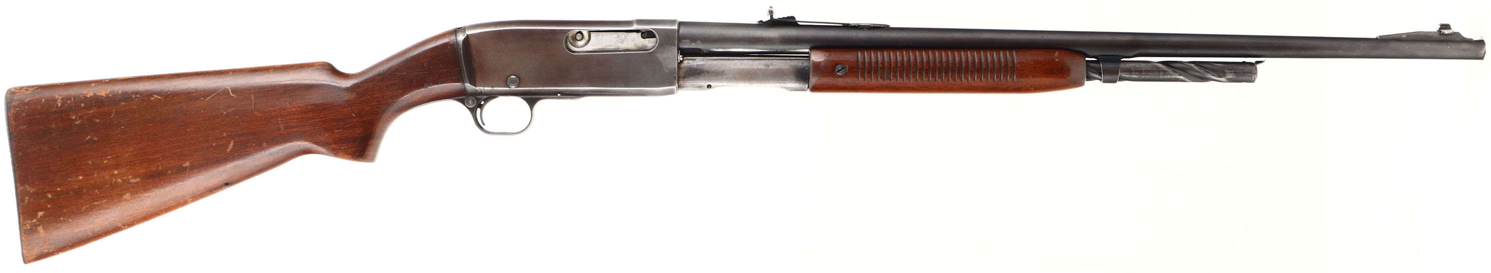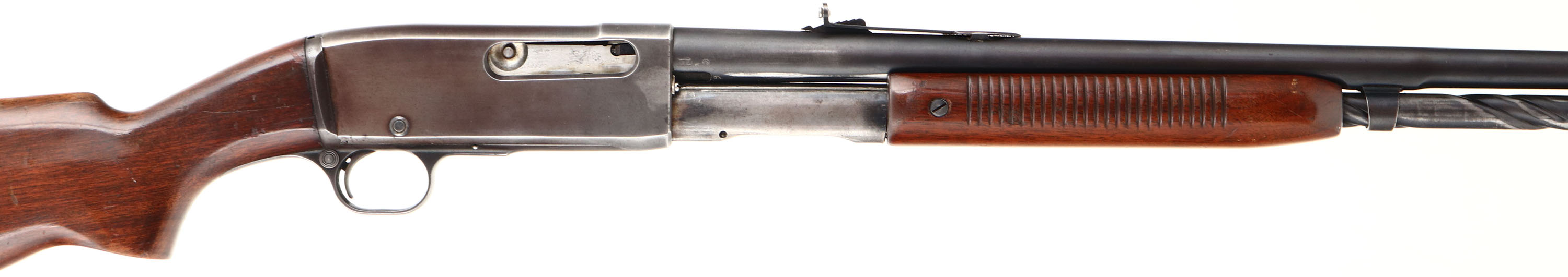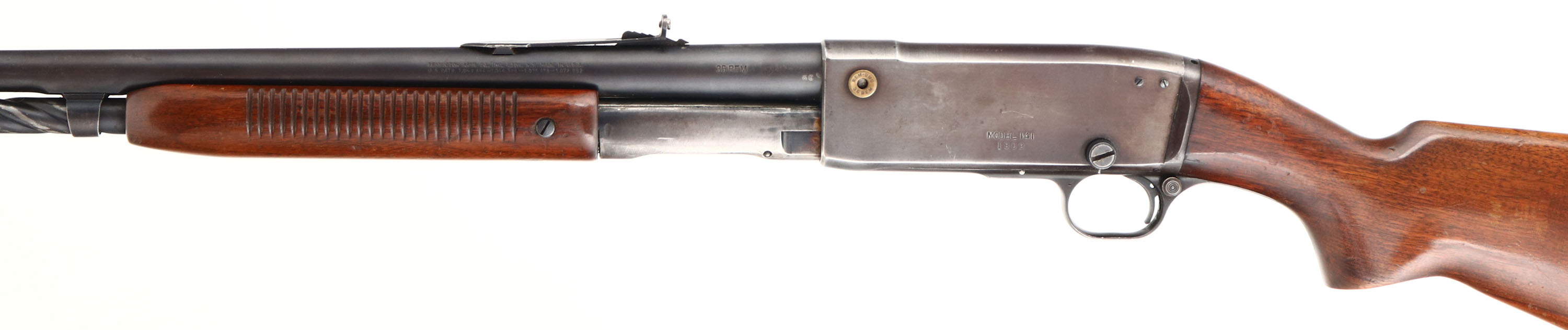 Remington, Model 141 Gamemaster, .35 REM Cal., MFG: 1935, First year of production, SN: 1909. Pump Auction Take-down Rifle, 24'' round barrel. The original flat pistol grip wood stocks are good & solid, despite 4 short hairline cracks on the wrist, which a very typical of these Remington pumps. The stocks carry the original finish, but with crazing & lots of spotty areas of flaking. There are also small contusions & scratches. There is an unexplained small open hole along the right side of the bottom belly of the stock 2 1/2'' behind the trigger guard. The metal finish on the barrel rates 80% toning gray, & 60% on the receiver toning to a plum/brown patina. Bore is very good. Receiver carries two filler screws from a previous receiver sight, while barrel carries an adjustable rear sight, with a replaced screw in the face of the sight, while the front ramp carries a small blade with numerous small dings. Factory metal buttplate, with rust. Action is tight & functions well. A nice looking vintage pump hunting rifle. FFL or C&R Req. - Value: 300 to 600