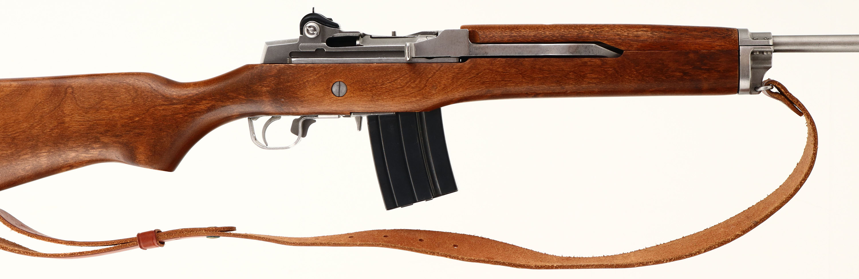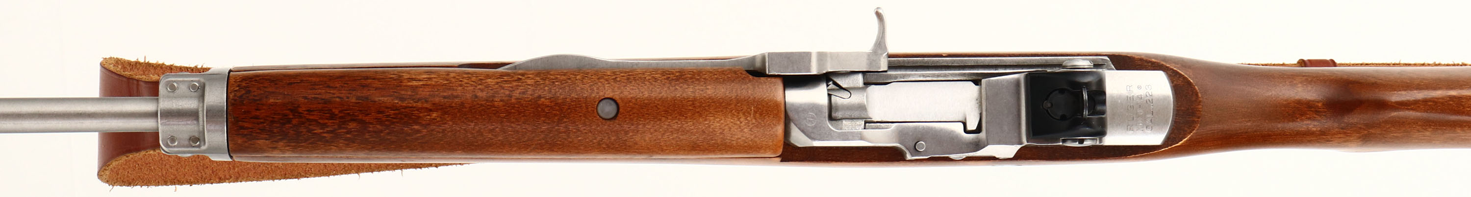 Ruger, Model Mini 14 Ranch Rifle, marked 223 Cal., MFG: 1982, SN: 183-12314, Semi-Auto Rifle, 18 1/2'' Round barrel, Factory hardwood stock is excellent, with original finish & very few tiny contusions. The stainless steel metal finishes are excellent. Factory Ruger plastic buttplate. Ruger marked factory mag. Bore is minty. Receiver carries a factory adj. folding ghost ring aperture rear sight & tall blade front sight. Factory sling loops carry a leather sling. An overall excellent original stainless mini 14. FFL Req. - Value: 800 to 1200