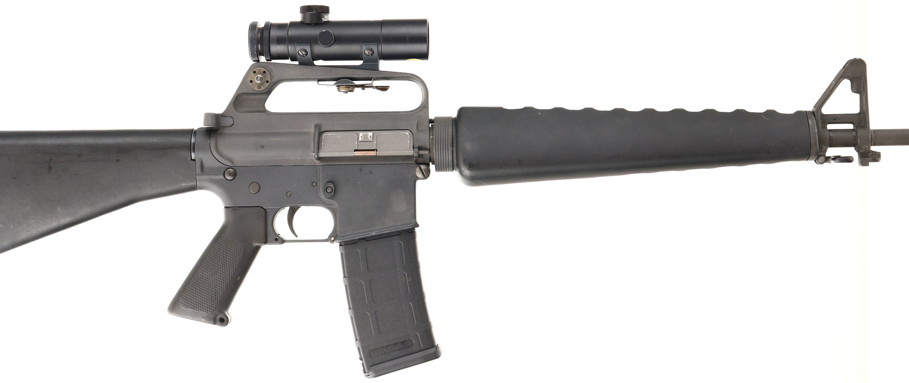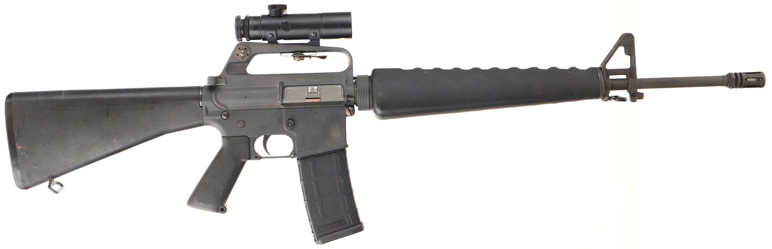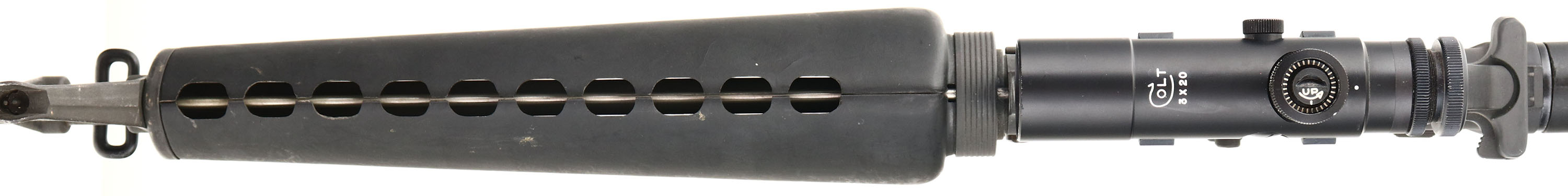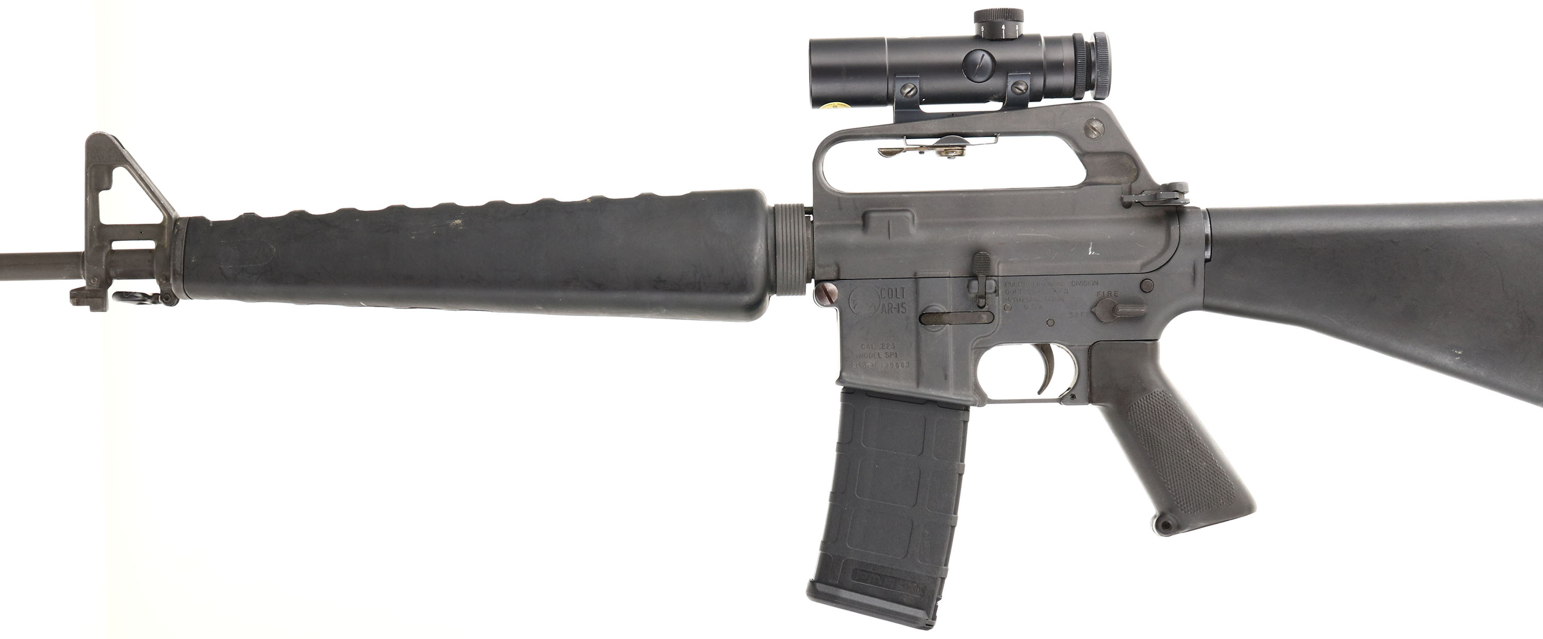 Colt, AR-15 SP1, CAL: .223, MFG: 1981, SN: SP129663, Semi Auto Rifle, 21'' barrel. The SP1 was Colts first commercial semi-auto version of the Military M-16, with distinctive triangular handguards. The synthetic fixed buttstock & forend are very good, displaying surface scuffs & light scrapes throughout from typical use. The flat military style metal finish on barrel & receiver rate at 85%, with light scuffs & scrapes. Bore is excellent & bright, with crisp rifling. The receiver carry handle/ rear sight fixture is mounted with a correct period, Japanese made, Colt marked, 3x20 scope. Rifle also carries the A1 sights. The barrel mounted with the pre-ban flash hider & bayonet lug, with the bayonet. Buttstock carries a black plastic buttplate, with integrated checkered metal trap door for cleaning kit. No magazine. Sling loops present & come with a black nylon sling. As an original Pre-ban Colt AR-15, this example is typically very desirable amongst Colt collectors & enthusiasts. FFL Req. - Value: 1500 to 3000