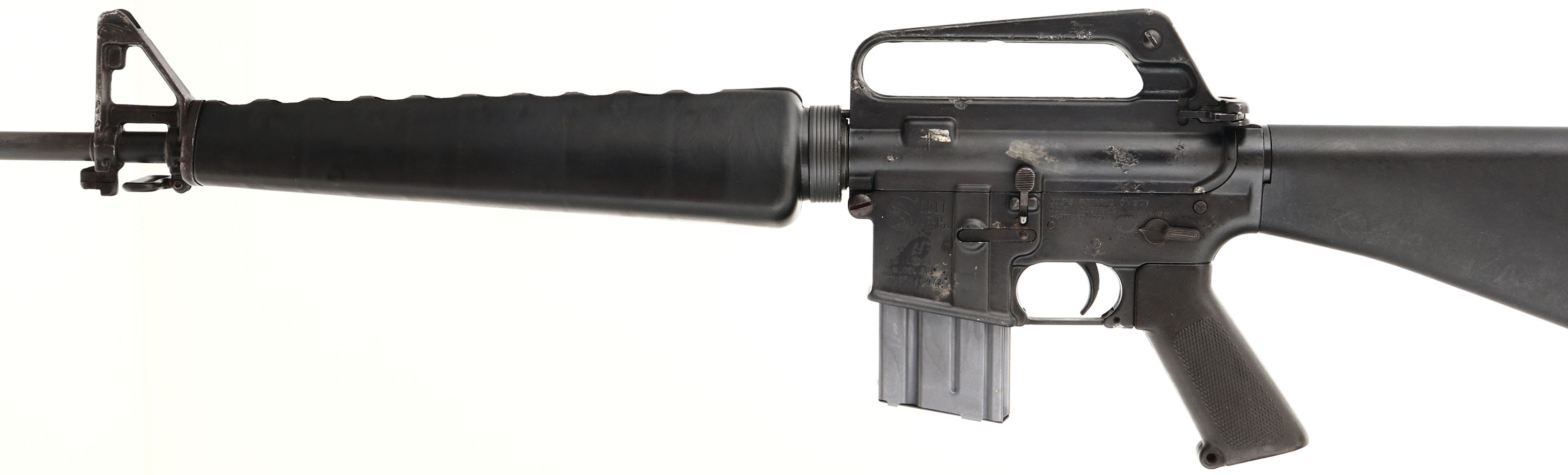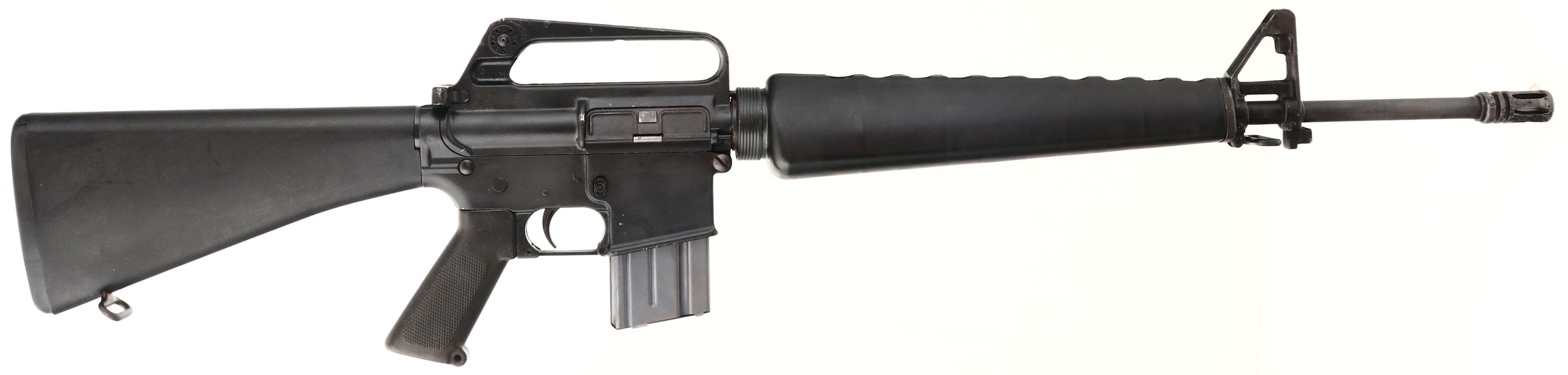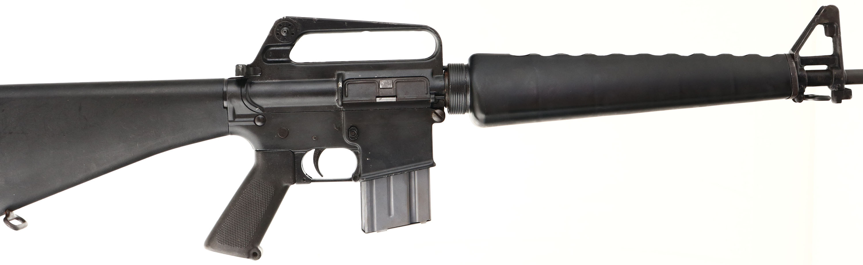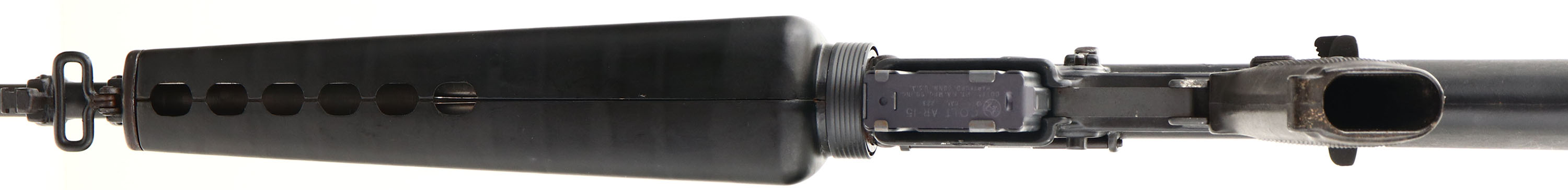 Colt, AR-15 SP1, CAL: .223, MFG: 1982, SN: SP148372, Semi Auto Rifle, 21'' barrel. The SP1 was Colts first commercial semi-auto version of the Military M-16, with distinctive triangular handguards. The synthetic fixed buttstock & forend are very good, displaying minor handling marks & scuffs. The metal surfaces have sprayed on black finish, with 70% coverage. The metal displays several areas of cleaned pitting, several nick & abrasions under the refinish, along with additional wear after the refinish. Bore is excellent & bright, with clean rifling. Rifle carries the A1 sights. Carries the pre-ban flash hider & bayonet lug. Buttstock carries a black plastic buttplate, with integral checkered metal trap-door for cleaning kit. An early Pre-ban Colt AR-15. FFL Req. - Value: 1000 to 2000