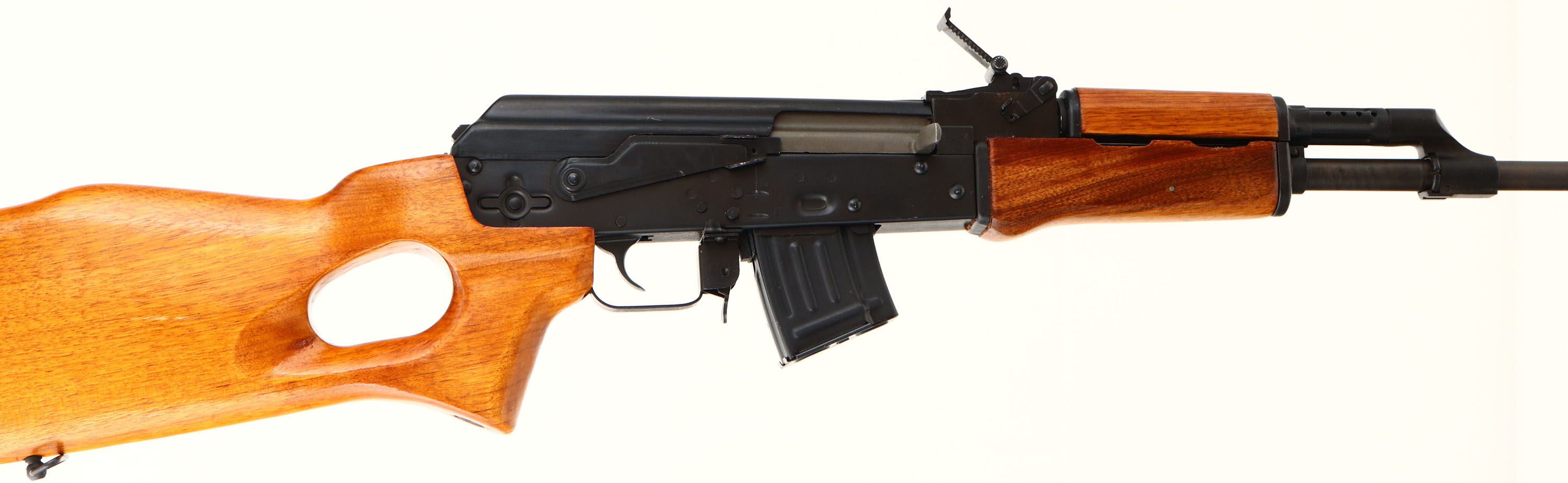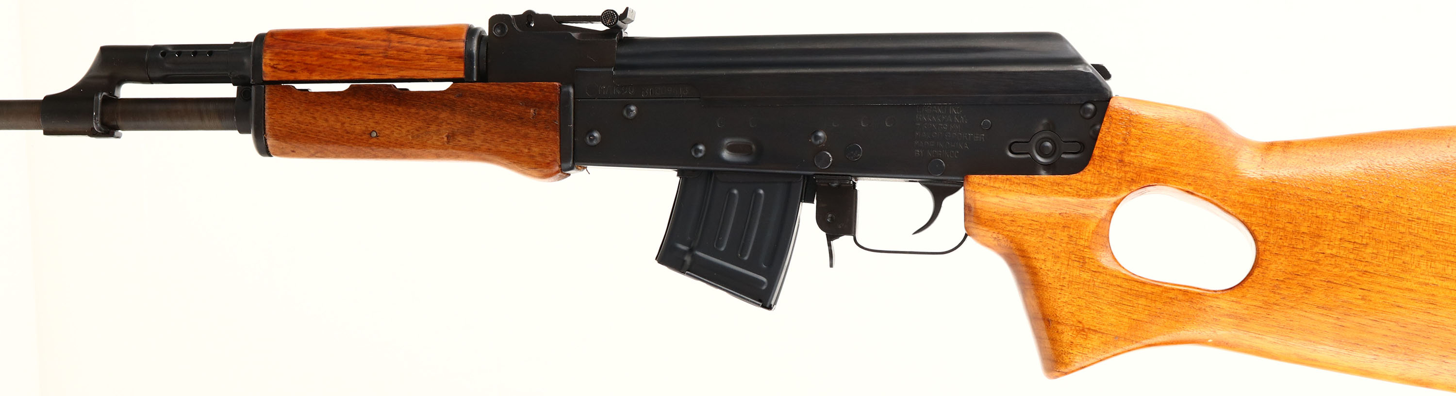 BOXED, Norinco, MAK90 Sporter, CAL: 7.62x39, MFG: 1990-94, SN: 31009413, Semi Auto Rifle, 16 3/8'' barrel. The original ambidextrous thumbhole wood stocks are excellent, with a few tiny storage contusions & scuffs. The metal finish rates 99% on the barrel & milled receiver, with minor storage blemishes. Bore is excellent, with sharp rifling. Adjustable 0 to 800 rear ramp sight & standard front sight. Buttstock carries a ventilated black rubber recoil pad. (1) Magazine. Basically, NIB in original box. A fun addition to any shooters collection. FFL Req. - Value: 800 to 1600