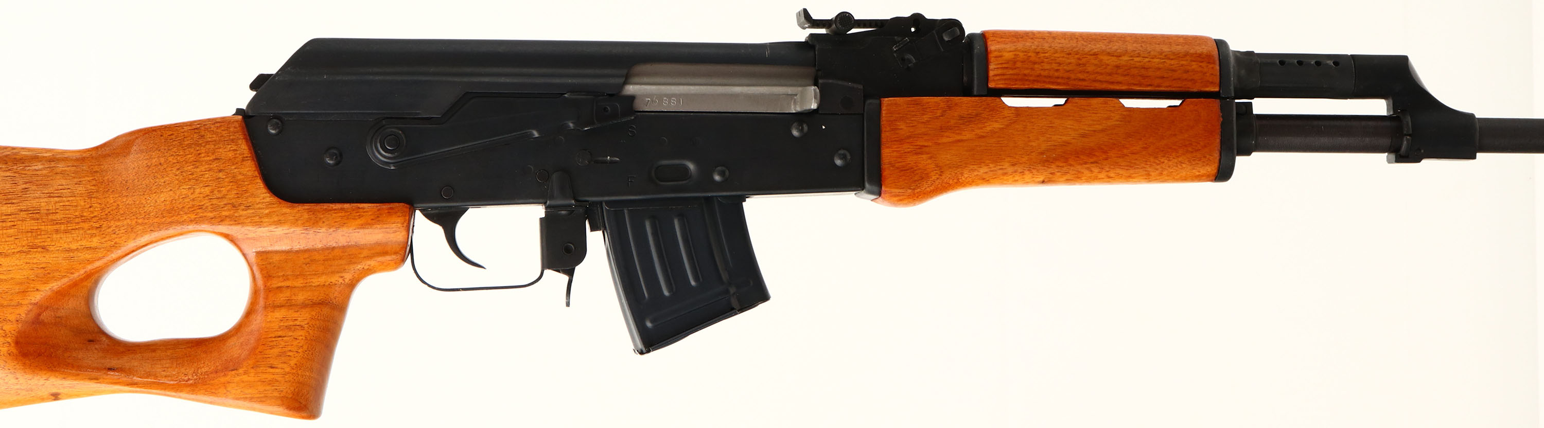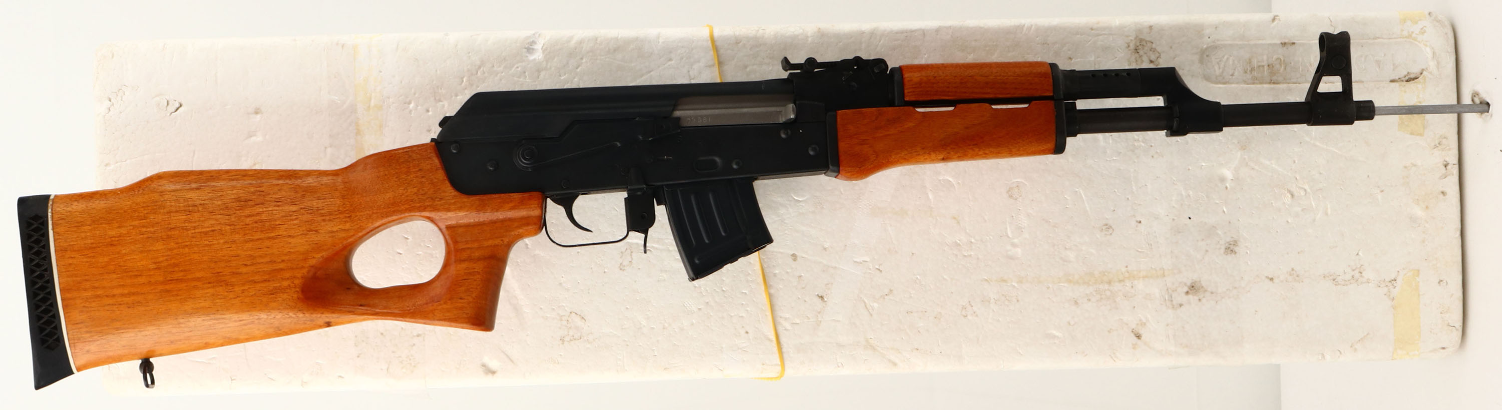 BOXED, Norinco, MAK90 Sporter, CAL: 7.62x39, MFG: 1990-94, SN: 9476881, Semi Auto Rifle, 16 3/8'' barrel. The ambidextrous thumbhole wood stocks are excellent, near mint. The metal finish rates 99% on the barrel & milled receiver, with very minor blemishes. Bore is minty. Adjustable 0 to 800 rear ramp sight & standard front sight. Buttstock carries a ventilated black rubber recoil pad. Basically NOS in original styrofoam, with (2) 10 rnd magazines, oil container, green cloth sling, cleaning rod & tool. A fun shooter in high original condition. FFL Req. - Value: 1000 to 1800