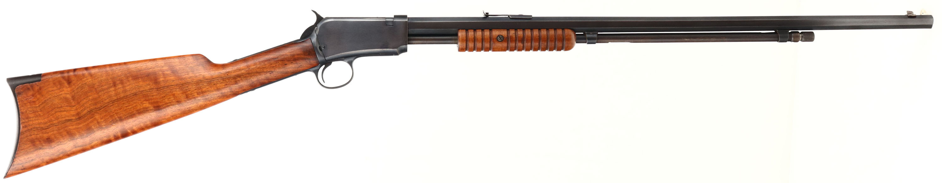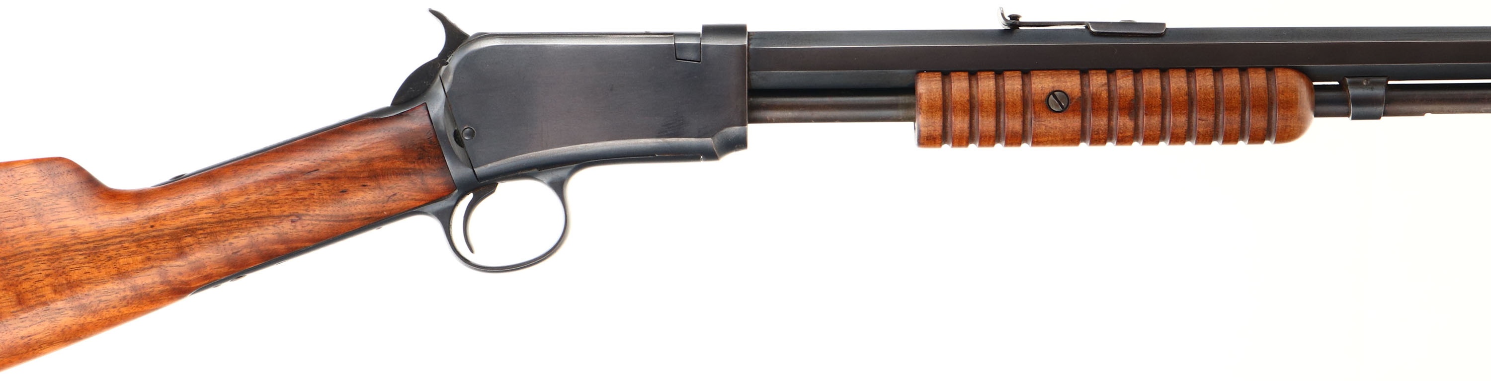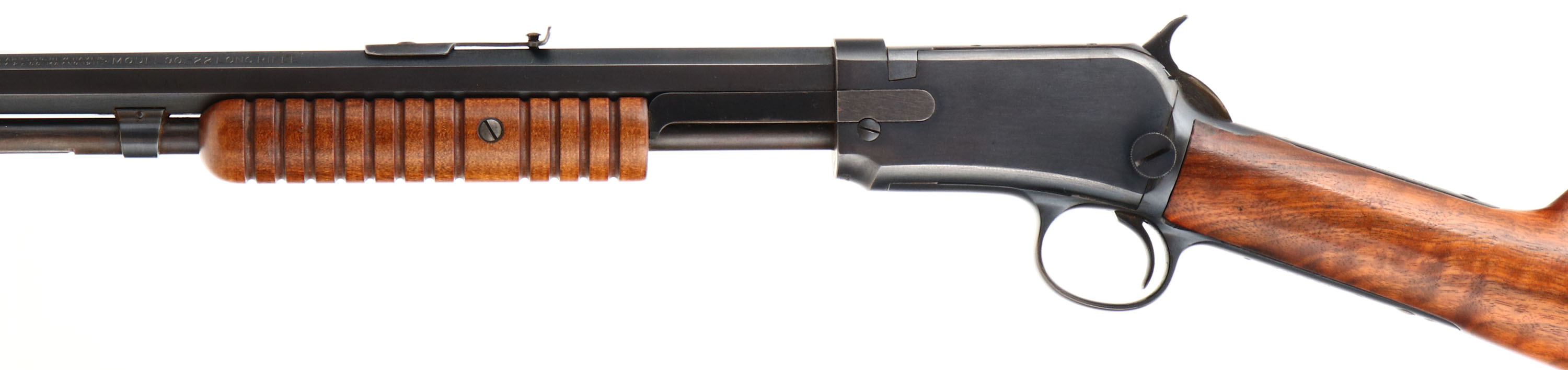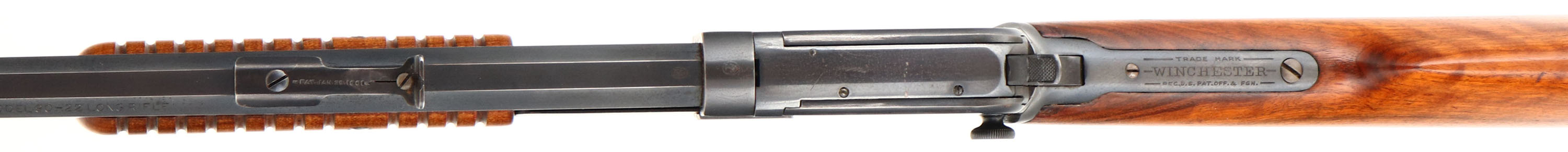 Winchester, Model 90, .22 LONG RIFLE Cal., MFG: 1916 SN: 604329, Slide Action Pump, 24'' Tapered octagon barrel. The L.R, only caliber is the rarest & most desired caliber amongst collectors as only 10% of total production were this caliber. The original wood is excellent & solid. The original finish is excellent, with a few very tiny finish level handling marks. The stock displays fantastic wavy grain. The original metal blued finish is 98% on the barrel, 95% on the receiver, & 80% on the mag tube. Bore is excellent. Barrel carries the original front & rear sights, Factory crescent steel buttplate, Excellent original example of a single caliber 90 remaining in very high collectible condition.* FFL or C&R Req. - Value: 3500 to 5000
