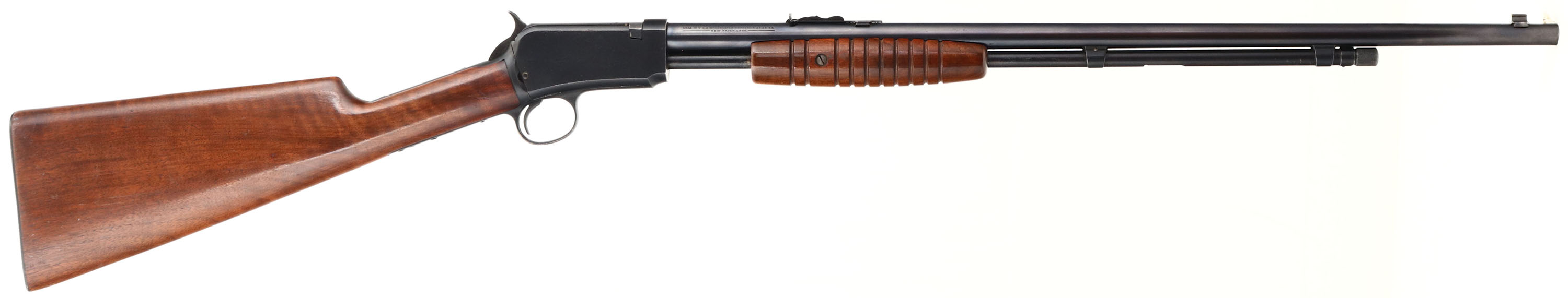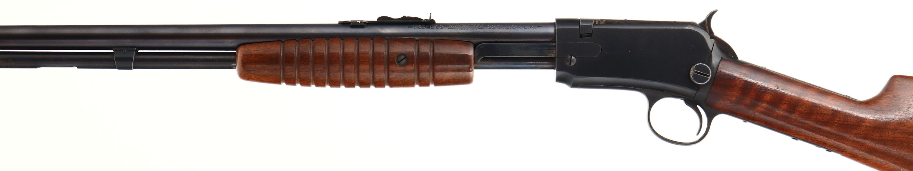 Winchester, Model 62, CAL: 22 S.L.LR, MFG: 1932, SN: 8408, Pump Action Rifle, 23 1/8'' round barrel. 1st yr production, with the early production cigar style forearm. The original straight grip wood stocks are excellent, with excellent finish. The orignal metal blue finish rates 98% overall. Bore is excellent. The barrel holds a standard adjustable rear sight & blade front sight. Buttstock carries the original, checkered metal buttplate. An excellent, all original collectible example.* FFL or C&R Req. - Value: 2000 to 3500