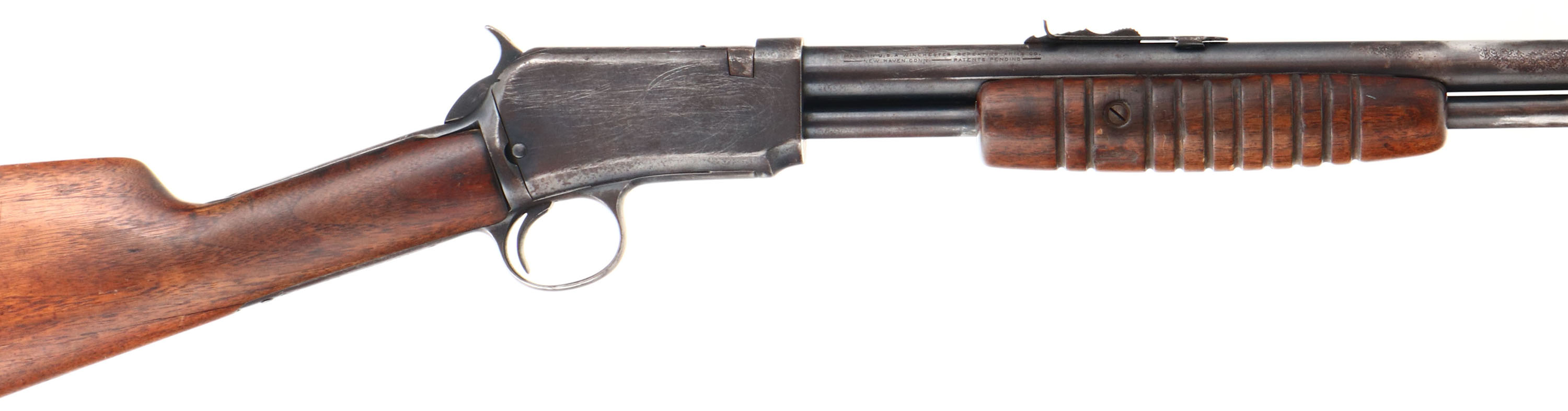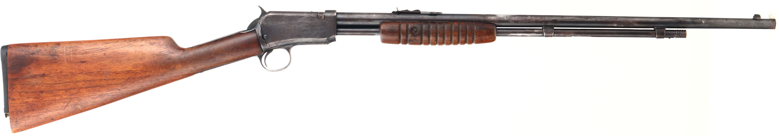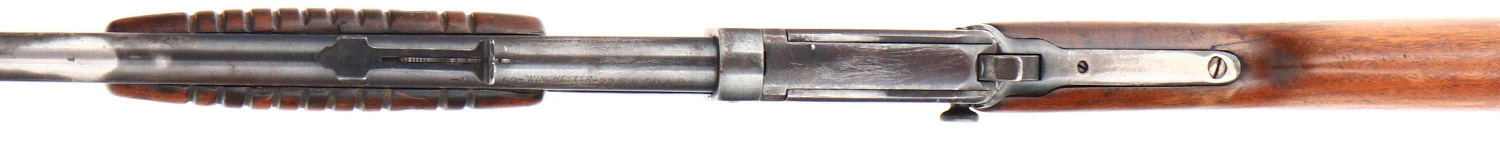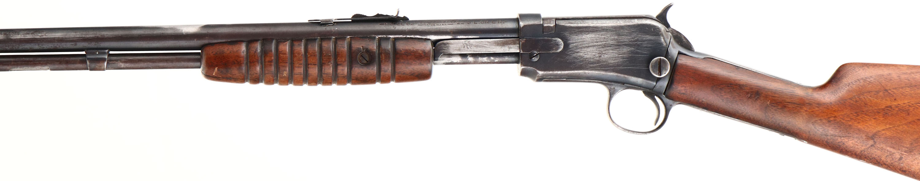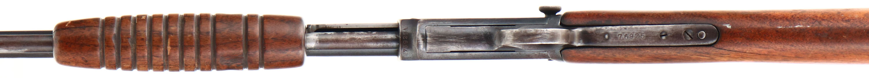Winchester, Model 62, .22 S. L. or L.R. Cal., MFG: 1938, SN: 76925, Pump Action Rifle, 23'' round tapered barrel. The original straight grip wood stocks are fair, with a 2'' crack emanating from the lower tang, which causes the stock to fit a bit loose. The forearm also has a 2'' grain crack & a couple of small gouges. The stocks carry the original finish, having wore thin & have minor scratches & contusions. The metal blue on the barrel rates 50% & 30% on receiver. The metal has areas rust pitting, cleaned pitting & scrub brush marks. The mag tube has several contusions & abrasions. The mag tube inner appears to be a replacement. Bore is clean & bright, but has a ring about mid barrel. Rifle fitted with standard sights. Stock carries a replaced plastic buttplate, with the bottom toe to screw missing. FFL or C&R Req. - Value: 200 to 400