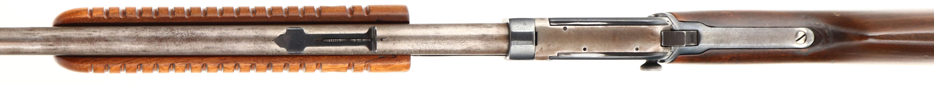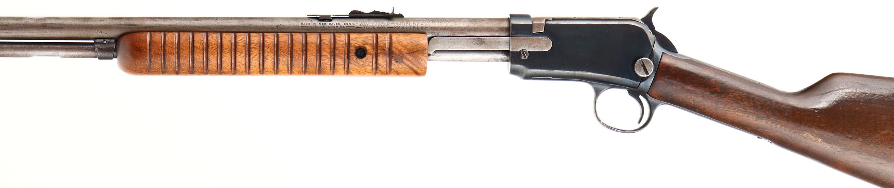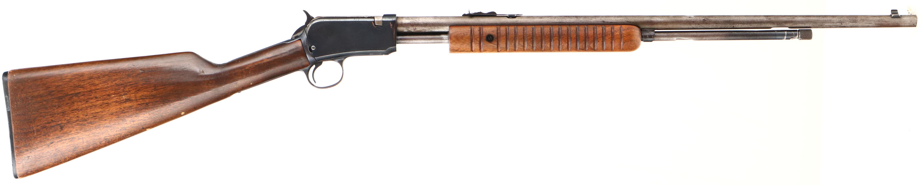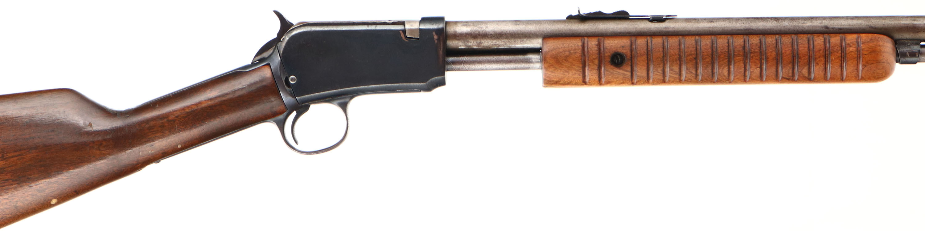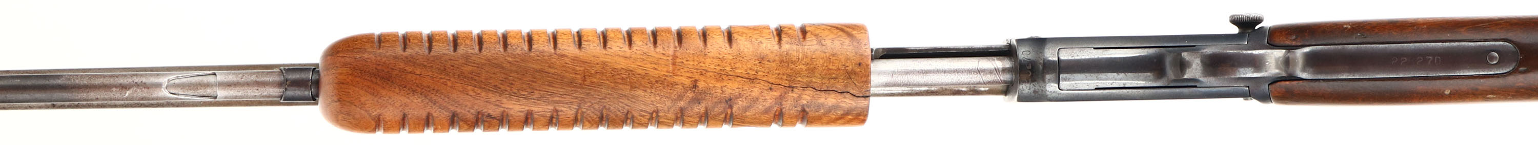 Winchester, Model 62A, .22 S. L. or L.R. Cal., MFG: 1948, SN: 228270, Pump Action Rifle, 23'' round tapered barrel. Areas of this rifle have been touched up or refinished. The original straight grip wood stocks are very good & solid, having been refinished. The forearm has tight 3'' & 2'' cracks. Stocks also display light scratches or scuffs. The metal blue on the receiver has been refinished, with areas of light pitting under the restored blue. Bore is very good. Rifle fitted with standard rear & front sights. Stock carries a Winchester plastic buttplate. The outer magazine tube appears to be a replacement as it has the gallery short wider triangle loading opening. It also is missing the front dovetailed mag tube hanger. Nice overall appearance. FFL or C&R Req. - Value: 200 to 400