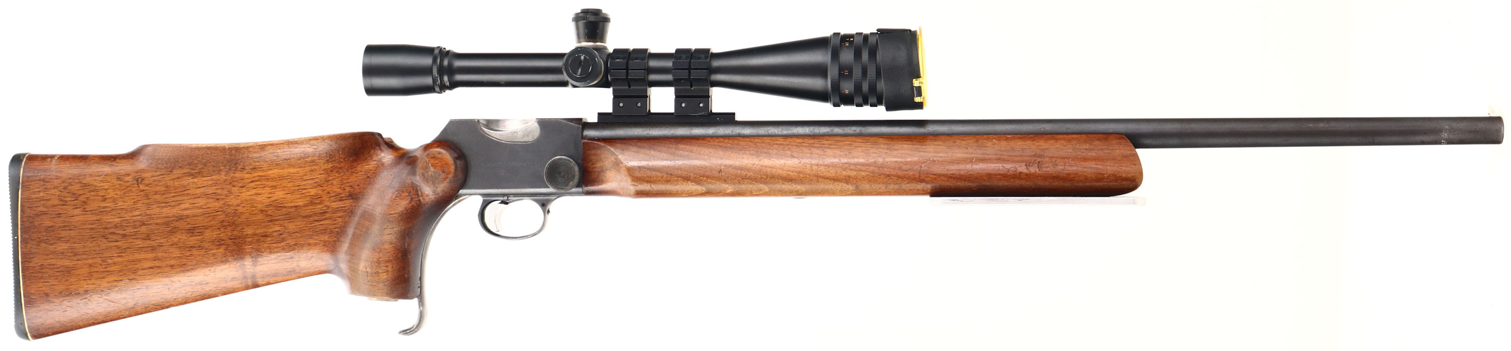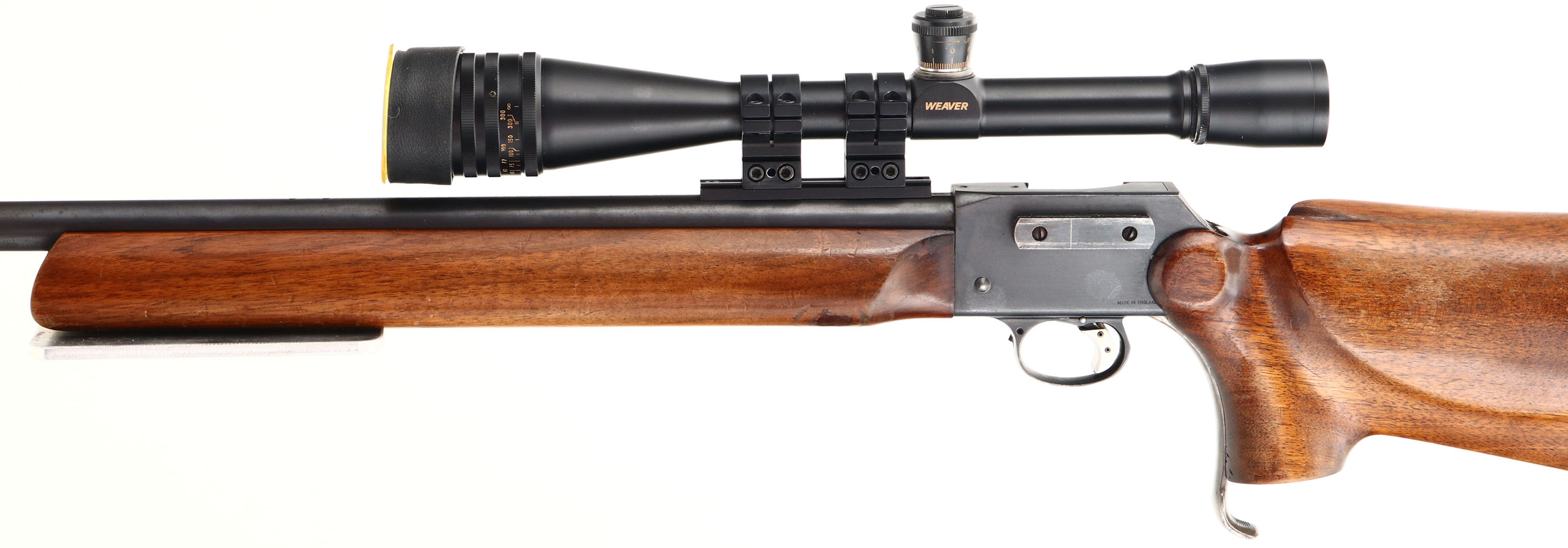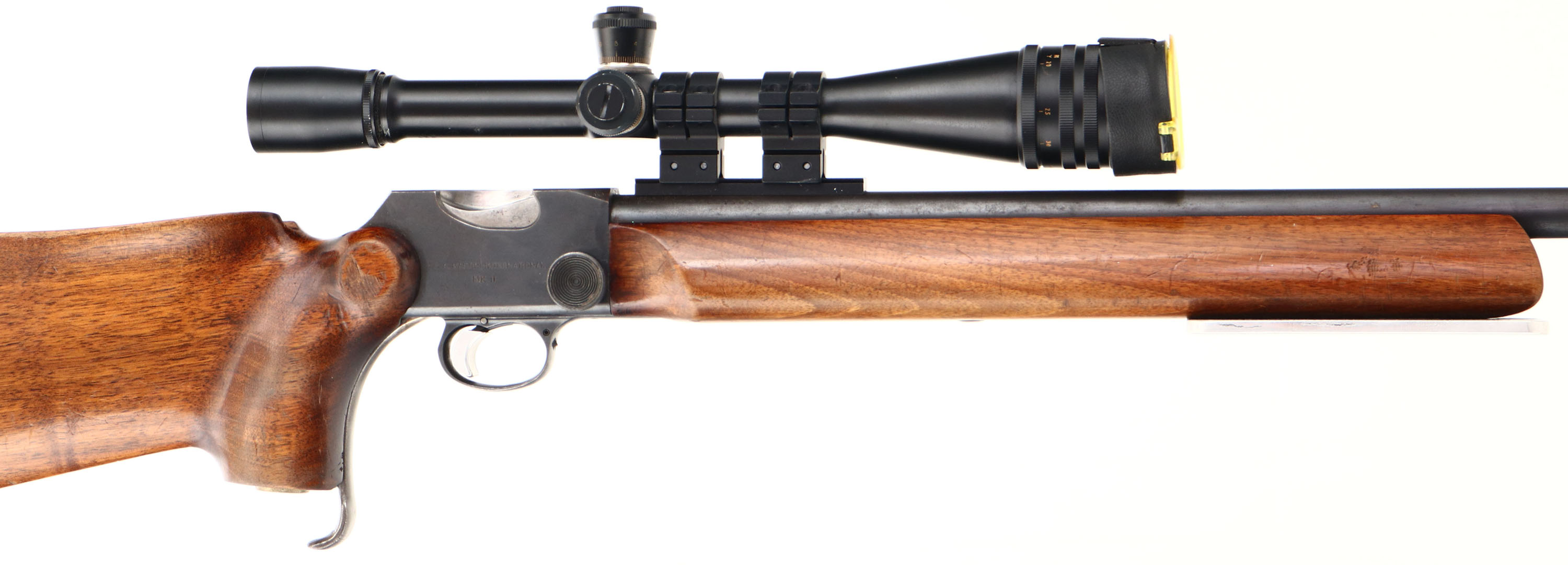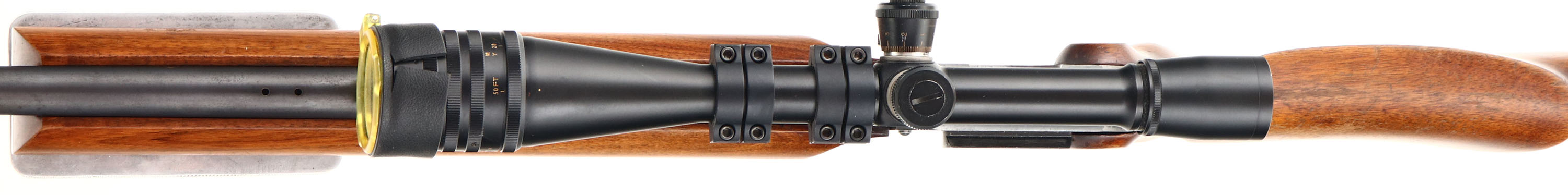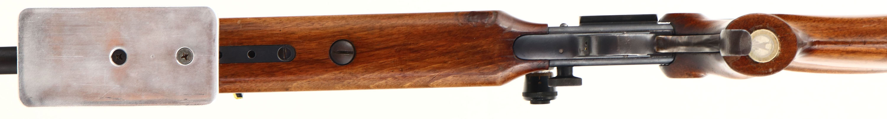 BSA, Martini - International, Model MK II, CAL: .22 LR, MFG: 1953-61, SN: FC2136X, Made in England, Martini action single shot rifle. 25'' Round barrel. Left side of barrel & receiver are marked with several British proofs. The original cheeked & flat pistol grip stocks are very good, with the original finish. There are numerous scratches, scrapes & contusions, but with no visible cracks. There is a small missing chip on the bottom edge of the pistol grip. There is also a 2'' groove cut in the top of the cheek behind the receiver. There is a small gouge on the left side of the forend which has some fill. There is a 2002 coin with an eagle * stars on it which is glued to the flat of the pistol grip. Barrel & receiver retain 90% original blue overall. The barrel carries a Weaver 36X Scope & rings mounted on a scope bar. There are four additional open holes in the barrel (2 in middle & 2 at muzzle) & two more atop the receiver from a previous scope mounting. There is also a mounting block located on the left side of the receiver. Bore is excellent. There is a 6''x3'' flat metal bar mounted on the belly of the forend for bench shooting. Factory BSA marked buttplate. Trigger has a ''trigger shoe'' mounted on it to give additional width. A fairly rare target rifle as only 3,390 were produced. FFL or C&R Req. - Value: 600 to 1200