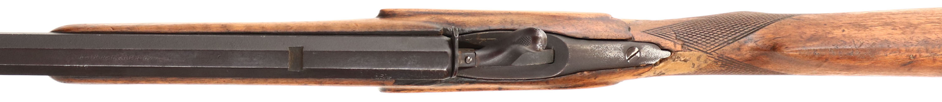 National Arms Co, Flobert Rifle, CAL: 22 Flobert, MFG: Antique, SN: N/A, Belgian Breech Loading Single Shot, 22 1/2'' barrel. The original checkered round knob pistol grip wood stock has multiple breaks, cracks & a fairly crude putty filled repair at the wrist. The stock has worn most of the finish away & has numerous other scratches, scrapes & contusions. The metal has entirely toned to a brown patina. Bore is dark, with roughness amongst worn rifling. The barrel has a open rear dovetail & holds a small blade front sight. Buttstock carries a smooth metal buttplate. Antique, No FFL Req. - Value: 80 to 150
