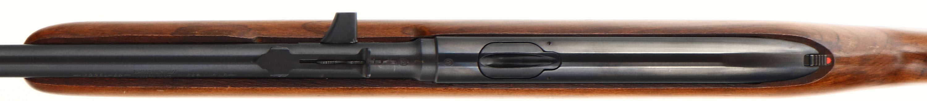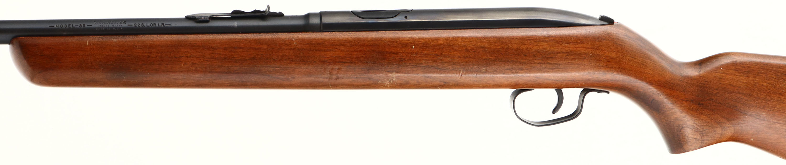 Winchester, Model 55, CAL: .22 S,L,LR, MFG: 1957-61, SN: None, Marketing as the Self Loading Single Shot Auto Ejecting Rifle, 21 3/4'' round barrel. The original flat pistol grip wood stock is excellent, displaying several minor finish level scuff & tiny contusions the original finish. The original metal blue finish is 97%, with minor blemishes. Bore is excellent. The barrel holds an adjustable rear sight & blade front sight. Stock carries a Winchester checkered buttplate. Only 45,000 produced. A very nice & fairly rare Winchester .22. FFL or C&R Req. - Value: 300 to 600