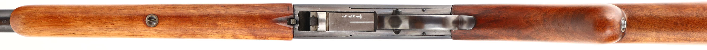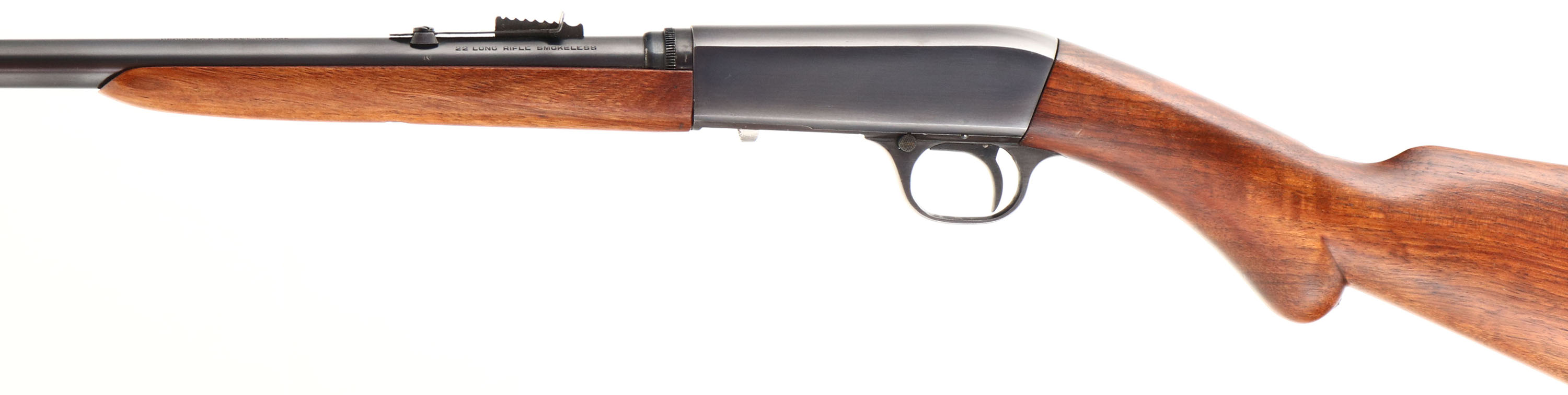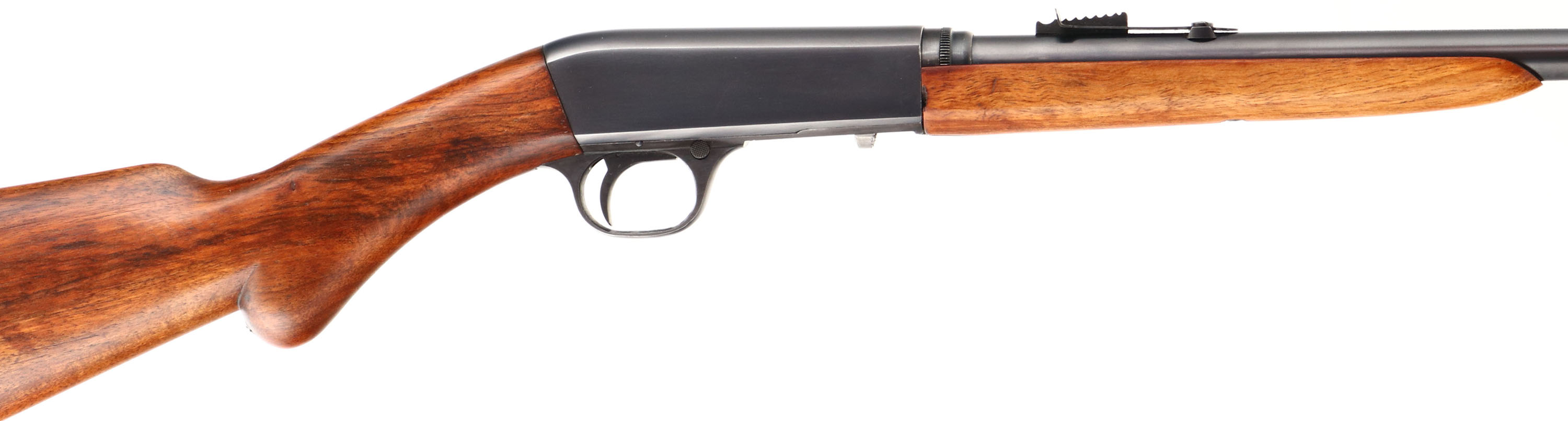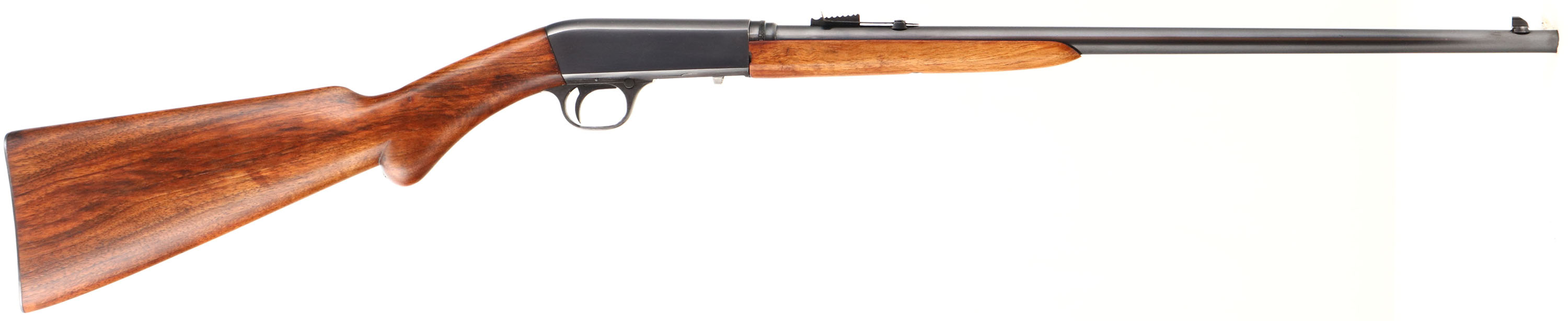 RARE FN Herstal (Browning Patent) Model Semi-Auto .22 Top Loader, CAL: .22 LR, MFG: 1937 (Belgium), SN: 28332T37, Semi Auto Take-down Rifle, 19 1/2'' round barrel. This is generally recognized as the first semi-auto .22 LR produced. Invented by John M. Browning, FN began production in 1914. The rifle was sold around the world, but not in the U.S. because Browning retained the patent rights for the U.S. market & a version of the rifle as a side loader was produced by Remington as the Model 24 & later the 241. Remington ceased production of the 241 at the Ilion, New York plant in 1949. FN first began exporting the Browning SA-22 to the US in 1956, after the expiration of the Remington manufacturing rights. The FN top loader was therefore the predecessor to the Browning SA-22 side loader most of us recognize today. This rifle is therefore one of the early rare predecessors which while not imported into the U.S., somehow made it here. The original round pistol grip Walnut stocks are excellent, with only a couple of tiny storage scuff to the excellent finish. The metal blue finish rates 98% overall. Fitted with the original adjustable rear & small blade front sights. Bore is excellent. The stock carries a metal buttplate. A rare