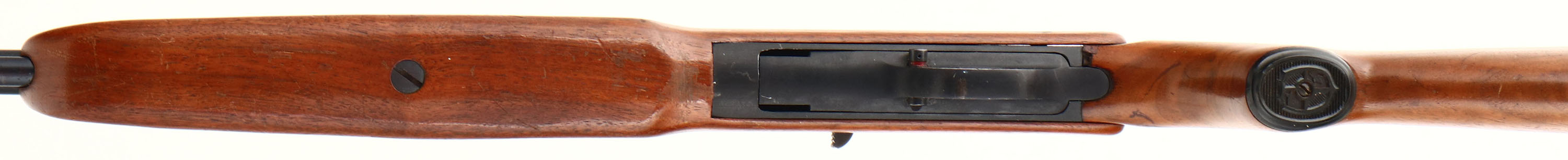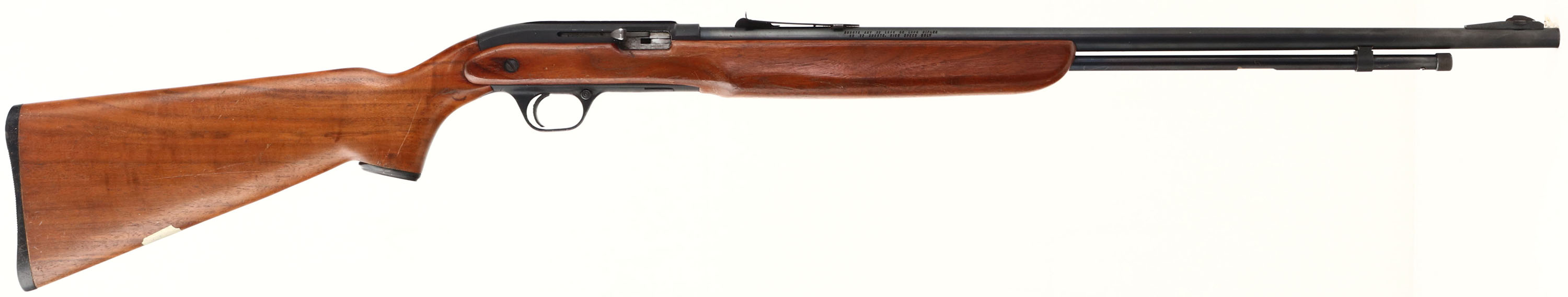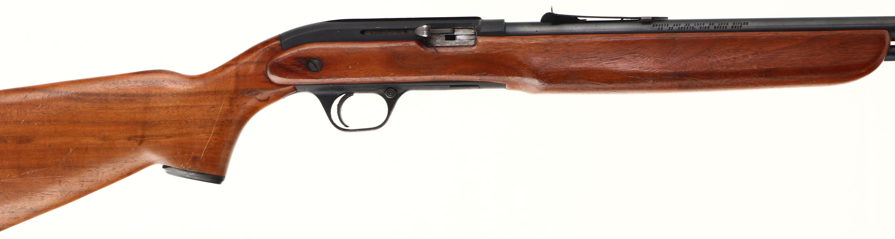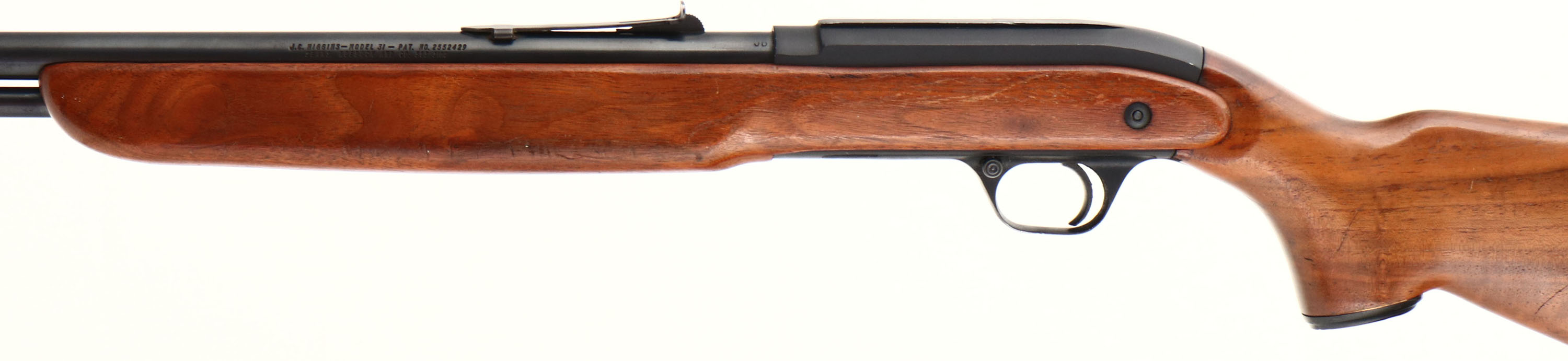 J.C Higgins, Model 31, CAL: 22 S,L,LR, MFG: 1953-57, SN: NONE, Semi Auto Rifle, 24'' barrel. The unique, capped pistol grip & two piece stocks are excellent & original. They displaying minor scratches & scrapes to the original finish. The belly of the stock has a blank silver nameplate. The metal blue finish on the barrel & tube rates 95% overall, with minor scuffs & blemishes. The matte black finish on the receiver rates 97%, with edge wear on the scope mount grooves. Bore is excellent & bright. The barrel holds an adjustable rear sight & ramp elevated blade front sight. Stock carries a JCH grooved plastic buttplate. FFL or C&R Req. - Value: 200 to 400