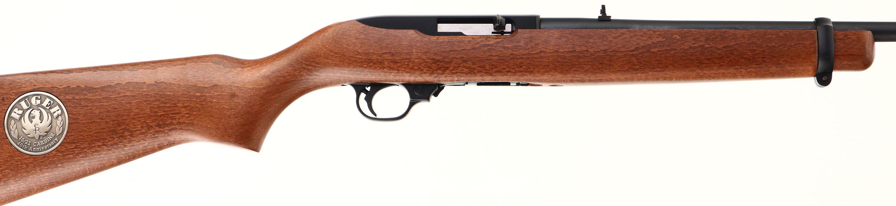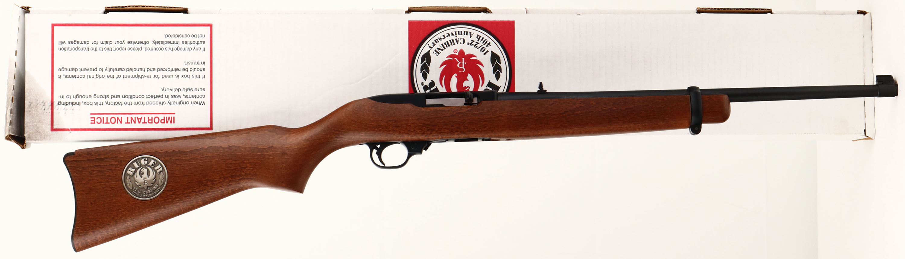 BOXED, Ruger, Model 10/22 Carbine 40th Anniversary Edition, CAL: 22LR, MFG: 2004, SN: 256-54268, Semi Auto Rifle, 18 1/2'' barrel. The flat pistol grip wood stock & finish is excellent & minty. The right side of the stock displays an inlaid silver medallion, labeled ''Ruger (Logo) 10/22 Carbine 40th Anniversary''. The metal blue finish rates 99%+. Bore is excellent & bright, with crisp rifling. The barrel holds a standard folding leaf rear sight & blade front sight. Buttstock carries a smooth metal buttplate Comes in original box, with 40th Annv. clear magazine, owners manual & lock. FFL Req. - Value: 300 to 600