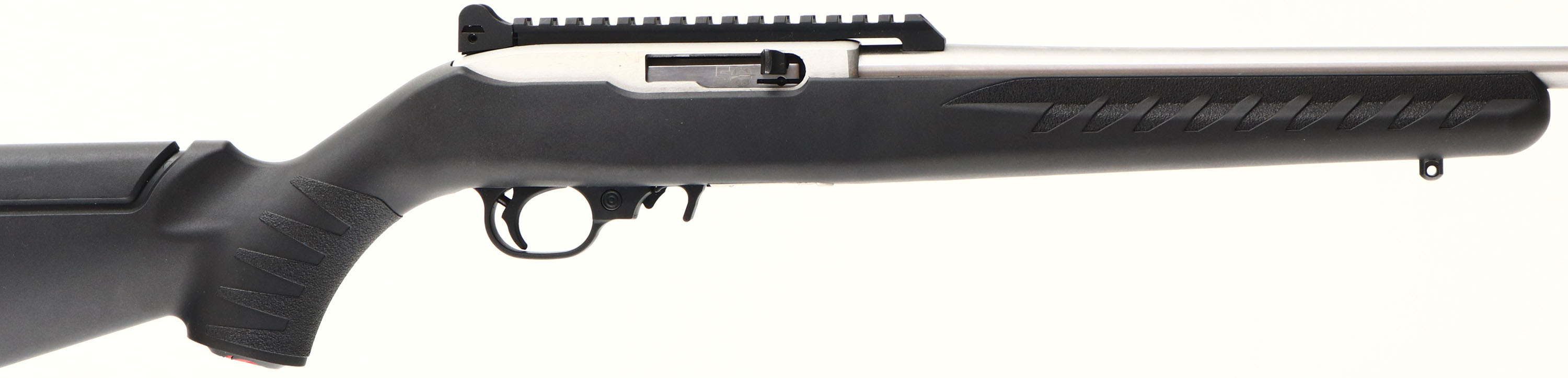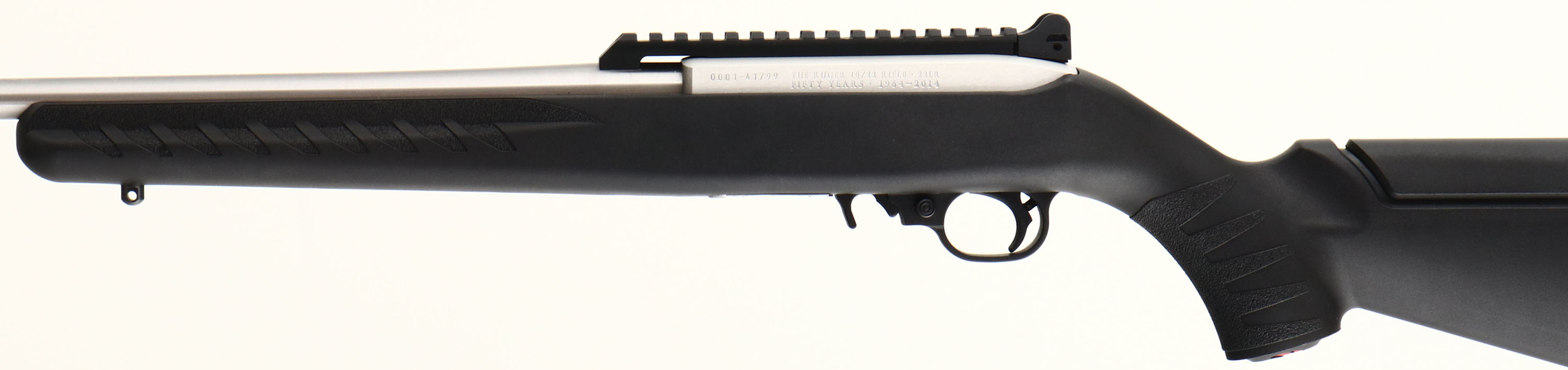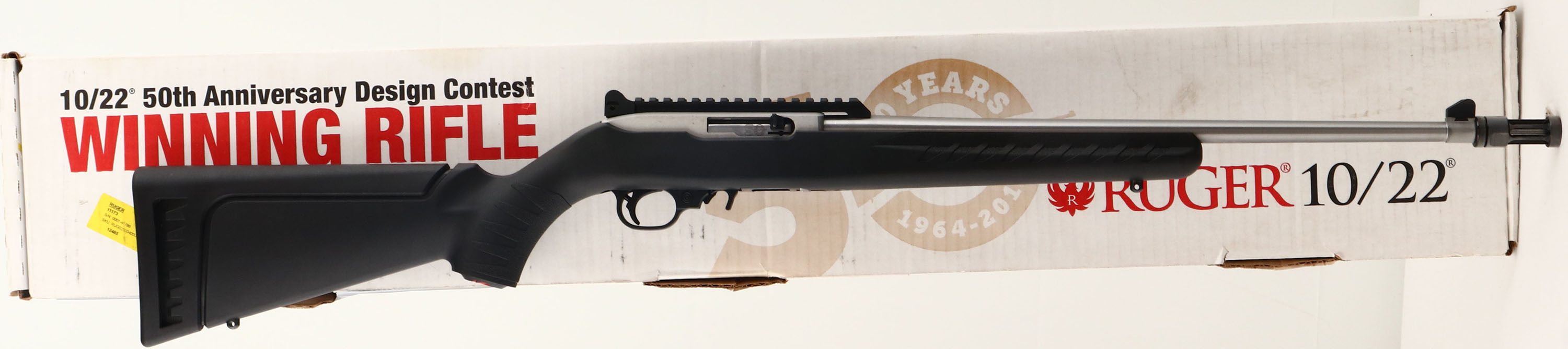 BOXED, Ruger, Model 10/22 Carbine 50 Year Anniversary Edition, CAL: 22LR, MFG: 2014, SN: 0001-41799, Semi Auto Rifle, 18 1/2'' barrel. The textured & grooved synthetic black stock is excellent. The high polish stainless finish on the barrel is excellent & bright. The satin silver finish on the receiver is excellent. Bore is mint. The receiver holds a small peep rear sight & the barrel has a walled blade front sight. The receiver also has a 6 1/4'' picatinny rail, great for optics or accessories. Comes in original box, with original packaging, extra stock piece, owners manual, metal sign, lock, & other paper articles. FFL Req. - Value: 250 to 450