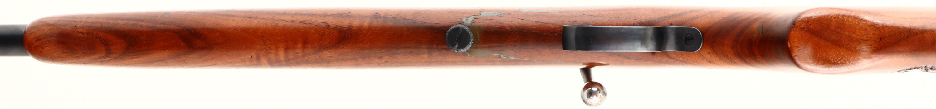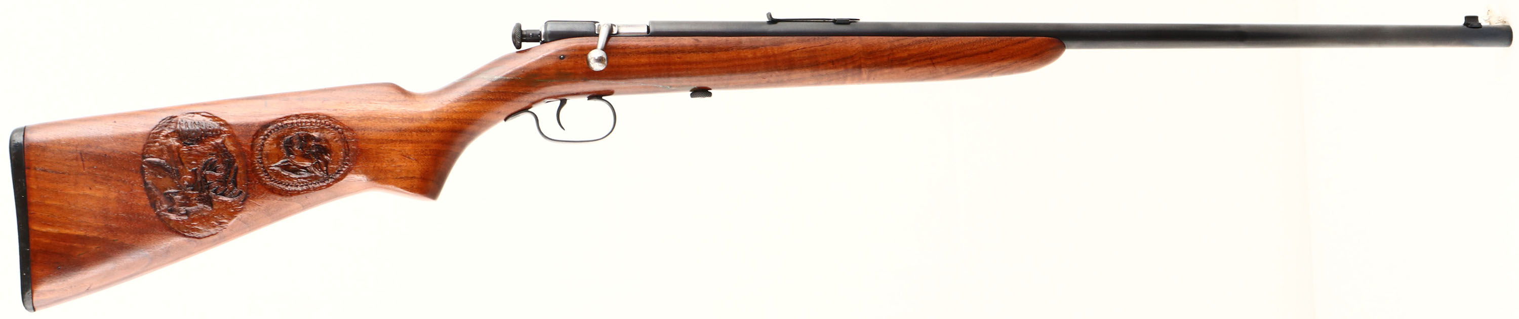 Winchester, Model 60, CAL: 22 S,L,LR, MFG: 1931-34, SN: NONE, Bolt Action Rifle, 23'' barrel. This gun has been nicely refinished. The flat pistol grip wood stock is very good & solid, after a well repaired full break. The stock has been nicely carved on the right side of stock with vignettes of a wooded elk scene & a cougar head. The stock was then refinished, displaying minor handling marks. The metal blue finish rates 95%. Bore is clean & bright, but with barrel bulge 7 1/2'' below the muzzle. The barrel holds an adjustable rear sight (missing elevator) & blade front sight. Stock carries a worn Winchester checkered buttplate. FFL or C&R Req. - Value: 100 to 300