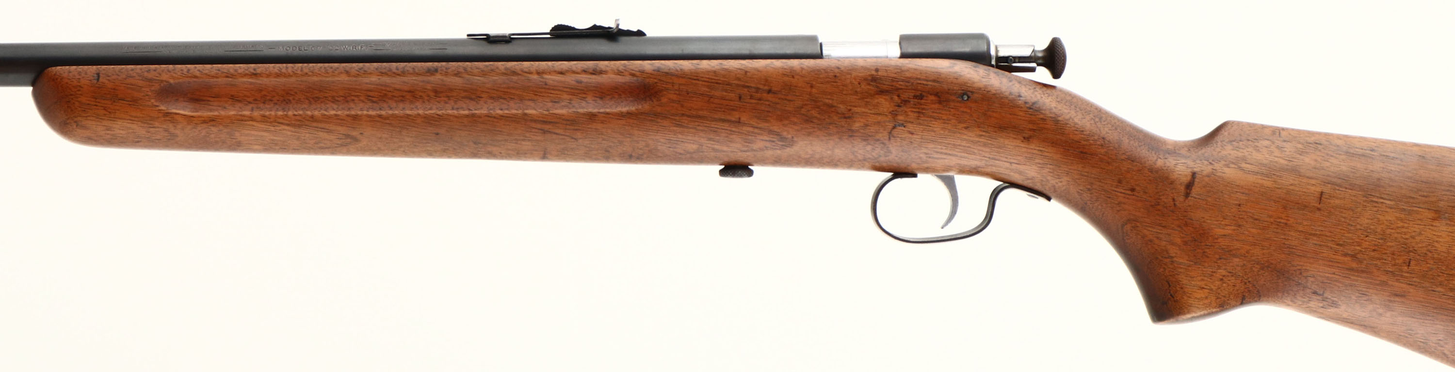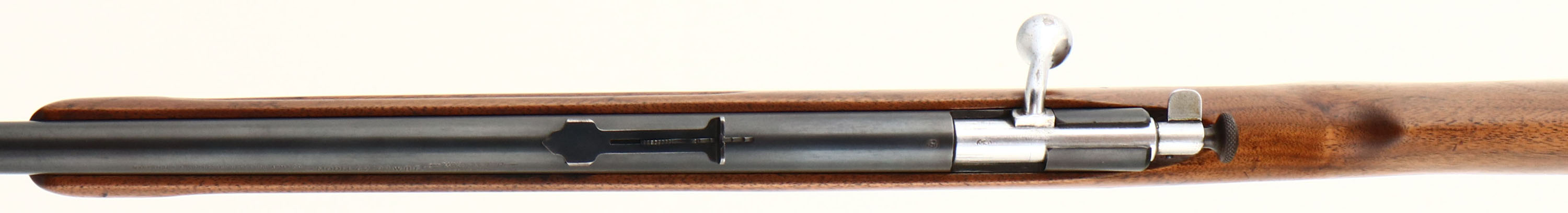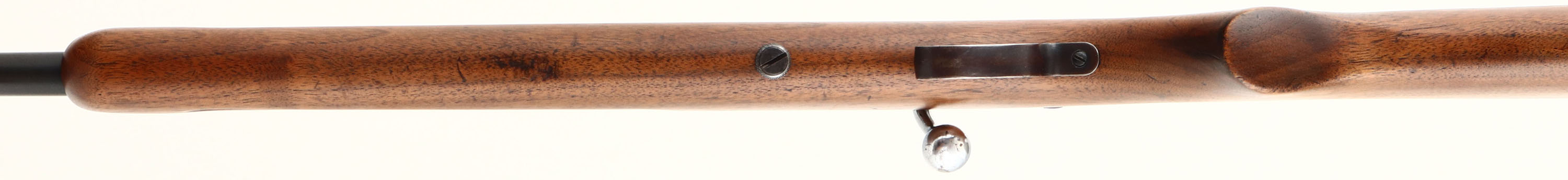 RARE Winchester, Model 67 Sporting Variation, CAL: 22 W.R.F. MFG: 1935-39, SN: N/A, Take-down Bolt Action Rifle, 27 1/8'' Sporting tapered barrel. Only 6,741 model 67 rifles were produced in WRF caliber. This is an early 1st issue with the slim, grooved forend, nickeled trigger & raised take-down screw. It also has the early bolt retaining spring wire at the left of the receiver which was from rifles only produced in 1934-39. The original flat pistol grip wood stock is excellent, as being lightly sanded & nicely refinished. There are the remnants of numerous tiny handling marks under the finish. The restored metal blue finish is excellent at 97% overall. The barrel holds an adjustable rear & blade front sight. Bore is excellent. Buttstock carries a Winchester checkered black plastic buttplate. A very nice appearance on this early production Sporting model. FFL or C&R Req. - Value: 300 to 600
