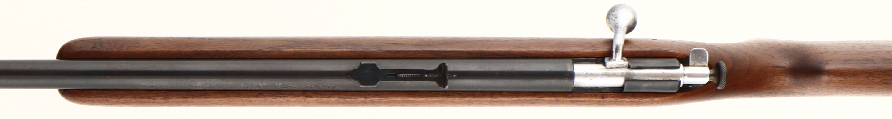 RARE Winchester, Model 67A SMOOTH BORE, .22 L & LR SMOOTH BORE Cal., MFG. 1937-63, SN: None, Take-down Bolt Action Rifle, 27'' Tapered round barrel, Sporting model, Marked SMOOTH BORE on left side of barrel. The factory flat pistol grip wood stock is excellent, having been lightly sanded & professionally refinished. The forend tip has a tightly repaired 1'' grain crack. The finish is excellent, with very few tiny handling marks & an overall excellent appearance. The metal finish is 90%, toning gray/blue as it thins. Bore is excellent. Mounted with original factory sights. Winchester plastic buttplate. A rare smooth bore example, with an excellent appearance. FFL or C&R Req. - Value: 500 to 1000
