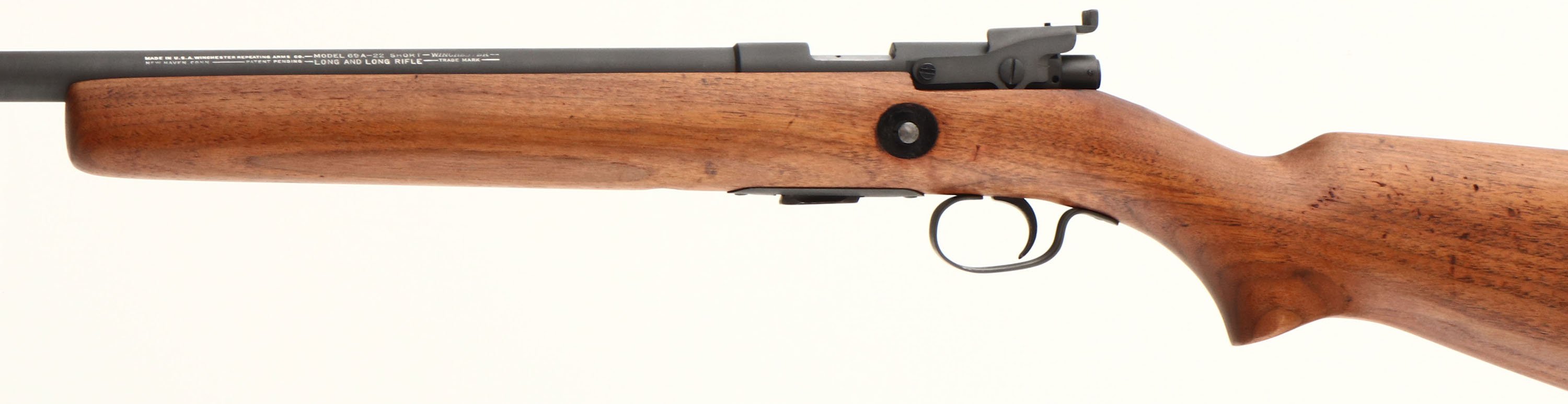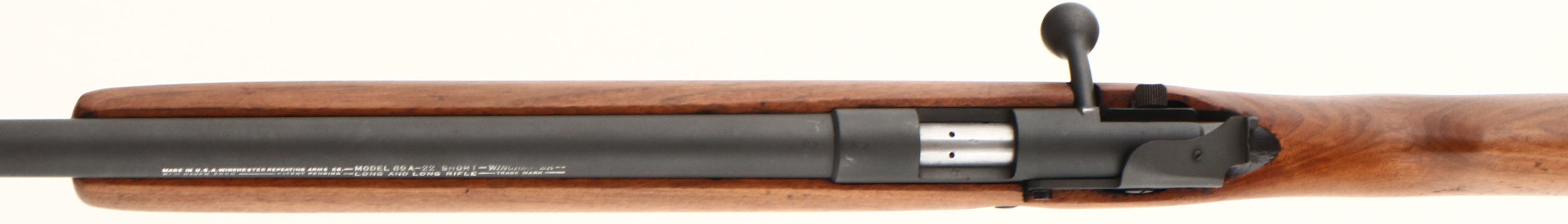 Winchester, Model 69-A, CAL: 22 SHORT, LONG & LONG RIFLE, MFG: 1935-63, SN: N/A, Bolt Action Rifle, 25'' barrel. The original flat pistol grip wood stock is excellent & solid, having been lightly sanded & nicely refinished. There are several small scrapes, scratches & light contusions remaining. The wood has an overall excellent appearance. The metal has been refinished with a modern flat gray finish which is excellent. Bore is very good. The receiver holds a height adjustable dovetail sight, while the barrel holds an updated front blade sight. Buttstock carries a Winchester checkered black plastic buttplate, with a couple of small chips along the upper edge. Comes with a single shot dummy detachable mag. Excellent overall appearance. FFL or C&R Req. - Value: 200 to 400