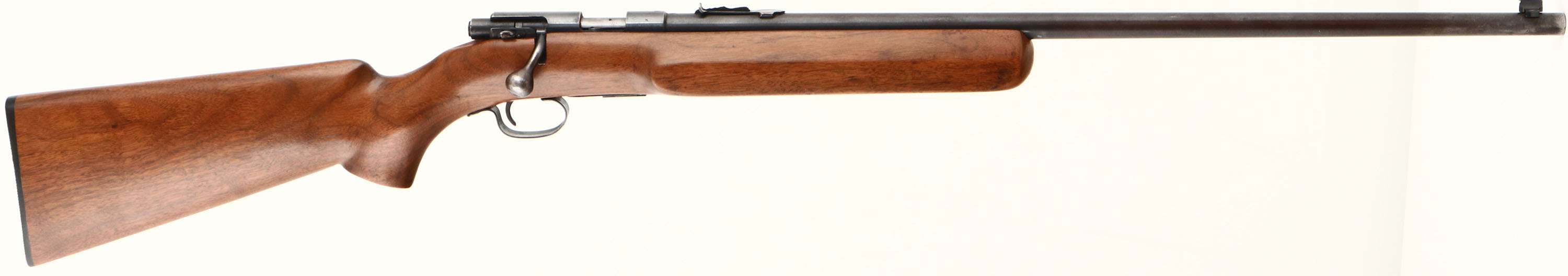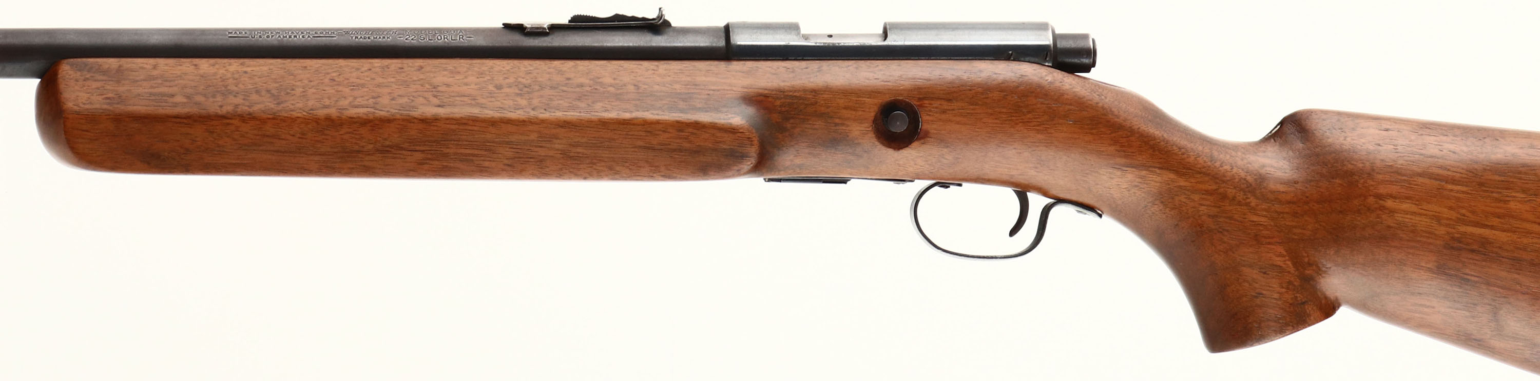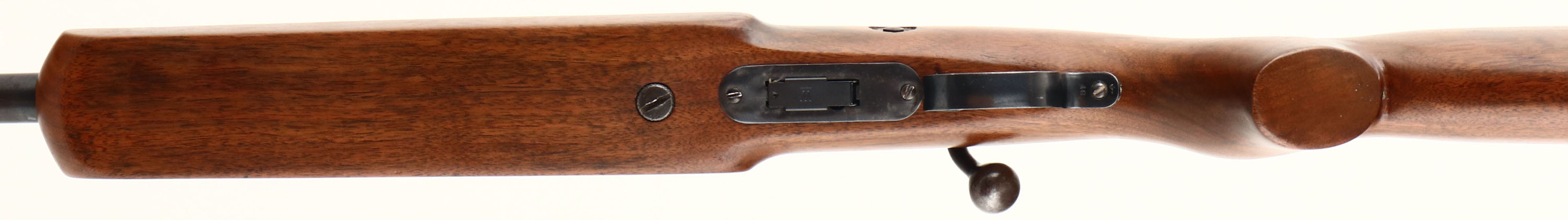 Winchester, Model 69-A, CAL: 22 S.L. or LR, MFG: 1935-63, SN: N/A, Bolt Action Rifle, 25'' barrel. The rifle carries a fantastic custom built bench or target style stock that fits like a factory stock. The flat pistol grip has a slight off-right setup, while the forearm has a wide flat side panel design. Finish & appearance is excellent, with very few light handling marks. The metal blue finish rates 90% on the barrel, 80% on barrel, with the barrel finish toning a gray/brown. Both receiver & barrel has some light pitting or speckling. Bore has good rifling, but there is a ring/bulge in the barrel 3 1/2'' from muzzle end, shouldn't affect accuracy much on a barrel of this length. The barrel holds a standard adjustable rear & an updated blade front sight. Buttstock carries a Winchester, checkered black plastic buttplate. ''W'' stamped detachable mag. FFL or C&R Req. - Value: 150 to 300