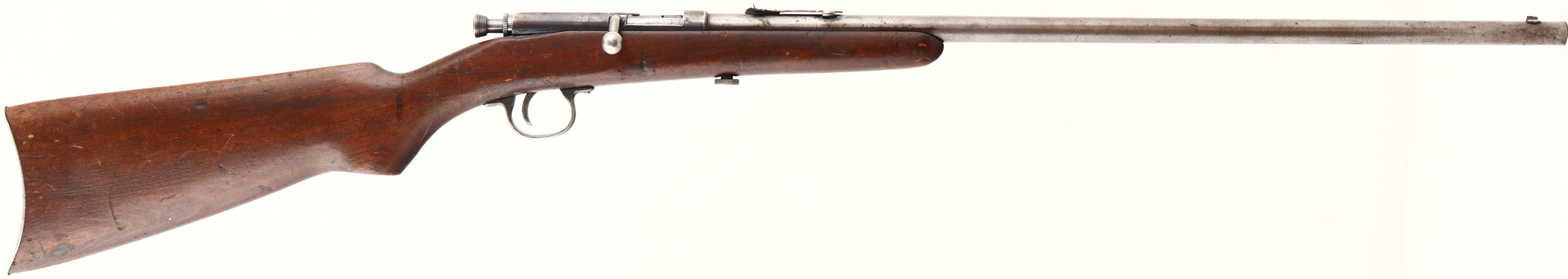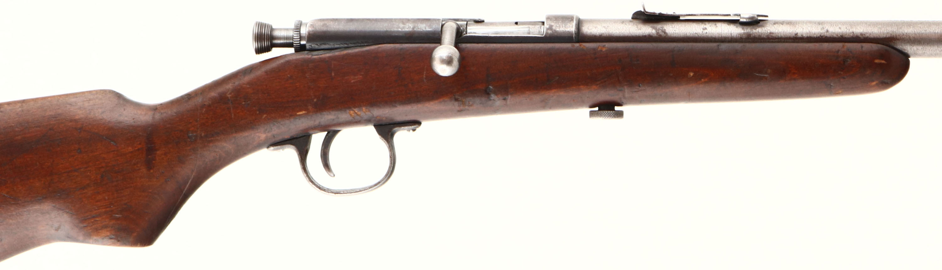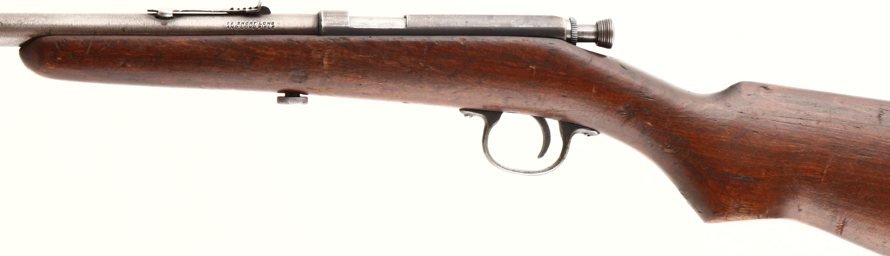 Mossberg, Single Shot, CAL: 22 S,L,LR, MFG: N/A, SN: NONE, Bolt Action Rifle, 22'' barrel. The flat pistol grip wood stock is good & solid, displaying numerous contusions, scrapes & scratches to the original finish. The is a sliver of wood missing along the upper edge under the bolt. The metal finish has worn mostly to gun metal gray. Bore is very good. The barrel holds an adjustable rear & blade front sights. Stock carries a crescent metal buttplate. FFL or C&R Req. - Value: 100 to 200