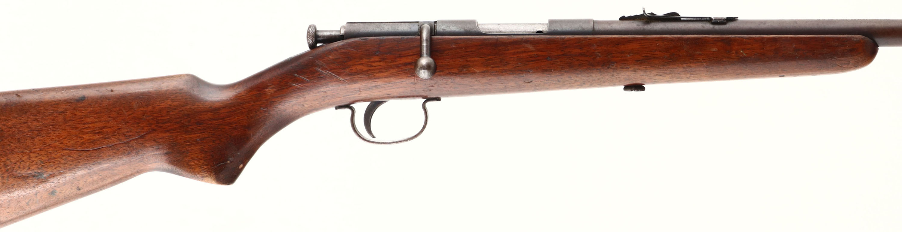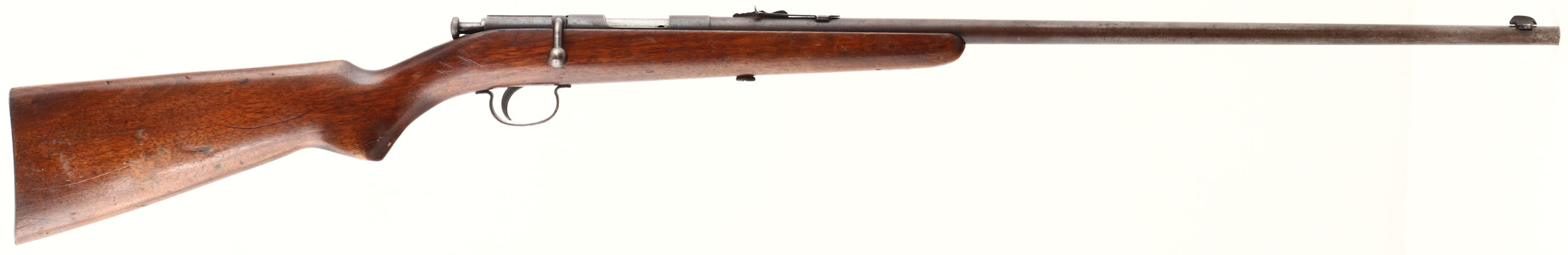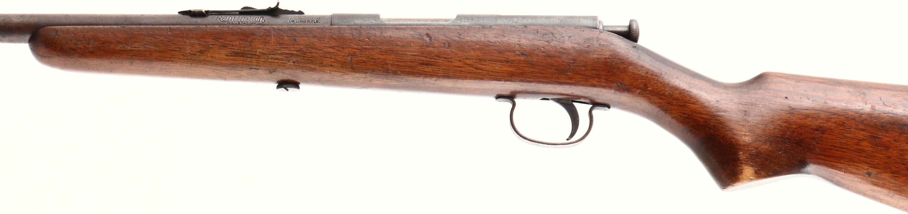 Remington, Model 33, CAL: 22 S,L,LR, MFG: 1931-35, SN: NONE, Bolt Action Rifle, 23'' barrel. The original flat pistol grip stock is good, displaying contusions, scratches, & scrapes. The finish has areas of thinning & crinkling The metal finish has toned to a brown patina, with gun metal gray undertones where wearing thin & spotting throughout. Bore is excellent. The barrel holds an adjustable rear sight & blade front sight. Stock carries a smooth metal buttplate. FFL or C&R Req. - Value: 100 to 300