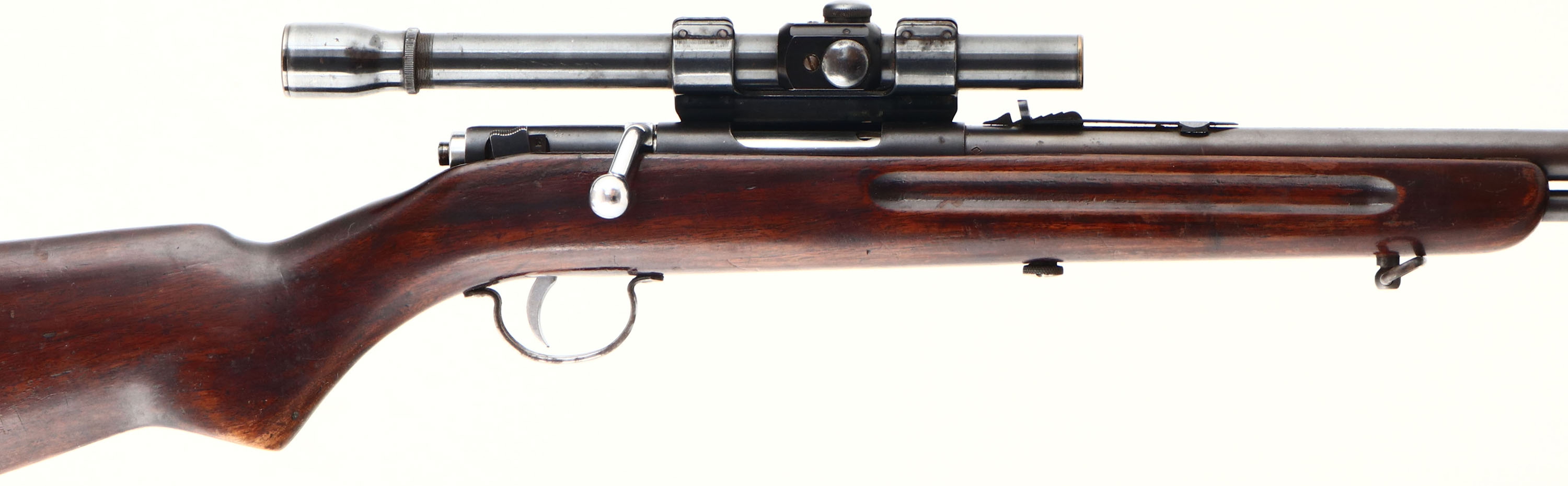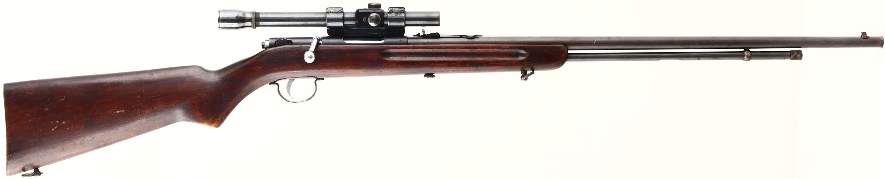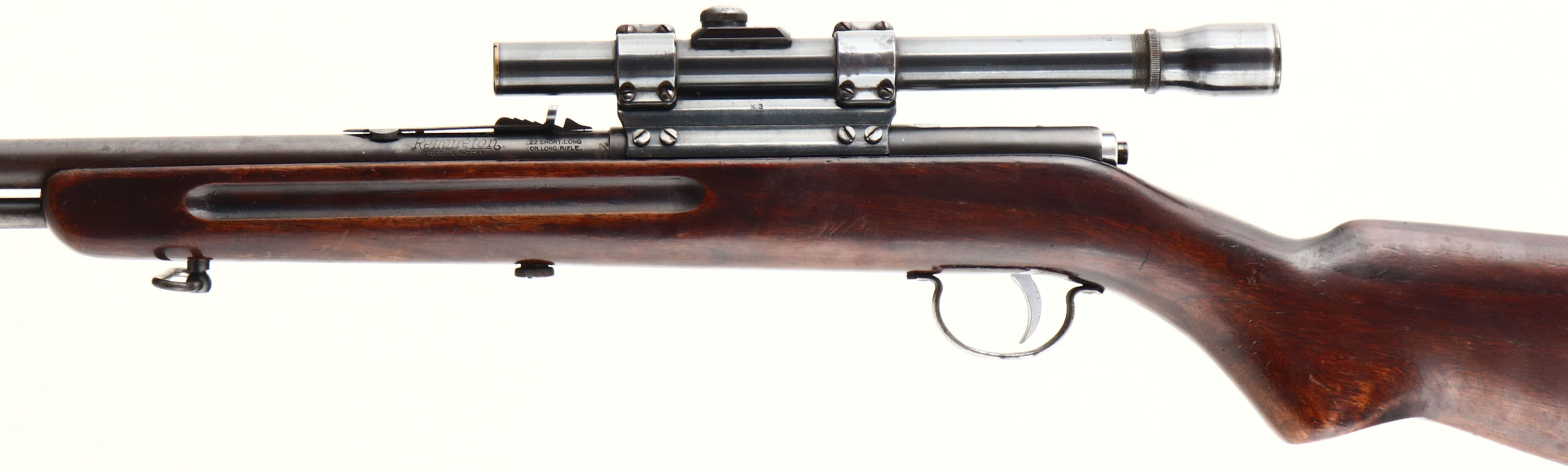 Remington, Model 34, .22 S, L, LR Cal., MFG. 1932-34, SN: 1?21?9, Bolt Action Rifle, 24'' Round tapered barrel, 3/4 mag tube, The flat pistol grip wood stock, with finger grooved forend is good & solid. The stock has an added layer of finish over the original finish & shows thinning, along with some haze & many small scrapes & scratches. Metal blue is 80% overall, but with some pitting & speckling on the barrel. Bore is very good. Steel buttplate, with some pitting. Receiver carries a Weaver J 2.5 scope, while the barrel carries a replaced adj. rear sight & standard front sight. Sling swivels. FFL or C&R Req. - Value: 150 to 300