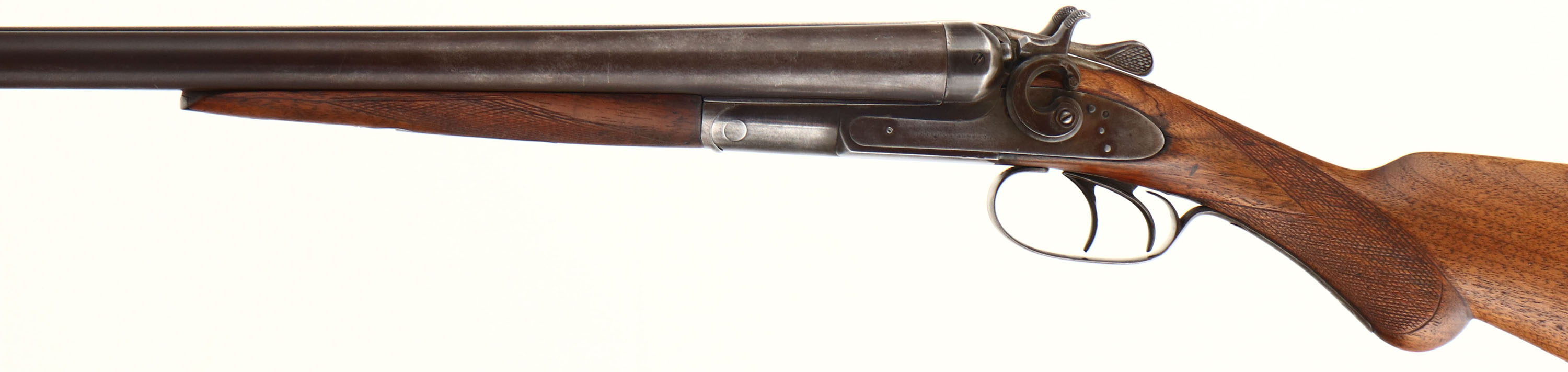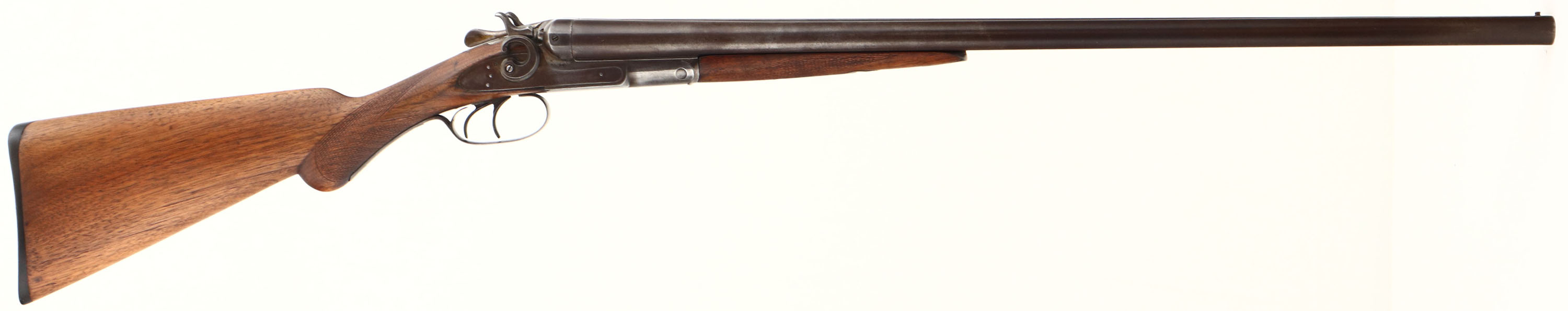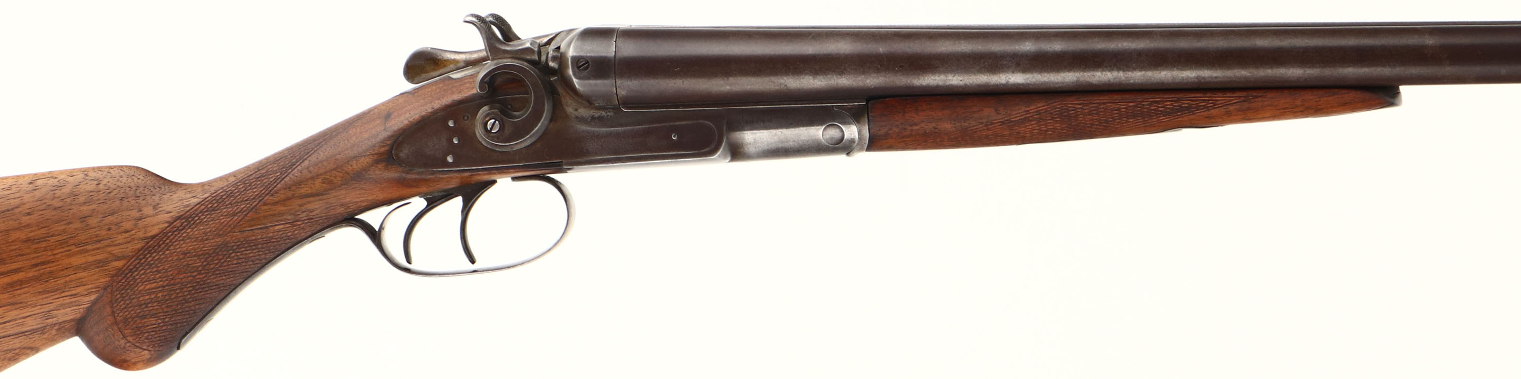 Remington, Model 1889, CAL: 12GA, MFG: 1889-97, SN: 245373, Break Action SxS Shotgun, Choke: F/IC, 27'' barrels. The original checkered & round knob wood stocks are very good, as lightly sanded & refinished. The forend has the ebony inlay tip. There is a tightly repaired crack at the wrist, along with other minor scrapes & contusions. The metal finish has toned to a thin brown patina, with areas worn to gun metal gray. Bores are very good. Double triggers. The solid rib holds a single front bead. Stock carries a Remington checkered buttplate. Antique, No FFL Req. - Value: 400 to 800