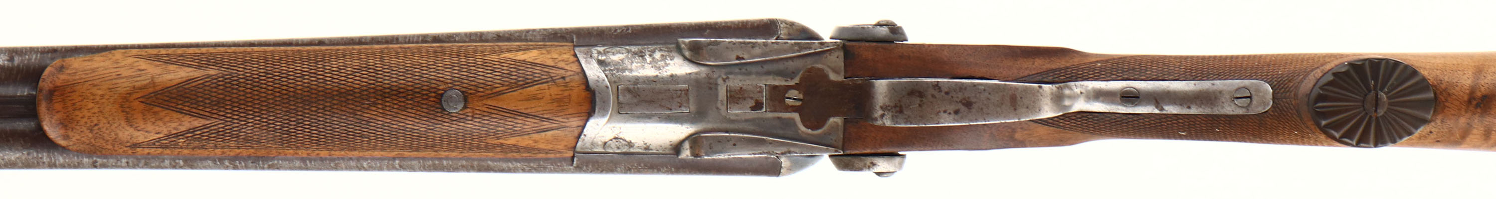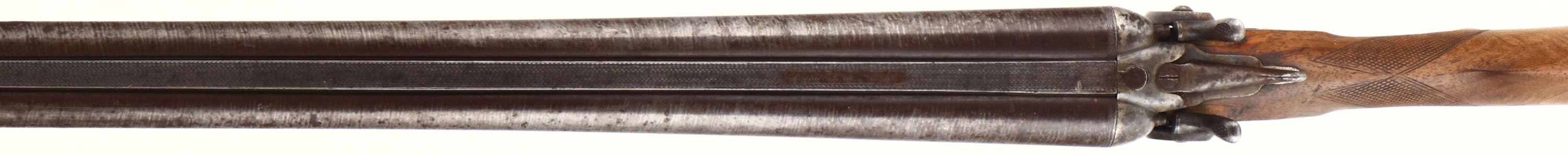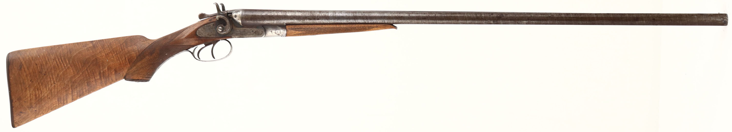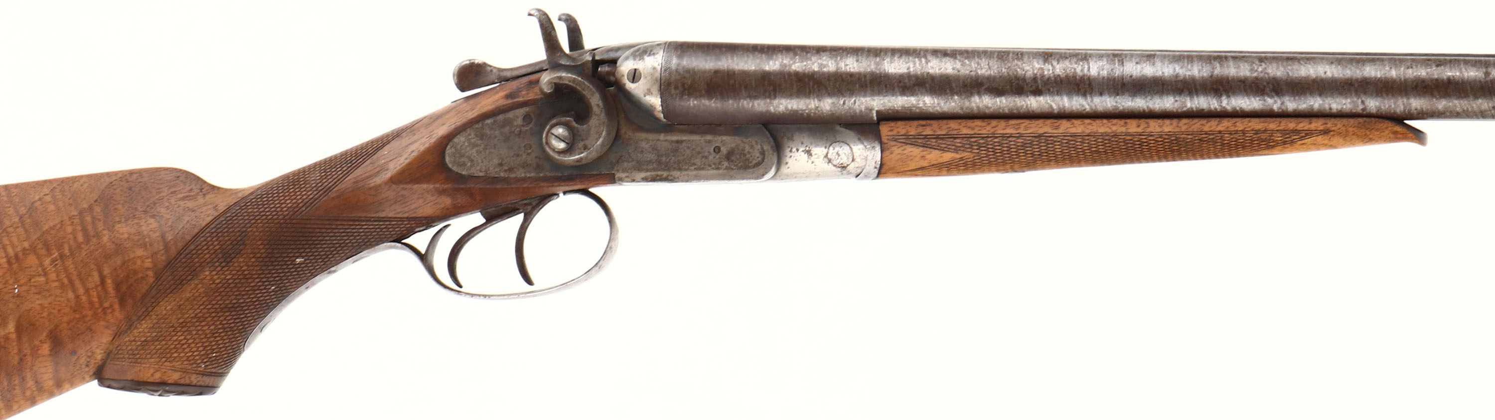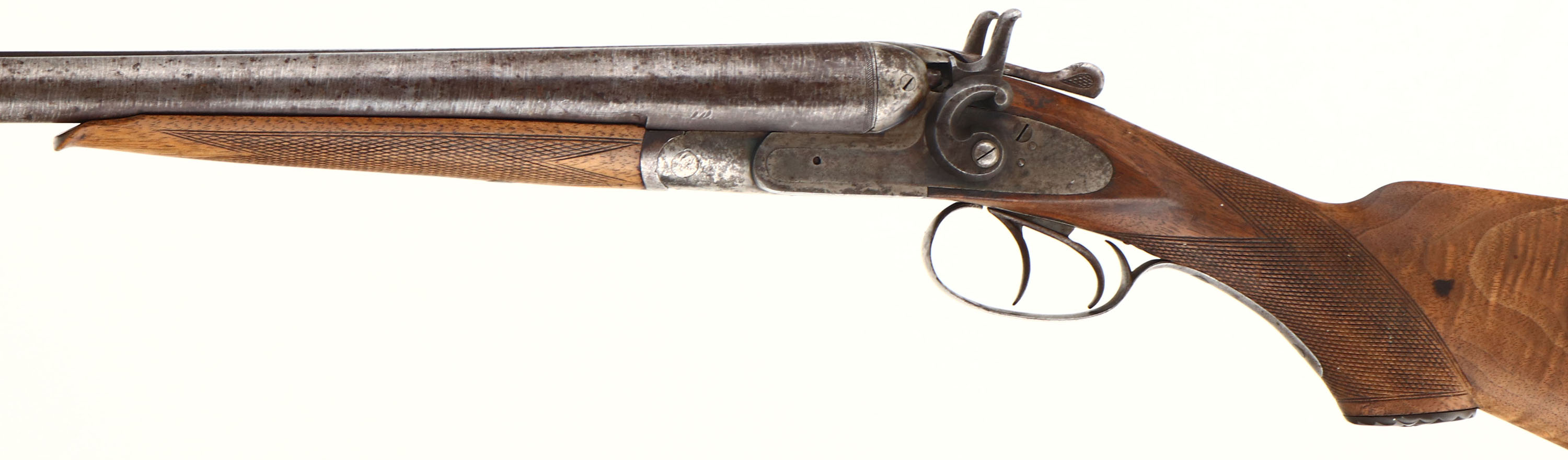 Rival Belgian, No. 3, CAL: 12GA, MFG: 1898-1924, SN: 103298, Break Action SxS Shotgun, 32'' Laminated barrels. The checkered & capped pistol grip wood stocks are very good & solid, with excellent rippled & tiger stripped grain. The finish on the stock has been removed &stock lightly sanded. The stocks still displaying minor scrapes & scratches, with larger contusions on the belly of the stock. The forend has a small sliver missing along the edge by the tip. The laminated steel barrels have toned to a brown patina, with the laminated pattern visible. The case-hardened receiver retains faint case-colors in protected areas, with spotting & speckling. Bores are good, but with some roughness or pitting. The barrel holds a single front bead. Stock carries a checkered buttplate. Double Triggers. FFL or C&R Req. - Value: 200 to 400
