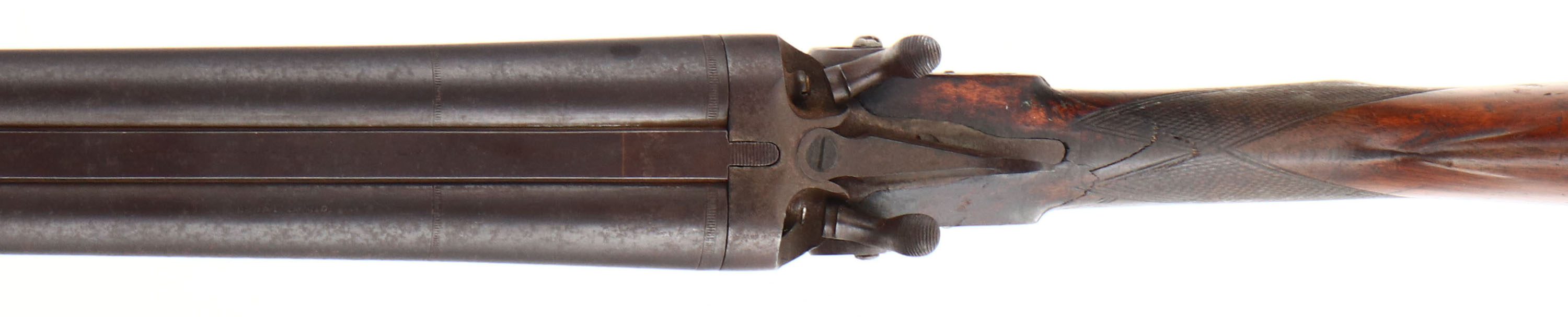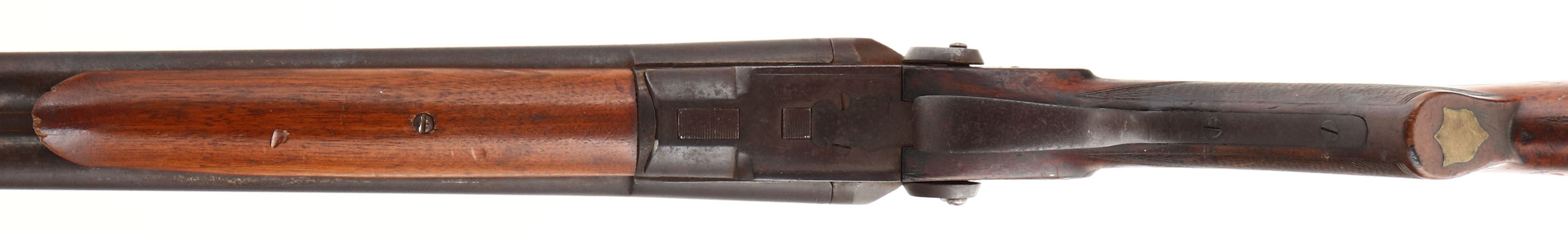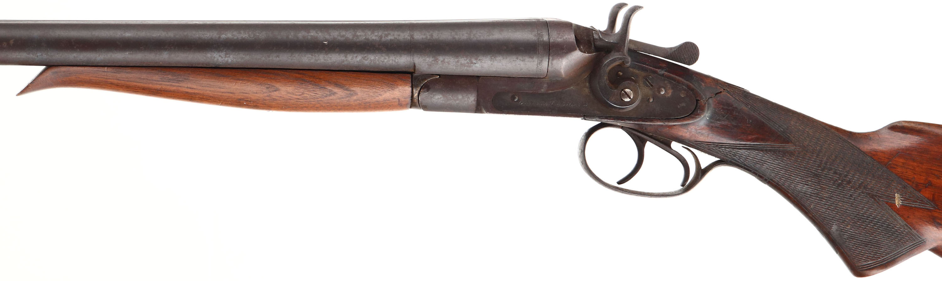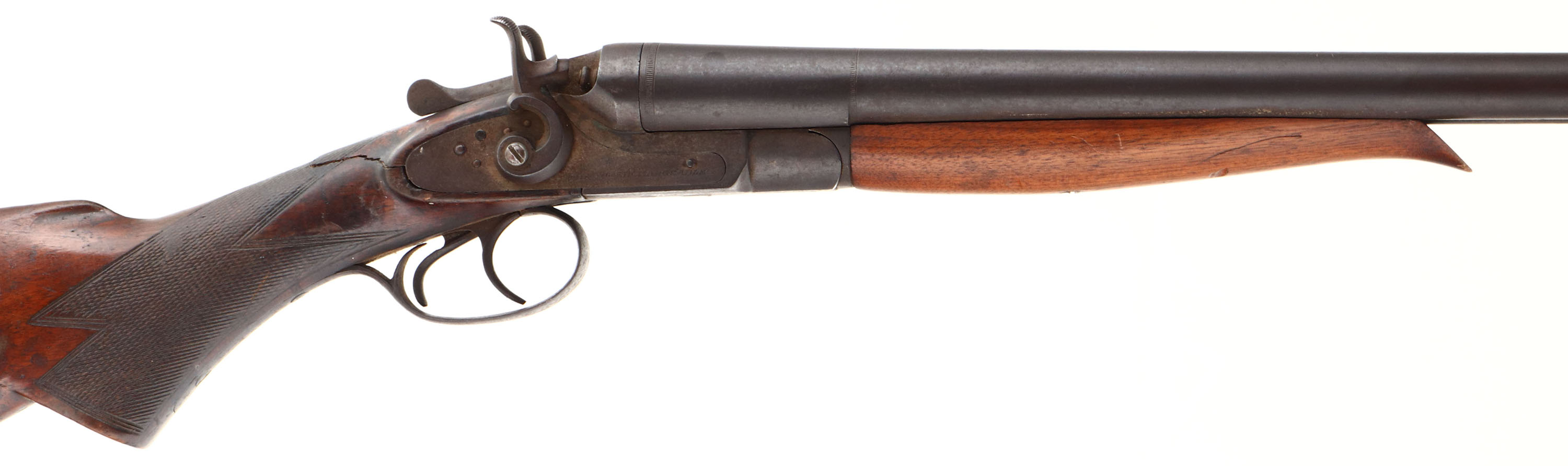 Janssen Sons & Co, Model ''The Interchangeable'', CAL: 12 GA, MFG: Late 1800's, SN: 1371, Break Action SxS Shotgun, 30'' barrels. The flat pistol grip wood stock & forend are fair. The stock has a couple of loose cracks in the area of the wrist & minor edge chips, along with numerous other contusions, scrapes, nicks & dings. Both sides of the stock displays an unknown brand, which appears to be an imprint of bird's foot of some sort. Forearm is likely a replacement. The bottom of the pistol grip has a blank shield initial plate. The metal finish has fully toned to a brown patina, with consistent spotting & pitting. Bores are good, but with age wear & intermittent spotting. The solid rib holds a single front bead. Buttstock carries a grooved metal buttplate. Missing the left nipple firing pin. Double triggers. Antique, No FFL Req. - Value: 100 to 300