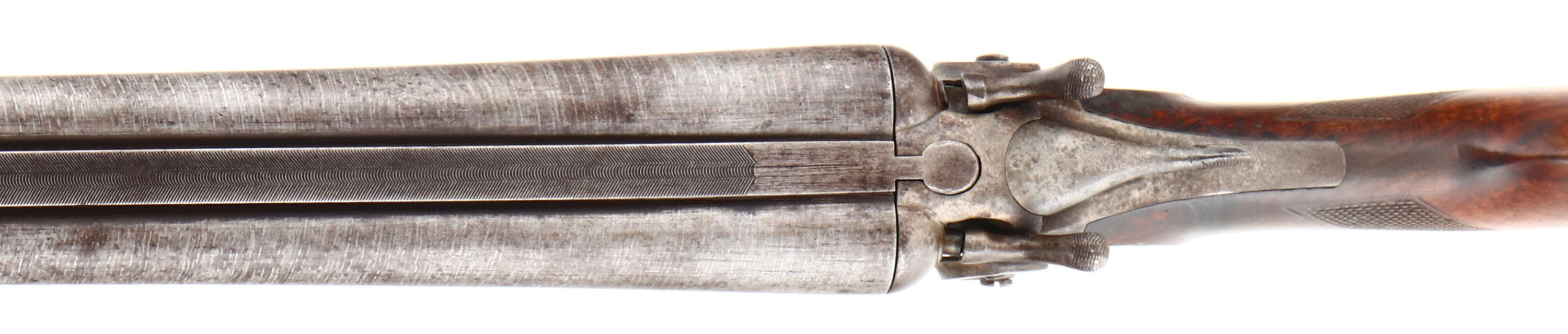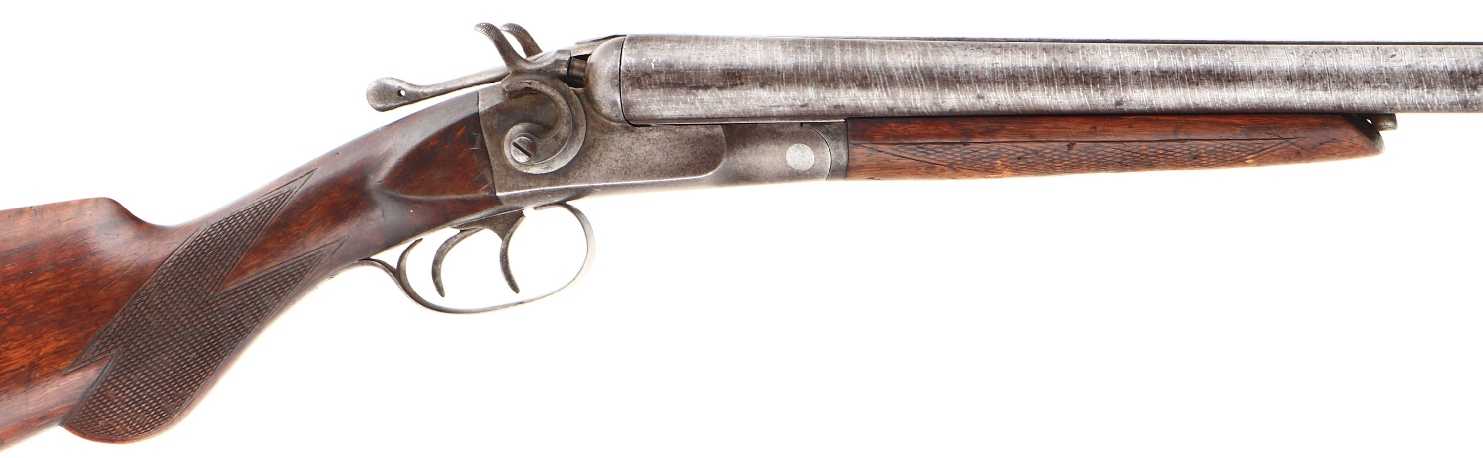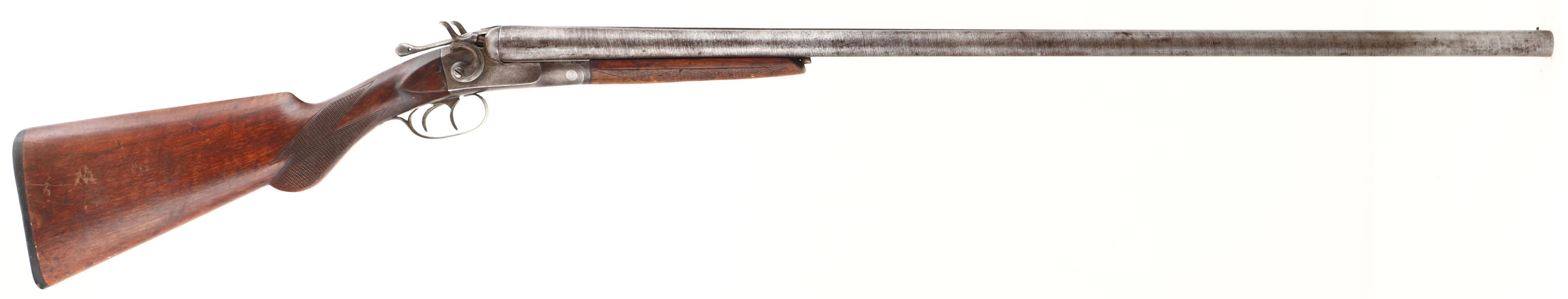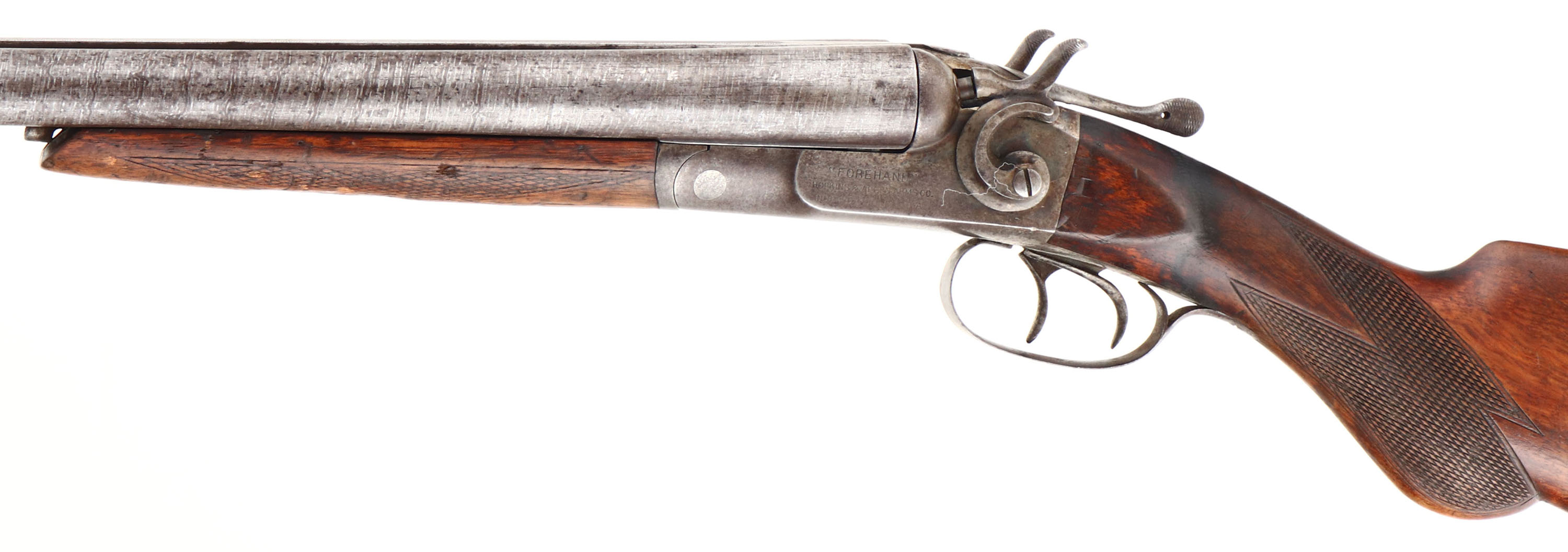 Hopkins & Allens, Model ''Forehand'', CAL: 12 GA, MFG: 1901-17, SN: 18904, Break Action SxS Shotgun, 32'' Laminated steel barrels. The original checkered round knob wood stocks are good & solid, displaying scratches, scrapes & dings in the original finish. The laminated steel barrels have toned to a mix of gun metal gray & brown patina, with spotting. The receiver is case-hardened, toned to a mix of brown patina & metal gray, retaining faint case-colors in protected areas. Bores are good, but with spotty areas of roughness. The solid rib holds a single front bead. Stock carries a H&A checkered buttplate. Double triggers. Matching SN's on water table, base of barrels & underside of forend. The break lever has play & the barrels/ action breaks open too easily. The lever & barrels would likely benefit from some knowledgeable adjusting. FFL or C&R Req. - Value: 150 to 300