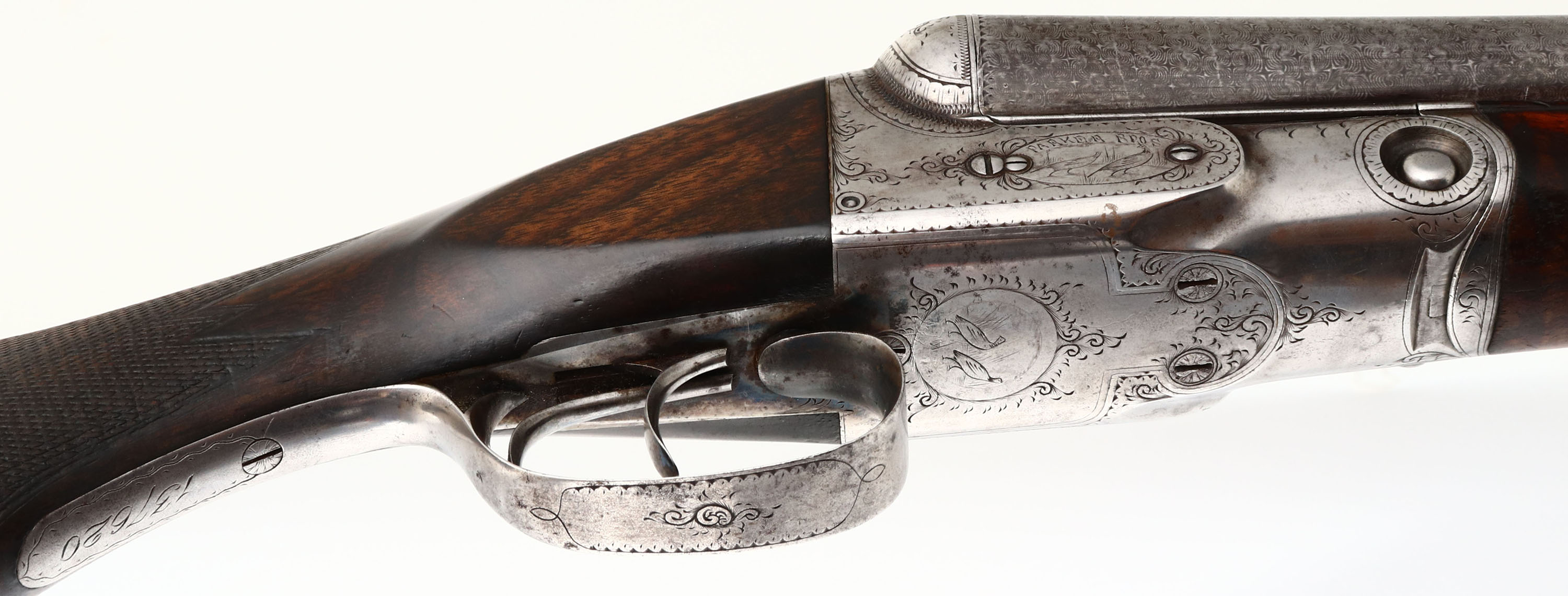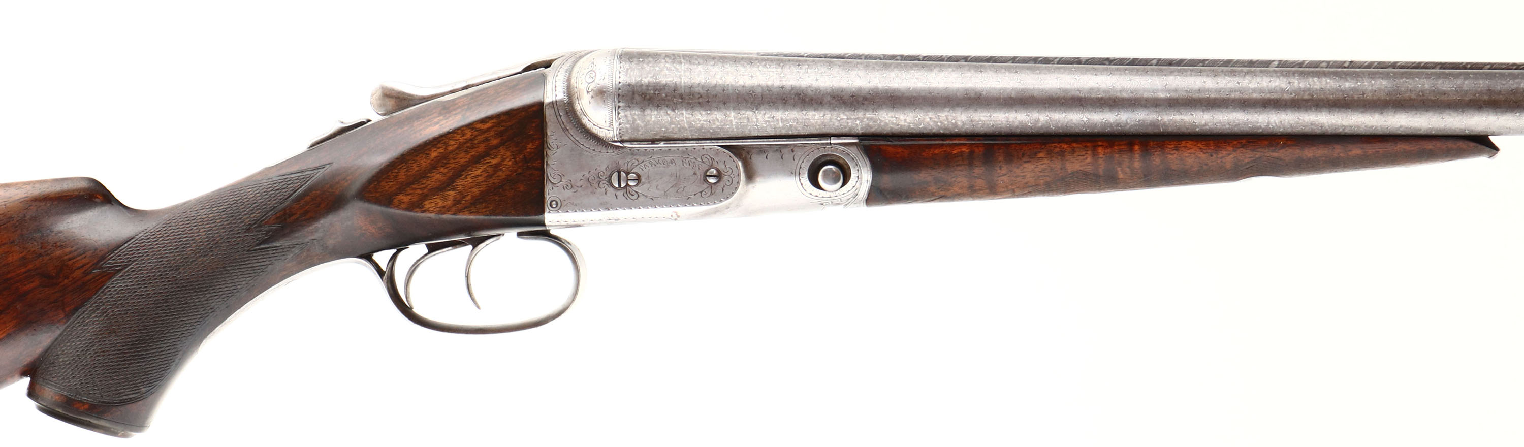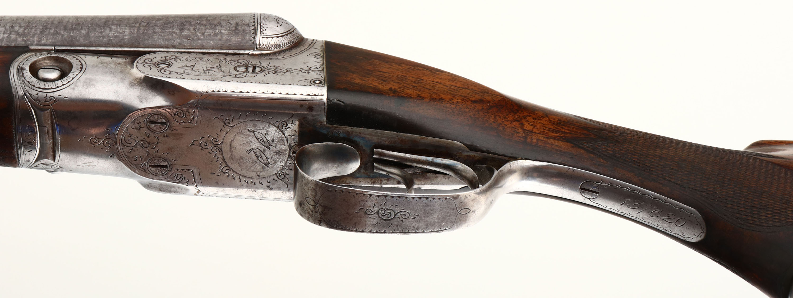 Parker Bros, Model GHE or Grade 2, CAL: 12GA, MFG: 1906, SN: 137620, Break Action SxS Shotgun, 26 7/8'' Damascus barrels, with ejectors. The deluxe checkered & capped pistol grip higher quality American walnut stocks are very good, having been cleaned & displaying an added layer of finish over the original finish. They have wonderful grain & have minor surface scrapes & small contusions. There is a blank initial shield in the belly. The forend has an engraved metal inlaid tip. The Damascus pattern on the barrels is still prominent, on the worn to mostly gun metal gray finish, with a thin layer of brown patina. The case-hardened receiver has worn & faded silver, with remnants of case-color in protected areas. The receiver displays bird game scenes left, right & bottom, with additional simple scroll work. The trigger guard, break lever & forend release lever also display simple scroll engraving. Bores are very good & bright, with a bit more wear within the left barrel. The solid matted rib holds a single front bead. Stock carries a checkered & embossed Parker dog's head buttplate. At the time, this model & grade was popular amongst buyers that wanted a gun with more adornment, fit & finish, & was willing to pay the higher price to have the nicer gun. The gun presents well & remains collectible in this condition.* FFL or C&R Req. - Value: 1000 to 2000