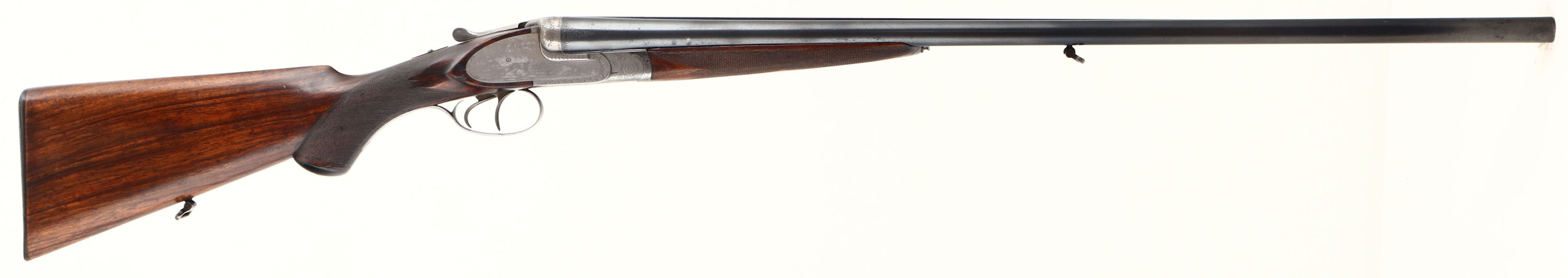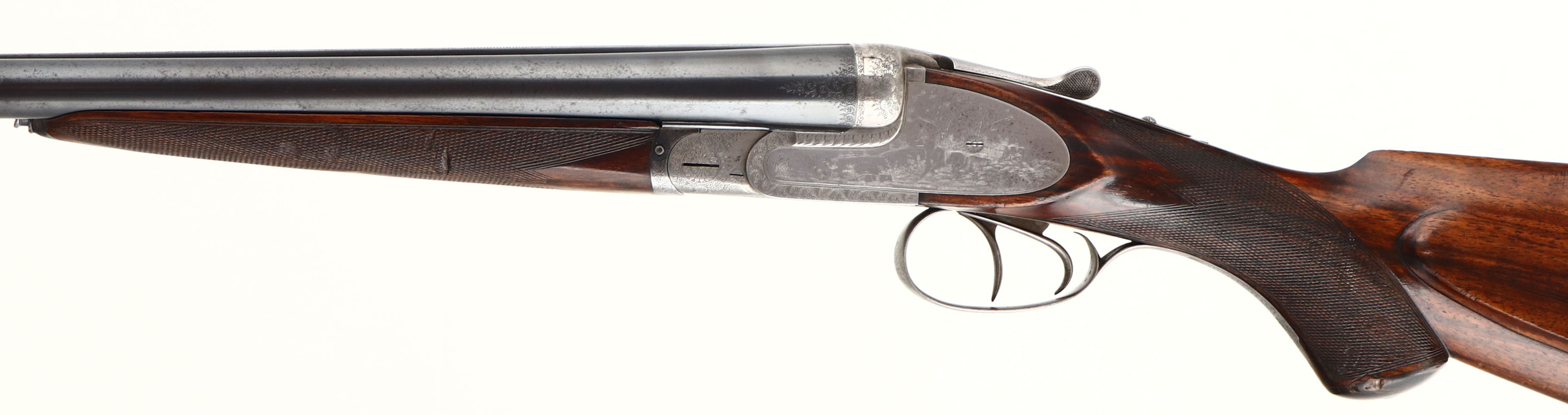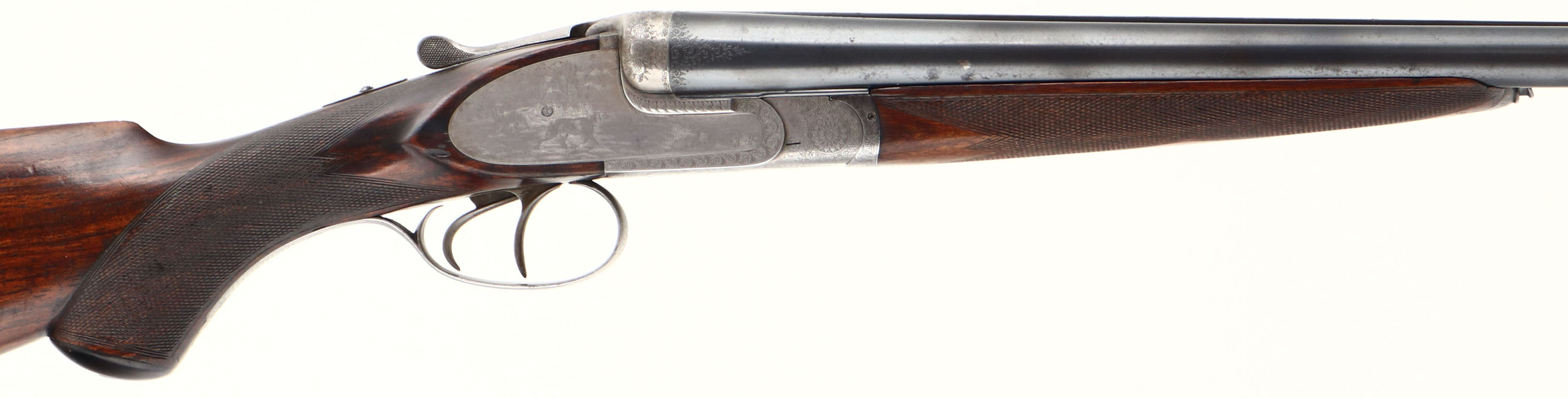 J. Nowotny SxS Shotgun, CAL: 16 GA, MFG: N/A, SN: 15909, Break Action Shotgun, 28 3/8'' barrels. The top of the barrels read, in crude writing ''J. NOWOTNY'' & ''PRAHA C.S.R''. The original checkered, beaded cheek & capped pistol grip wood stocks are excellent, as partially lightly sanded or cleaned & carrying an added layer of finish over the original finish. The metal blue finish on the barrels rates 90% overall, with some rust speckling. The receiver & trigger guard are silver finished, with a thin aged dullness. The receiver is beautifully engraved with ornamental scroll work & game scenes. On the left side of the receiver there's a dog & quail game scene, on the right a dog & pheasant game scene. on the bottom a bull elk & on the trigger guard a perched turkey. All of these game scenes & vignettes are accompanied by intricate ornamental scroll work. Bores are excellent, with some striations. The solid matted rib holds a single front bead. Buttstock carries a grooved plastic buttplate. The pistol grip cap has a couple minor edge chips. Sling loops present. A finely crafted SxS shotgun. FFL or C&R Req. - Value: 1000 to 2000