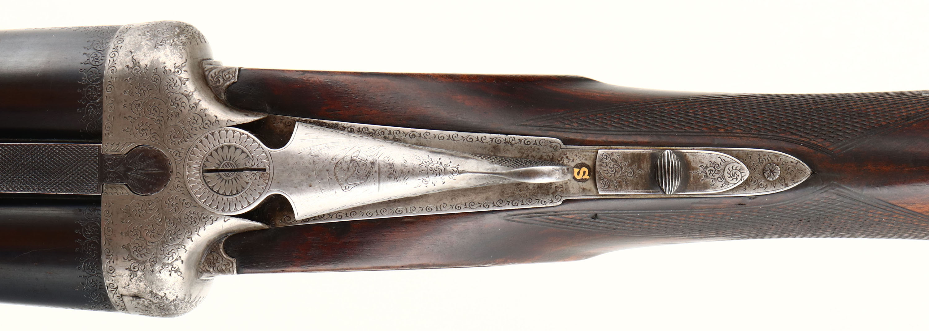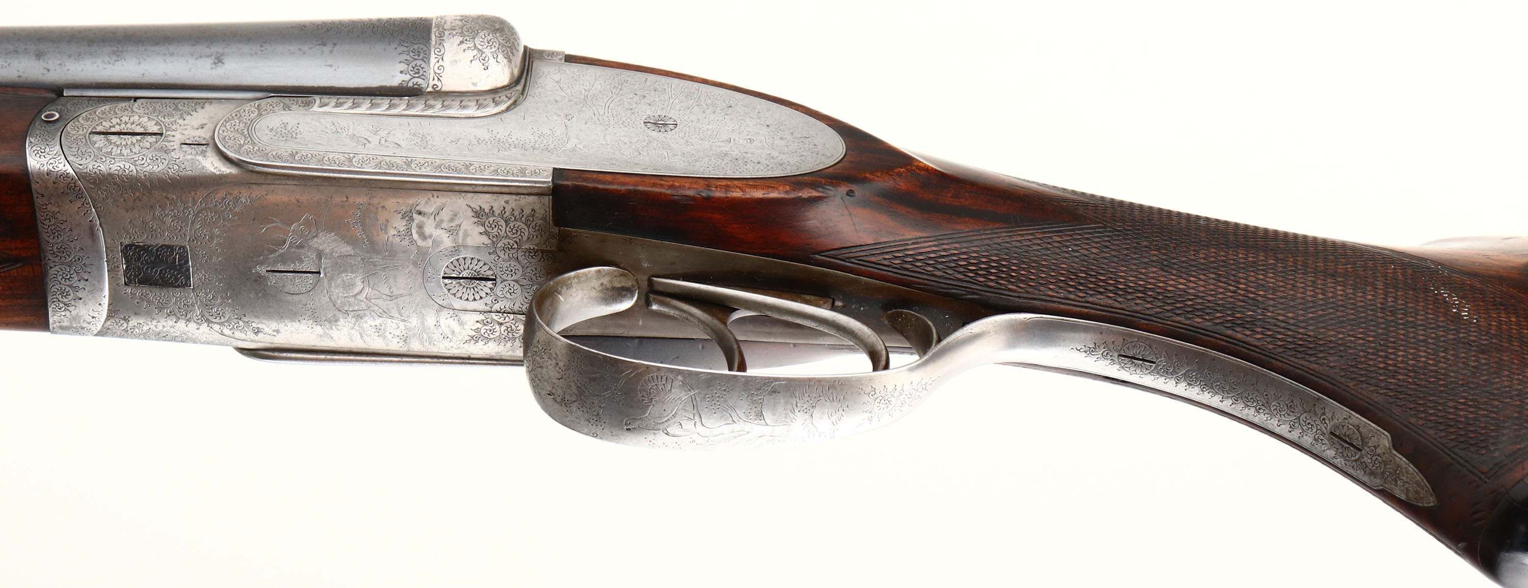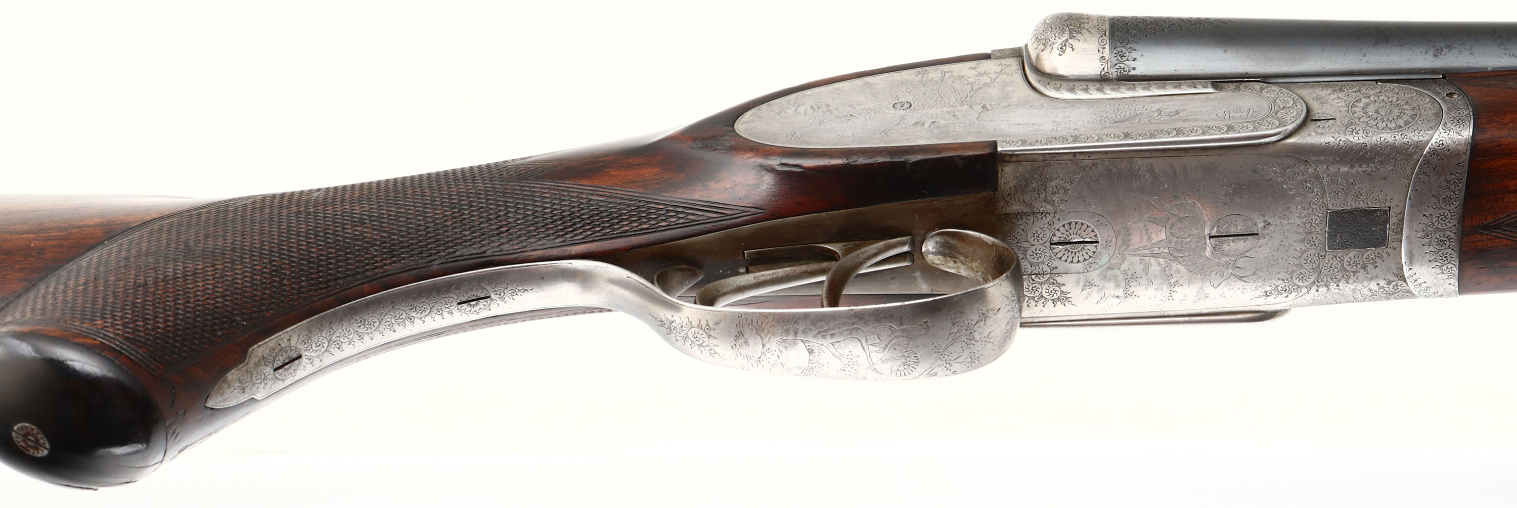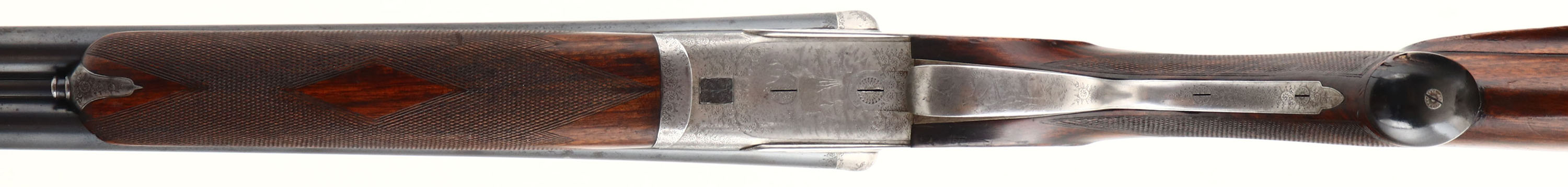 J. Nowotny SxS Shotgun, CAL: 16 GA, MFG: N/A, SN: 15909, Break Action Shotgun, 28 3/8'' barrels. The top of the barrels read, in crude writing ''J. NOWOTNY'' & ''PRAHA C.S.R''. The original checkered, beaded cheek & capped pistol grip wood stocks are excellent, as partially lightly sanded or cleaned & carrying an added layer of finish over the original finish. The metal blue finish on the barrels rates 90% overall, with some rust speckling. The receiver & trigger guard are silver finished, with a thin aged dullness. The receiver is beautifully engraved with ornamental scroll work & game scenes. On the left side of the receiver there's a dog & quail game scene, on the right a dog & pheasant game scene. on the bottom a bull elk & on the trigger guard a perched turkey. All of these game scenes & vignettes are accompanied by intricate ornamental scroll work. Bores are excellent, with some striations. The solid matted rib holds a single front bead. Buttstock carries a grooved plastic buttplate. The pistol grip cap has a couple minor edge chips. Sling loops present. A finely crafted SxS shotgun. FFL or C&R Req. - Value: 1000 to 2000