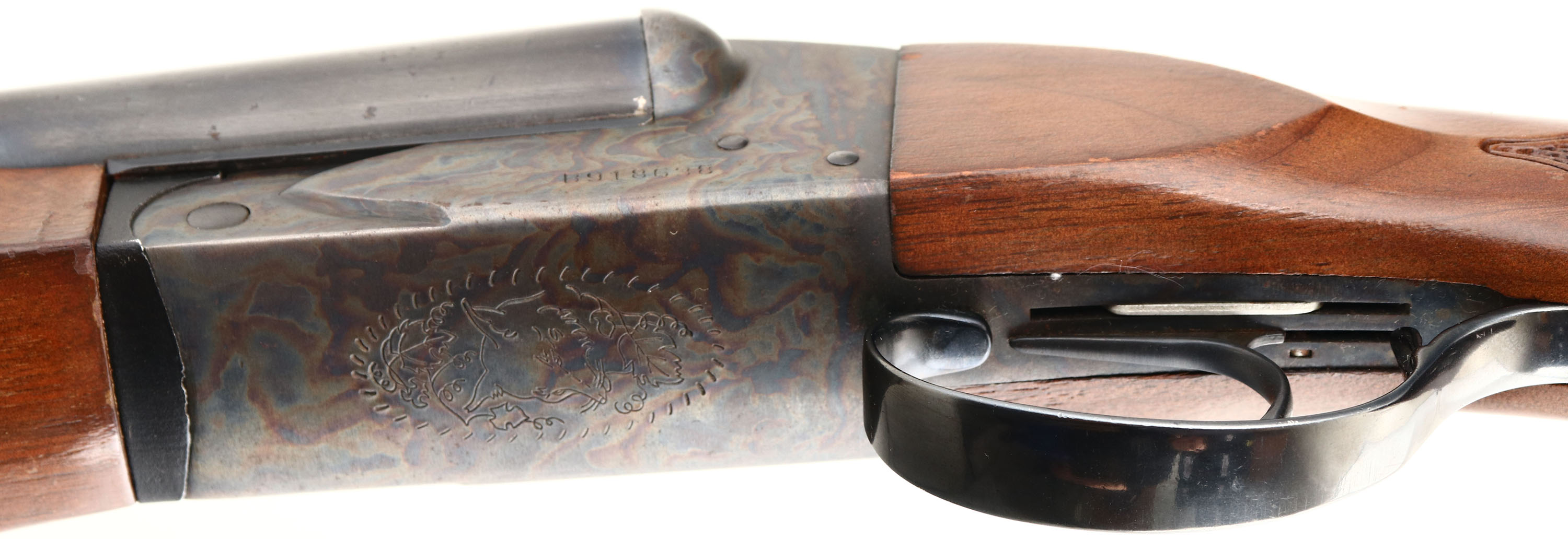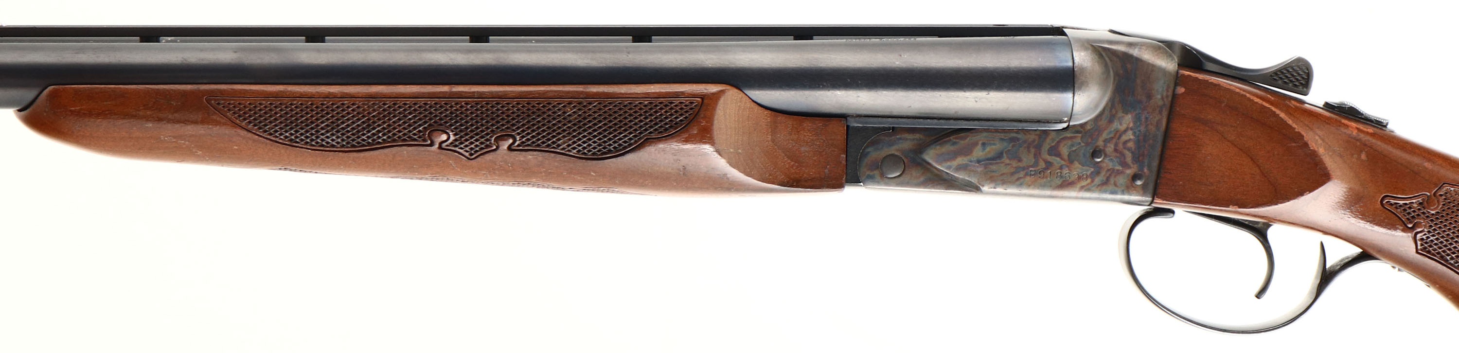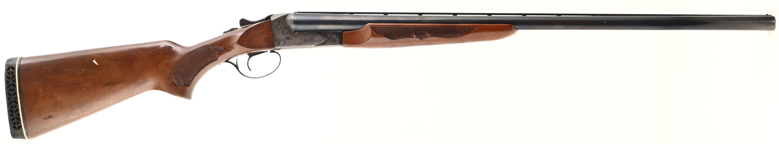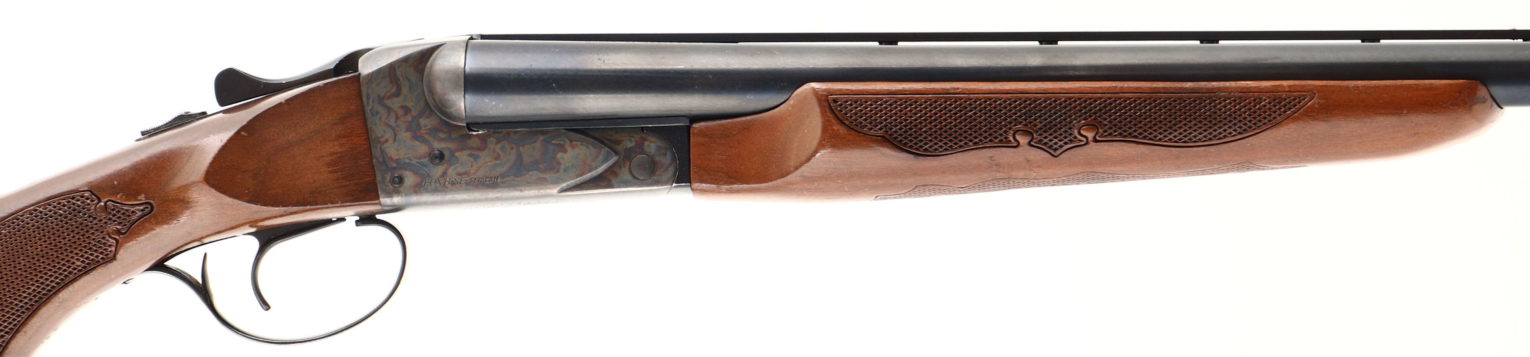 Savage, Model Fox B-SE Series H, CAL: 12 GA, MFG: 1970's, SN: B918638, Break Action SxS Shotgun, 28'' barrels. The checkered flat pistol grip wood stock, with beavertail forearm are very good, displaying scrapes, nicks, dings & small areas of flaking to the original finish. The metal blue finish on the barrels rates 90% overall, with multiple small scuffs & blemishes. The receiver is case-hardened, retaining colorful tones. Bores a very good, displaying normal use wear. The ventilated rib holds a small mid-rib & front bead. Buttstock carries a amateur installed ventilated black rubber recoil pad. FFL Req. - Value: 200 to 500