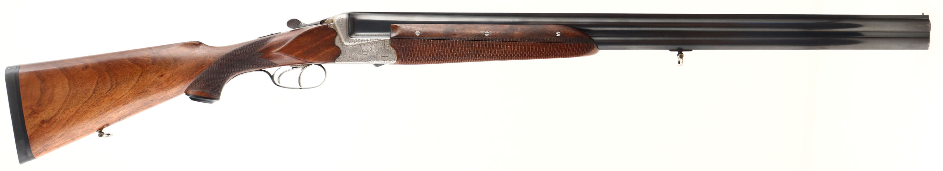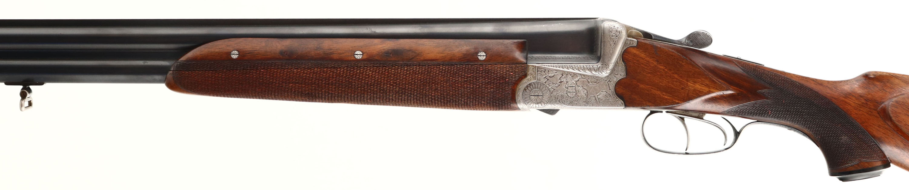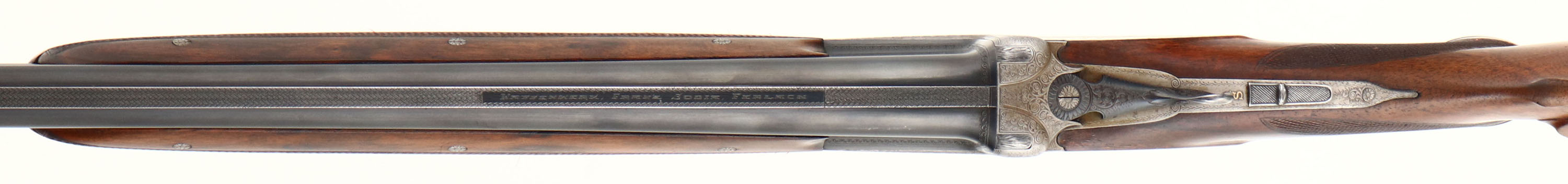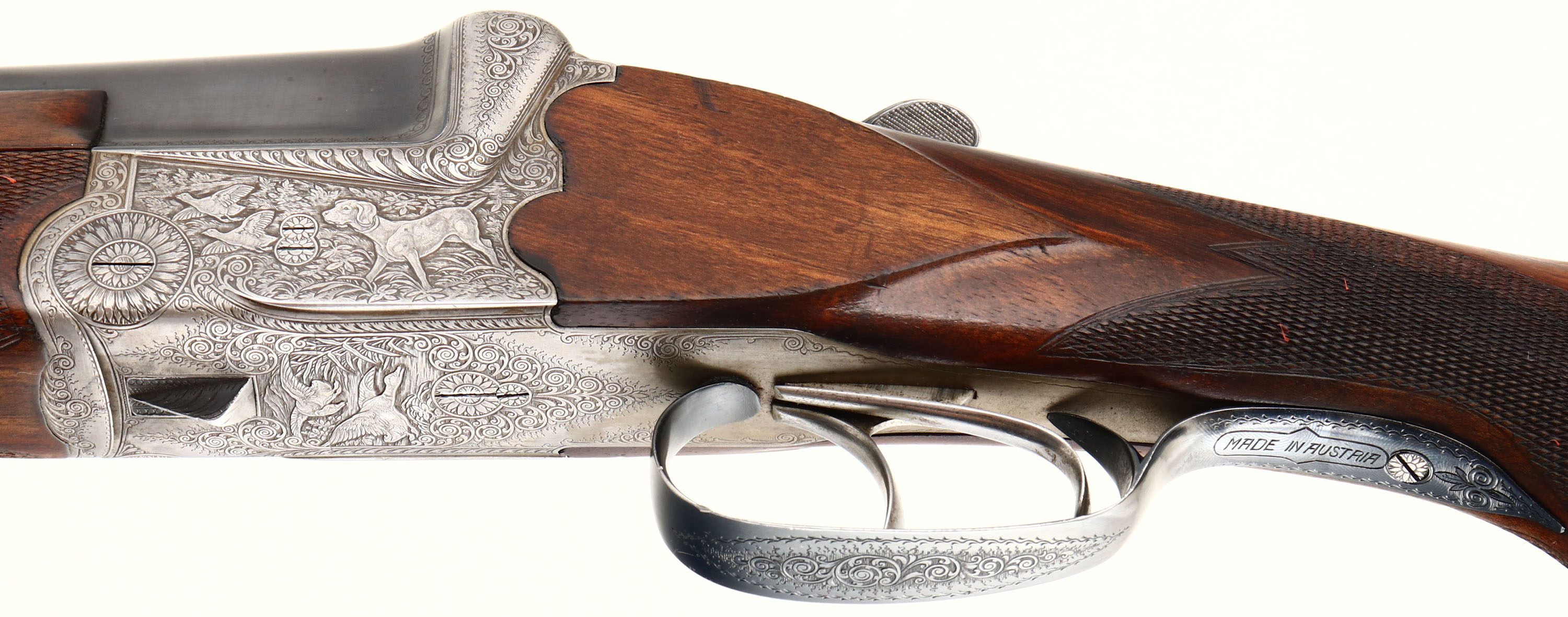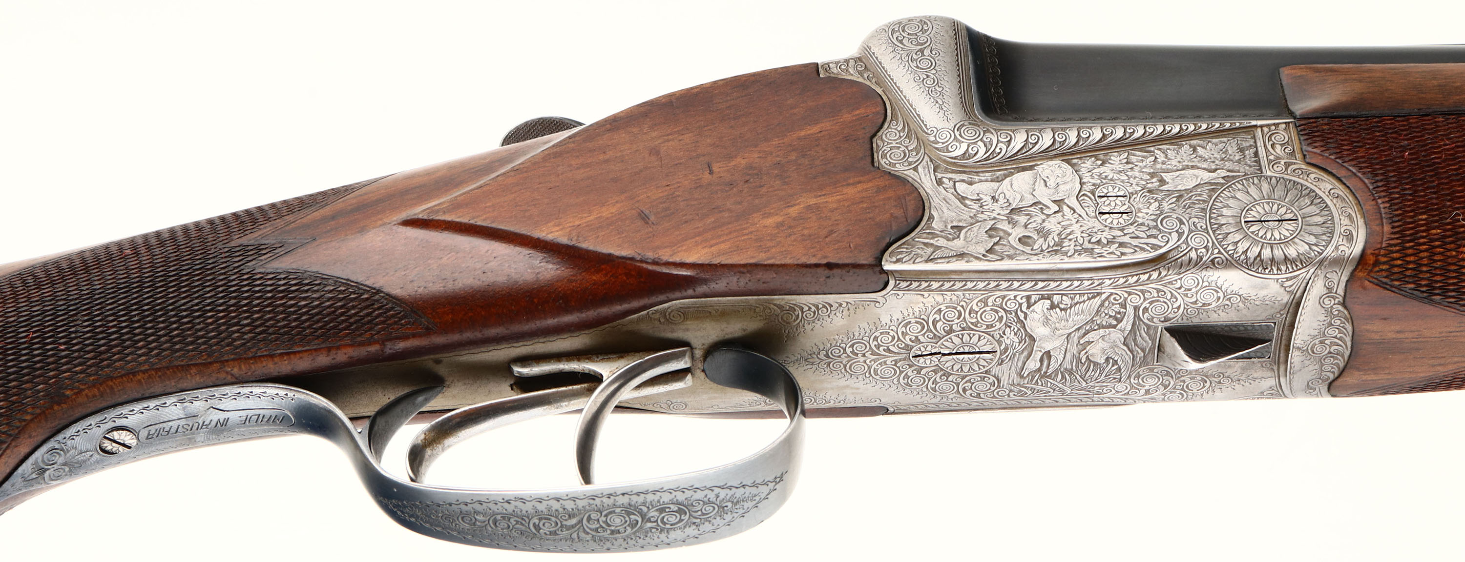 Franz Sodia, Ferlach, CAL: 12 GA, MFG: 1950's, SN: 2916, Break Action O/U Shotgun, 28 1/2'' barrels. The original, checkered, beaded cheek, & capped pistol grip wood stock & three piece forend are excellent, displaying minor contusions & surface scrapes to the finish. The metal blue finish on barrels rates 95% overall, with light scuffs & blemishes. The receiver is coin silver. The entirety of the receiver, trigger guard, break lever, forend metal components & screws are all beautifully & intricately hand engraved. The receiver displays multiple game scenes; on the left a pointer & two quail, on the right a fox & two woodcocks, on the bottom two mallards, as well as a variety of ornamental scroll work. Bores are excellent. The solid rib holds a single front bead. Buttstock carries a solid black rubber recoil pad. Sling loops present. Double triggers. A truly outstanding example of a high grade Austrian shotgun. FFL or C&R Req. - Value: 1500 to 2500