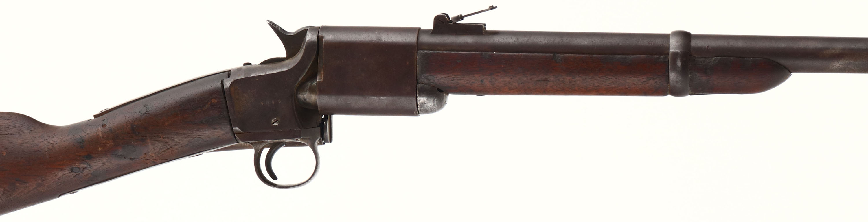 Meriden Manfg Co., Model ''Triplett & Scott Rifle'', CAL: 50 R.F, MFG: 1864-66, SN: 4056, Swivel Breech Loading Rifle, 30'' round barrel. The straight grip American walnut stock & forend are fair. There is a 5 1/4'' glue repaired break/crack left side of the wrist, several small grain cracks on the right wrist & a small 1'' crack on the left side by the buttplate. The stocks still remain solid after repairs & displays small contusions, scrapes, nicks & dings. Marked on left side of receiver in two lines, '' MERIDEN MANGF. CO.'', ''MERIDEN CONN.'' On upper receiver tang: ''TRIPLETT & SCOTT - PATENT DEC 6, 1864''. The right side of the frame is stamped with the full SN. The metal surfaces all carry a rust brown patina, with rust pitting & speckling. The barrel holds a flip-up ladder rear sight, with no graduation marks & a heavy inverted ''V'' blade front sight. Bore is good, with spotty areas of pitting near the muzzle. Buttstock carries a smooth, curved metal buttplate. The unique action appears to function properly. This rifle was issued to Kentucky Home Guard troops who were assigned to protect the supply lines of the Union Army under General Sherman's command. A unique & truly strange two-piece design, with the breech face, firing controls, magazine & buttstock as the rear most assembly, attached to the firing chamber, barrel & forend assembly by a pivoting joint. The gun used a seven round tubular magazine in the buttstock, similar the Spencer, but not removable. The magazine tube is situated off center to the left, along the toe line of the stock. This design left almost no wood in the buttstock over the magazine tube & left the wrist very weak. Every Triplett & Scott has a severe cracks, & often wood loss, as seen in this example as well. To operate the action, the hammer is placed on half cock, & a thumb release catch depressed on the rear of the receiver. This allowed the shooter to rotate the forward half of the receiver to the right (clockwise) & as the forward portion rotated an automatic ejector would extract the spent cartridge case from the receiver, dumping it on the ground. As the forward portion of the receiver was rotated further around, it pushed a spring-loaded door open, which covered the magazine tube. This allows a cartridge to be fed into the firing chamber. Rotating the action back to the left (counter clockwise) closes & locks the action & cocks the hammer fully making the gun ready for firing. While this seems like a complicated system, it did work well & with training, a solider could operate the gun with some efficiency. Antique, No FFL Req. - Value: 800 to 1500