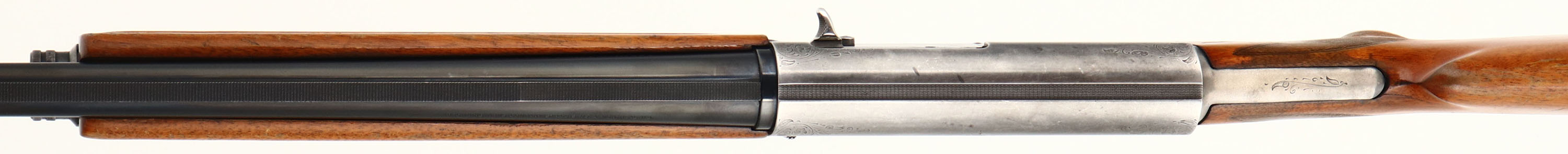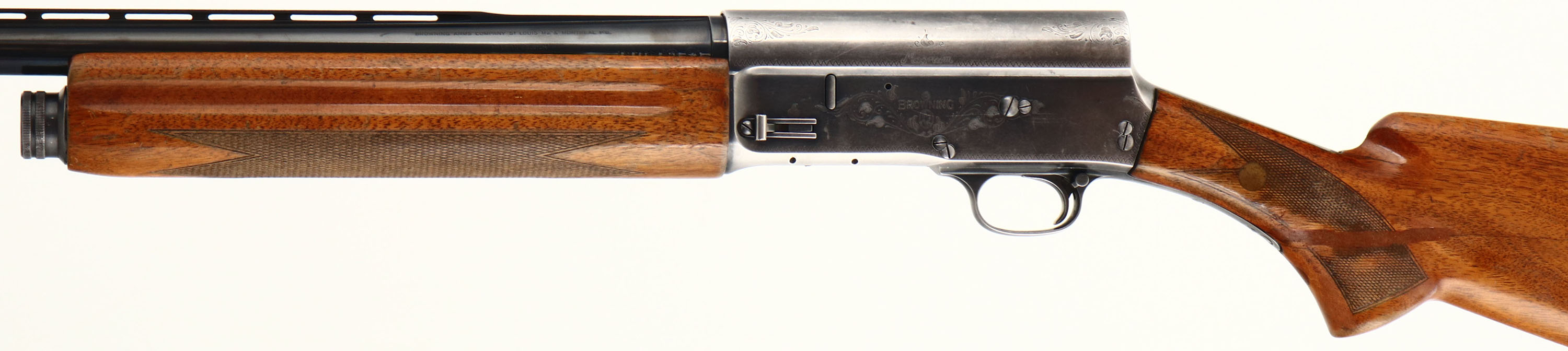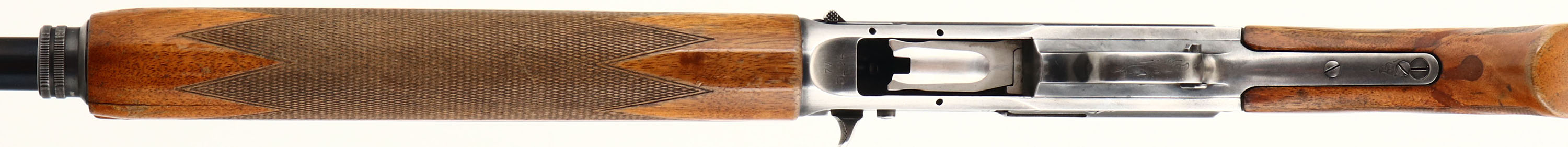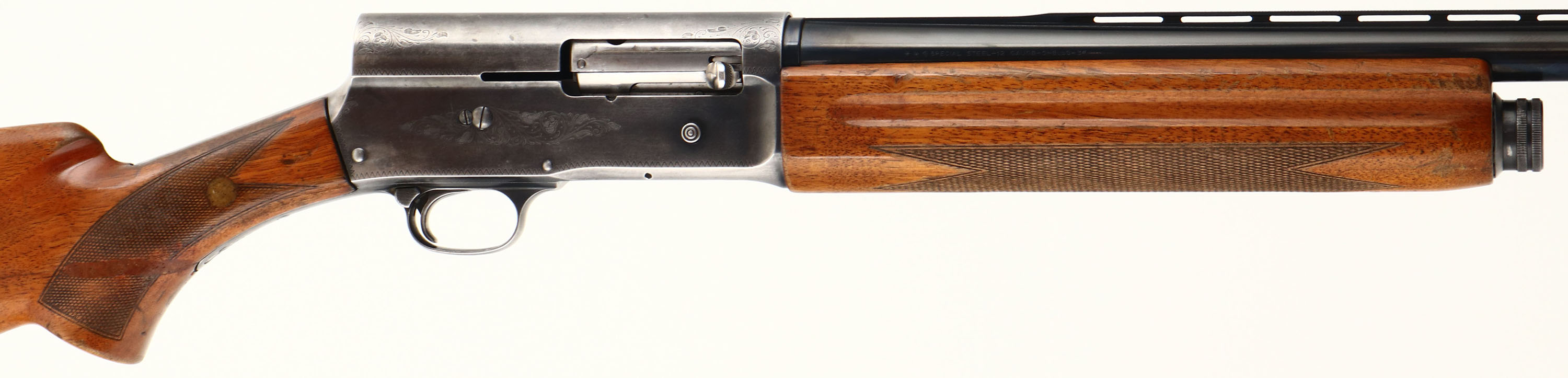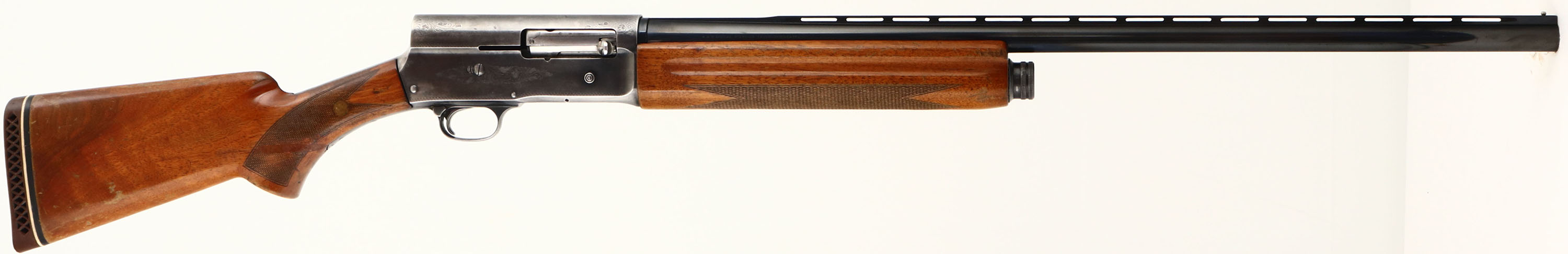 Browning (Belgium), Model A5 Magnum, CAL: 12GA, MFG: 1967, SN: 7V3294, Semi Auto Shotgun, Choke: MOD, 3'', 29 1/2'' barrel. The checkered & flat pistol grip wood stock & forend are good, despite the stock having a repaired 4'' crack running down each side of the stock emanating from the lower tang. The stock also has a support dowel running through to both side of the wrist & another in the pistol grip below the lower tang. These repairs, while not pretty do offer full stability back to the stock. The forearm has a 3'' crack & stocks have other contusions, dings & areas of flaking finish. The metal blue finish on the replaced Browning barrel rates 98% overall. The receiver has worn to a mix of thin remaining blue & gun metal gray. The receiver, upper/lower tang & trigger guard display simple scroll, vine & border engravings. Bore is excellent. The ventilated rib holds a single front bead. The buttstock carries a ventilated brown rubber recoil pad. FFL or C&R Req. - Value: 200 to 500