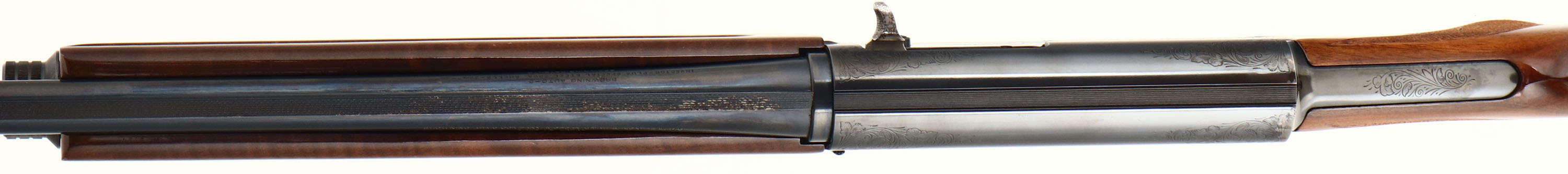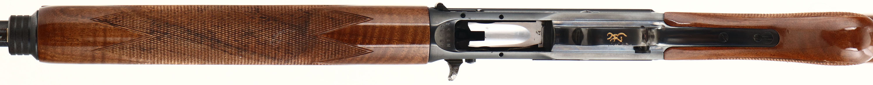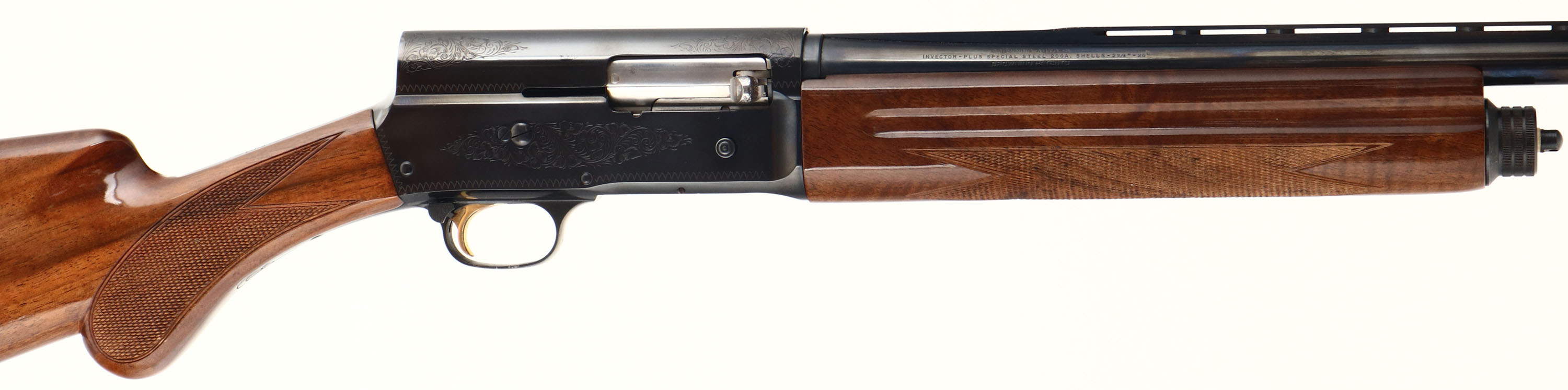 Browning, Model A5 Light Twenty, CAL: 20 GA, MFG: 1996, SN: 13469NT231, Semi Auto Shotgun, Invector Chokes, 25 7/8'' Ventilated barrel. The original checkered & round knob wood stocks are excellent, displaying minor handling marks & scuffs to the original high gloss finish. The metal blue finish rates 90% overall, but with spotty areas of wear, flaking or light pitting. The receiver displays simple scroll, vine & border engravings. Bore is excellent, displaying little to no use. The ventilated rib holds a single front bead, buttstock carries a Browning black plastic buttplate. Gold trigger. Sling studs present. A later produced A5 shotgun in the popular Light Twenty configuration. FFL or C&R Req. - Value: 400 to 1000
