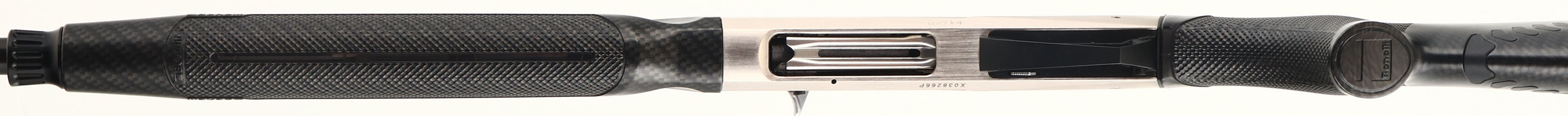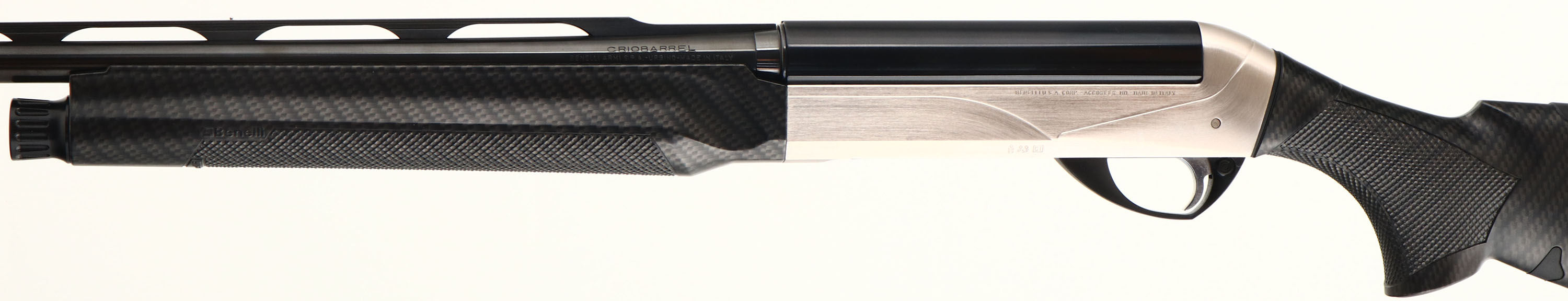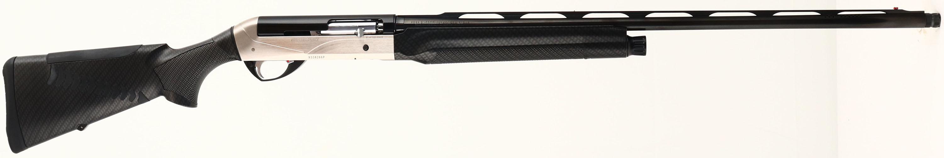 Benelli, Model ETHOS Supersport, CAL: 20 GA, MFG: Modern, SN: X038266P, Semi Auto Shotgun, 27 3/4'' ported Crio barrel. This sleek SuperSport shotgun is a speed gun suited for any clays course or shotgun competition. The textured carbon fiber stocks are excellent. The stock features Benelli's patented ComforTech recoil system, which reduces recoil by nearly 50%. Benelli claims the ComforTech system also mitigates muzzle climb by 15% for fast follow-up shots. The metal blue finish on the barrel rates 99%, the satin nickel receiver is excellent. Bore is excellent, displaying very little use. The ventilated rib holds a small mid-rib steel bead & red fiber optic front sight. Buttstock carries a grooved soft foam recoil pad. Comes with a set of Crio chokes & choke tool. A perfect shotgun for competition shooting! FFL Req. - Value: 1000 to 2000