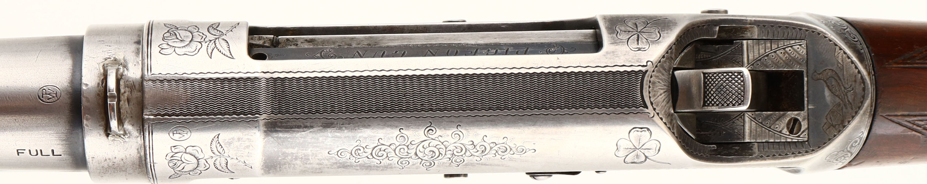 RARE Winchester, Model 1897 Engraved Pigeon Grade, 12 GA., MFG: 1913, SN: 585896, Pump Action Shotgun, 32'' no rib barrel, Full choke, Black Diamond Pigeon Grade, Take down, The original deluxe checkered & straight grip wood stocks are very good & solid. They display the original finish, with an added layer of finish to the stock & a few minor finish level scuffs or dings. The forearm has darkened from use & much of the original checkering has worn smooth. Black diamonds located in the wrist. The original metal blue finish rate 30% overall. Receiver displays panel scene engraving of a live pigeon shoot on the left, grouse hunter & dog on the right, & American scroll & border engraving on the underside& trigger guard. There is an engraved standing pigeon located behind the hammer. Trigger guard is also factory engraved ''P. J. FORD.''. There is a story this shotgun was presented to or at least was owned by an early member of the Ford automobile family, but no records or documents exist to prove that prominence. All engraving, lettering & address are legible. A fixed ''V'' rear sight has been added to the bridge of the receiver, while the barrel carries a single gold bead. The bore is very good. Stock carries a hardened solid red recoil pad. Esthetically, a very nice example of a fairly rare shotgun. FFL or C&R Req. - Value: 3000 to 4500