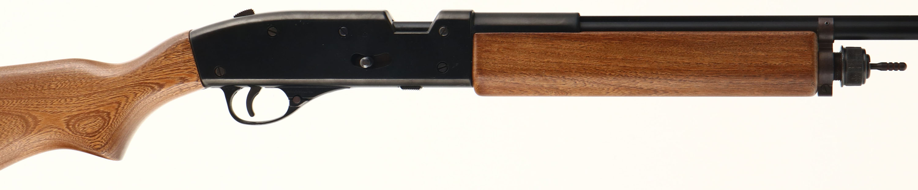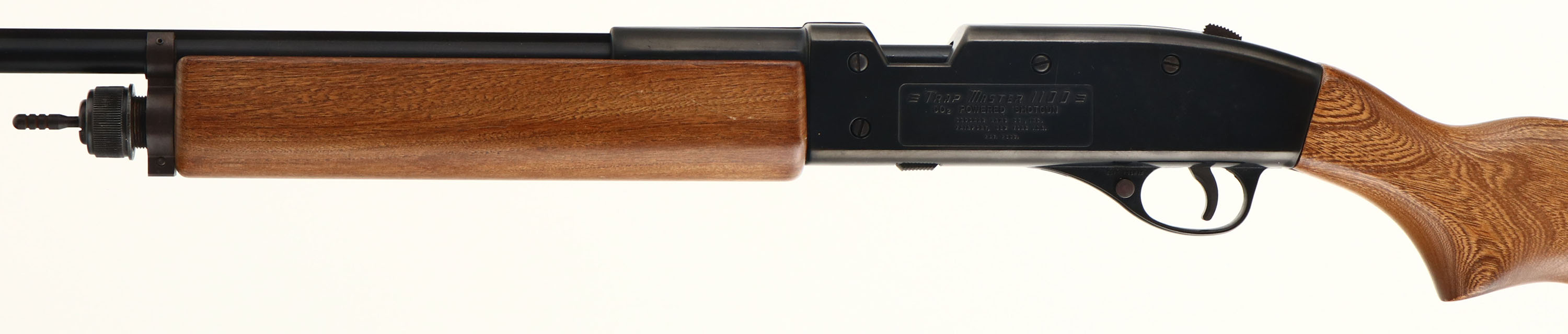 RARE!! Crosman Arms, Trap Master 1100, CAL: No.8 Shot/Crosman Co2 Shotshells, MFG: 1968-71, SN: 616069, Co2 Powered Shotgun, 28'' Ribbed barrel. The flat pistol grip wood stocks are excellent, displaying minor handling marks to the original finish. The metal black finish on the barrel & receiver is excellent, rating 99% overall, with a few minor blemishes or scuffs. Bore is mint. The barrel holds a single front bead. Stock carries a grooved plastic buttplate. This is a rarely seen full set. It comes complete with all parts for the Trap Bench assembly in original packaging, with parts having light storage wear. Comes with (25) yellow plastic break-away targets in original Crosman box, original Crosman Shotshell Reloading Kit, with shells, BB shot & plastic wads, oil new in the package, owners manual, assembly instructions, shotshell reloading instructions, & a couple other paper articles. A seldom seen set, especially with all the correct, original parts in very high original condition. A wonderful addition to a Crosman collection! Air shotgun. No FFL Req. - Value: 500 to 1000