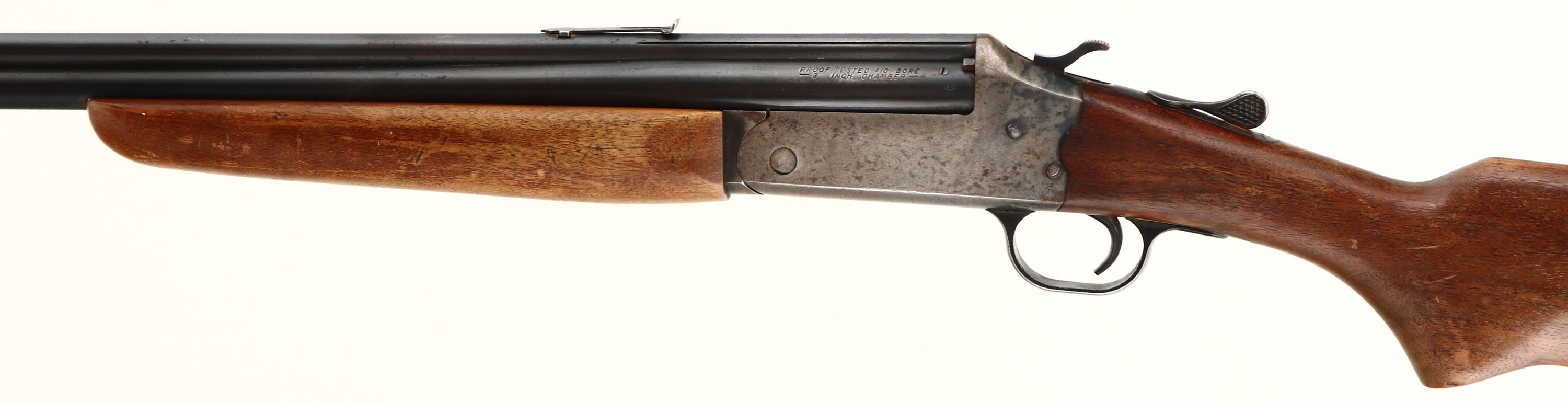 Savage Arms, Model 24, CAL: .22/.410, MFG: 1960, SN: N/A Break Action O/U, 24'' barrels. The flat pistol grip stock & forend are good, the stock has a small edge chip at the toe & the stocks display contusions, nicks & dings. The metal blue finish on the barrel rates 80% overall, with scuffs, blemishes & spotting toning to a brown patina. Bores are very good, displaying normal wear from honest use. The barrel holds an adjustable rear sight (missing elevator) & small bead front sight. Buttstock carries a grooved plastic buttplate. FFL or C&R Req. - Value: 200 to 500