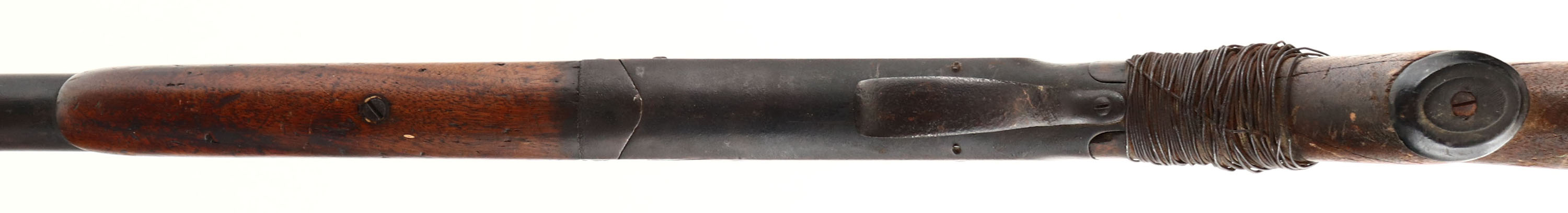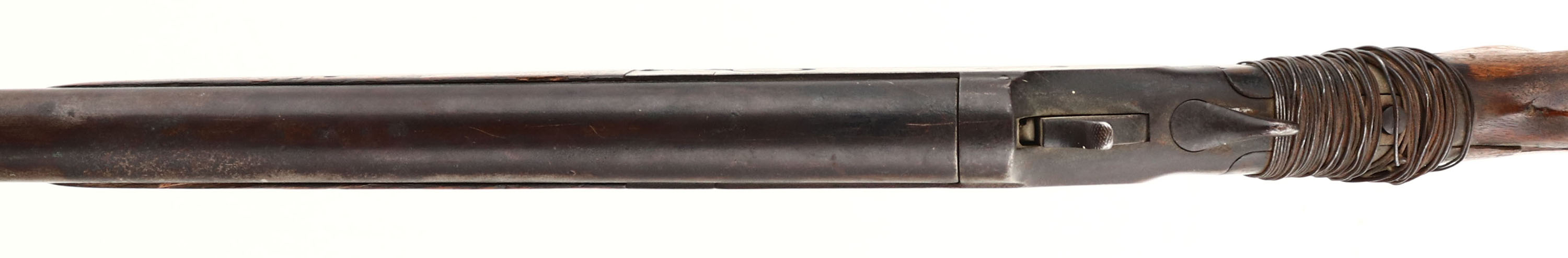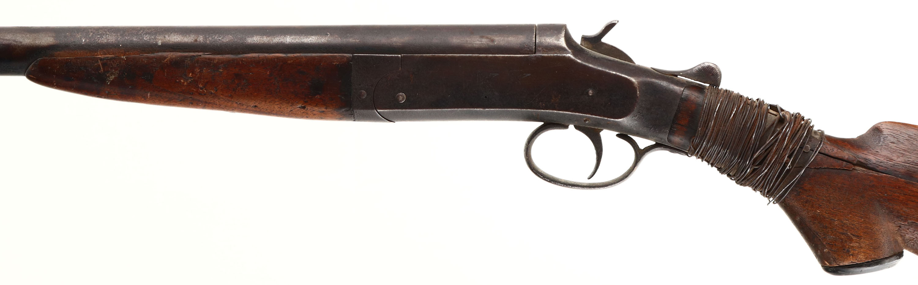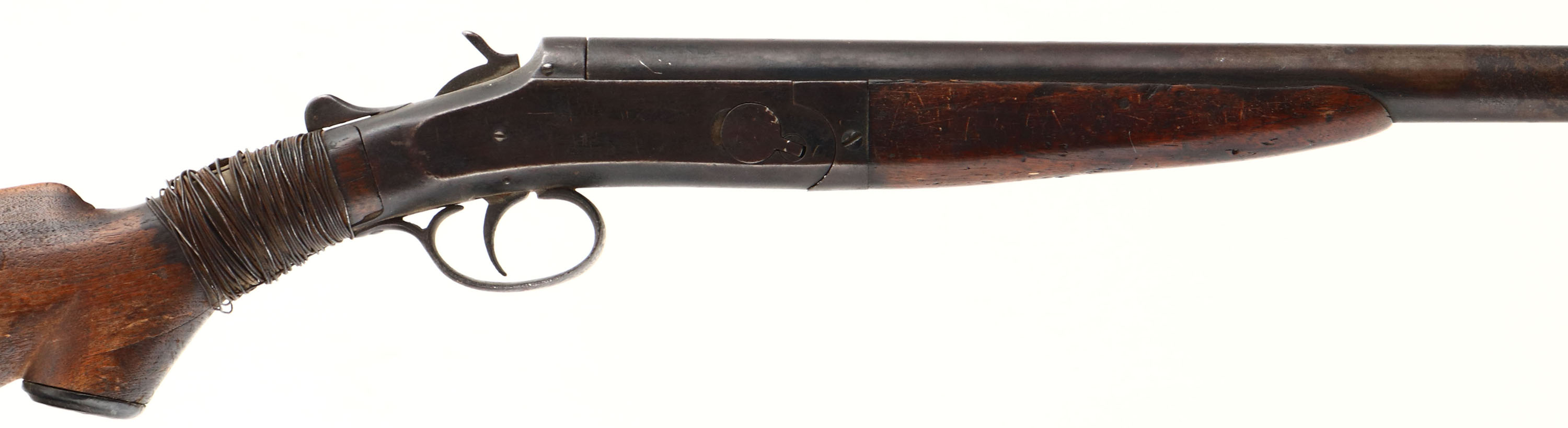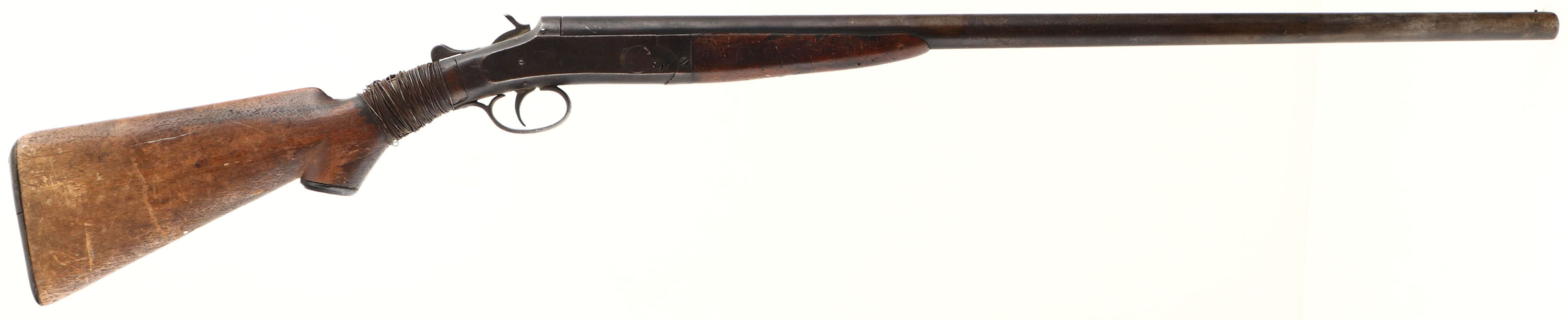 Crescent Firearms Co, Model ''Kleen Cutter'' , CAL: 12 GA, MFG: 1892-1931, SN: N/A, Break Action Single Shot Shotgun, 30'' barrel. The capped pistol grip wood stock & forend are poor. The stock has been broken at the wrist & has a crude wire wrap around the cracks & nails in an attempt to stablize. Stock may need replacement to utilze. The stock & forend displays edge chips, contusions, nicks & dings. The metal finish has worn to a rust brown, with lots of remaining rust & pitting. Bore is fair, but dark & rough. The barrel holds a single front bead. Buttstock carries a worn plastic buttplate. This gun is being sold ''as-is'', as a parts or non-functioning firearm. FFL or C&R Req. - Value: 40 to 100