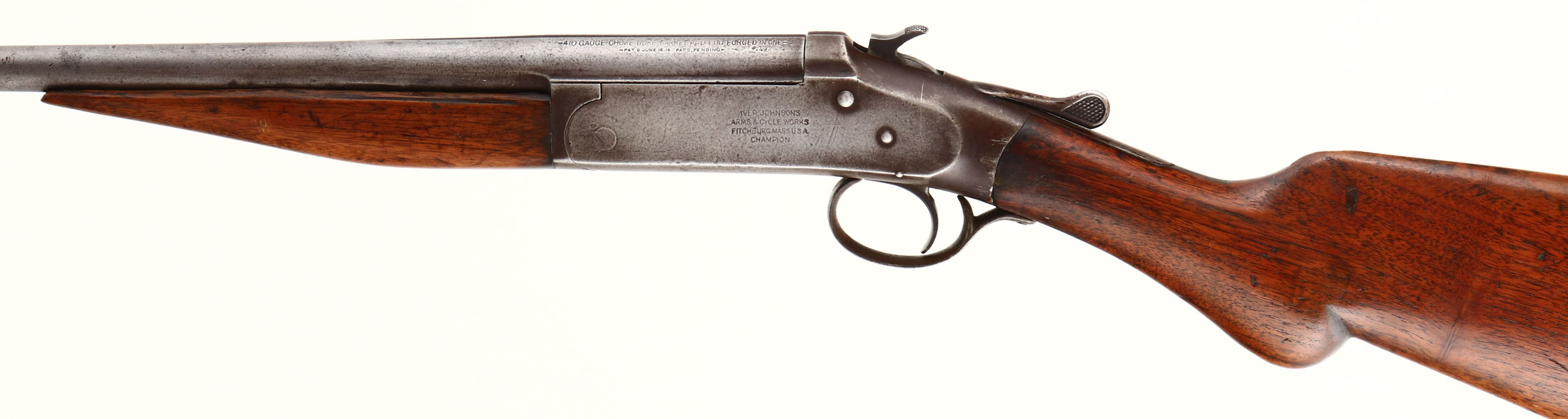 Iver Johnson, Model ''Champion'', CAL: .410, MFG: 1909-19, SN: 86924, Break Action Single Shot Shotgun, 26'' barrel. The refinished round knob wood stock & forend are good. The stock displays repaired cracks & filled edge chips, along with other contusions, scrapes, nicks & dings. The metal finish has toned to a mix of metal gray & brown patina. Bore is fair, with intermittent pitting. The barrel holds a single front bead. Buttstock carries a grooved plastic buttplate. FFL or C&R Req. - Value: 100 to 300