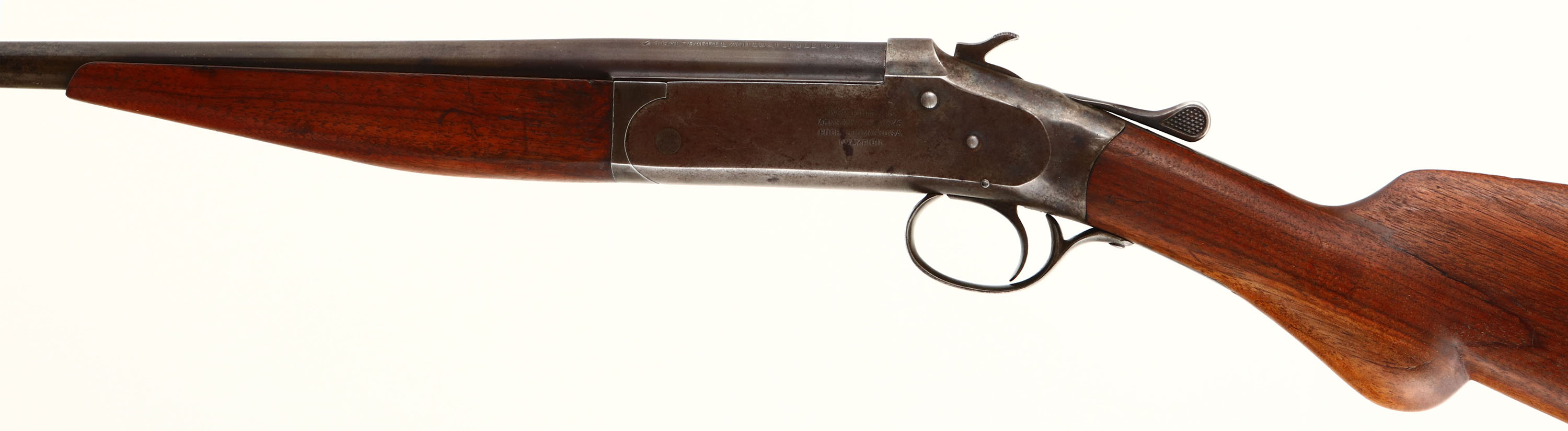 Iver Johnson, Model ''Champion'', CAL: .44 SHOT, MFG: 1911-15, SN: 7831, Break Action Single Shot Shotgun, 26'' barrel. The refinished round knob pistol grip wood stock appears very good & solid, despite a glued tight large repair at the wrist, along with other small contusions, scrapes & dings. The metal finish on the barrel has worn to gun metal gray & having a thin brown patina. The receiver is case-hardened, displaying remnants of case-coloring. Bore is good, with spotting & light pitting near the breech end. The barrel carries a single front bead. Buttstock carries a I.J. grooved black plastic buttplate. FFL or C&R Req. - Value: 100 to 300