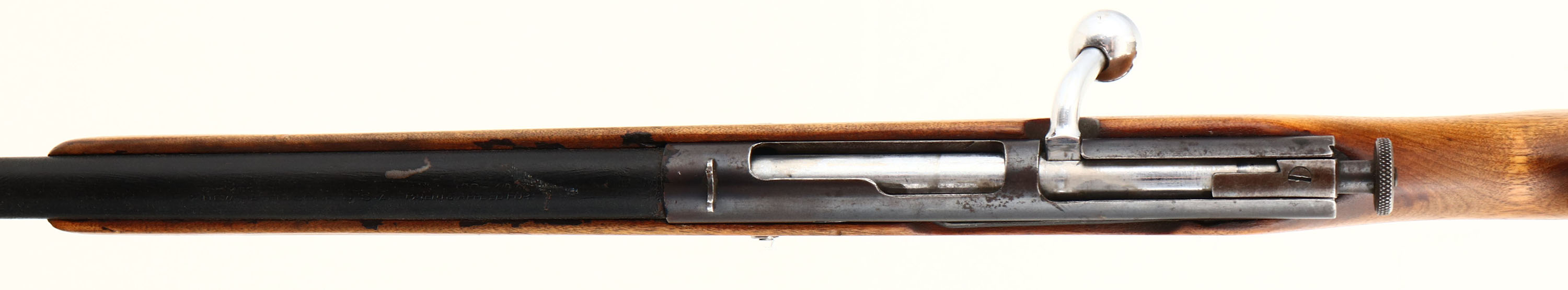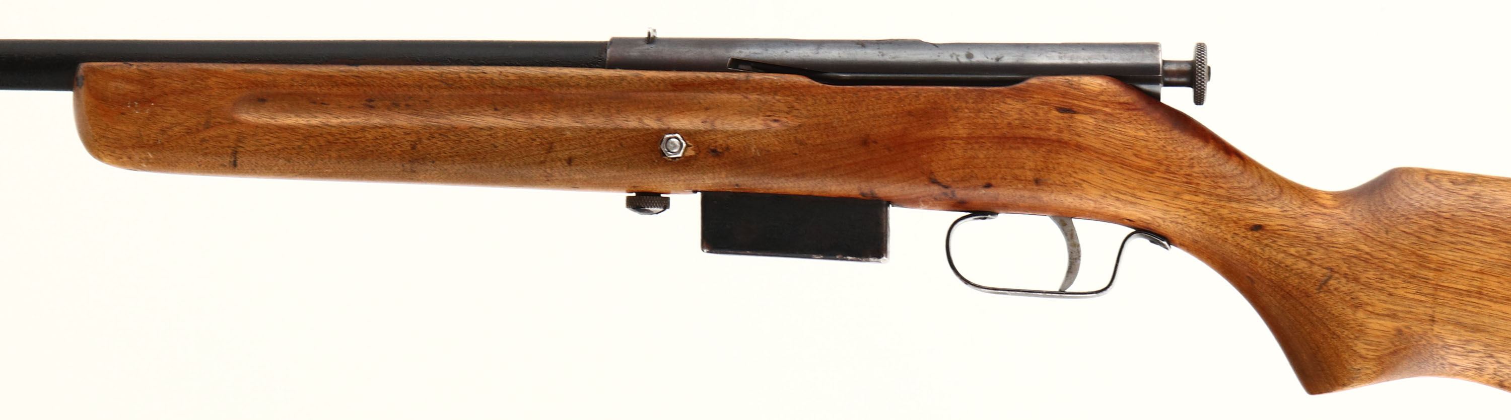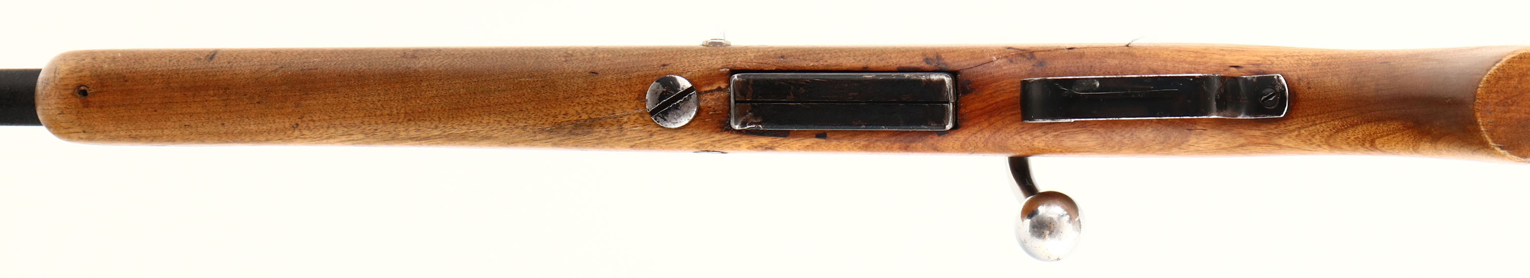 Mossberg, Model 80, CAL: 410, MFG: 1933-36, SN: N/A, Bolt Action Shotgun, 24'' barrel. The flat pistol grip wood stock is good, displaying a large toe repair, along with other contusions, scrapes & dings. The matte black coating on the barrel rates 80% overall, with spotting, blemishes & scuffs. The receiver has toned to a brown patina. Bore is excellent & bright. Buttstock carries a smooth metal buttplate. FFL or C&R Req. - Value: 50 to 150