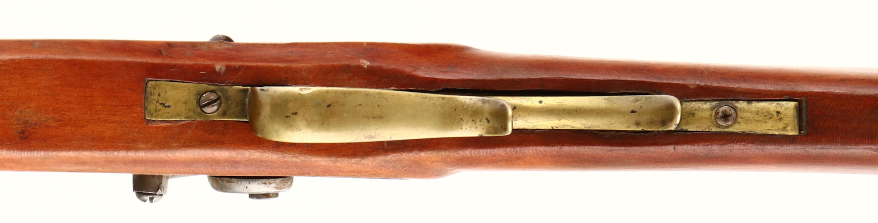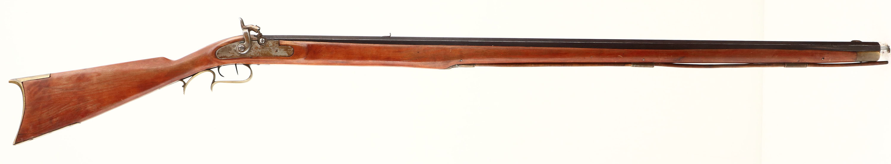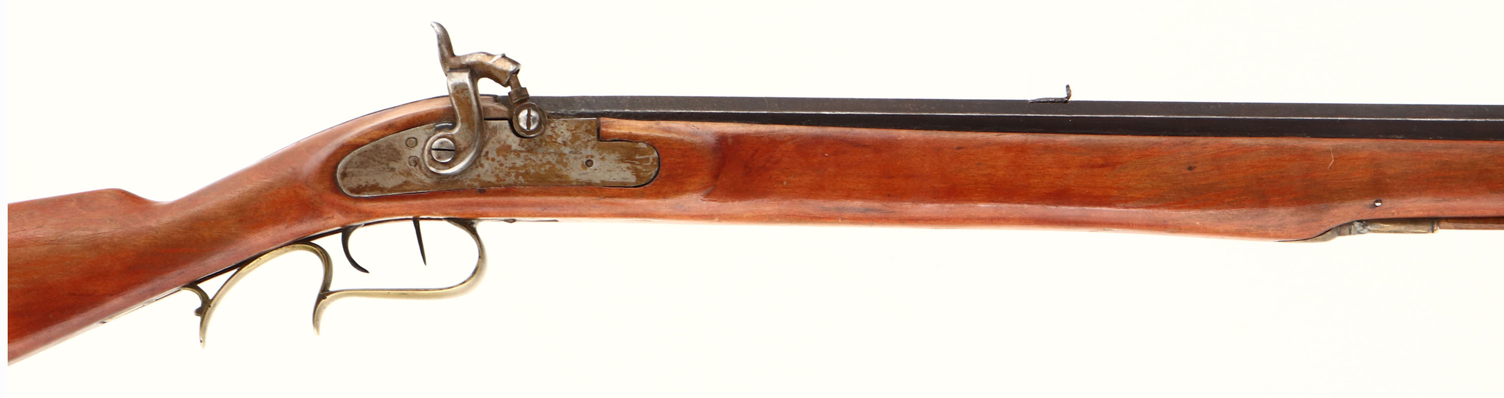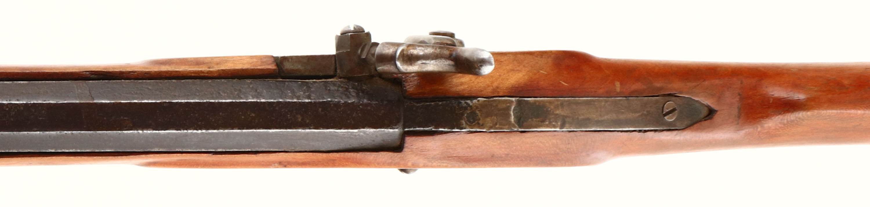 H.D. Ziegler. CAL: .34, MFG: N/A, S/N: N/A, Percussion Muzzleloader, 40 1/2'' octagon barrel. The refinished straight grip wood stock is very good with 1'' crack on both sides of the toe, along with other minor scrapes, nicks & dings. The once restored metal blue finish has toned to an even brown patina. Top of barrel is marked ''H.D. ZIEGLER P.O.''. Bore is good, with rust & pitting amongst strong rifling. Barrel holds a broken rear sight & blade front sight. Stock carries a crescent brass buttplate. Action is tight, but does not lock back. Muzzleloader, No FFL Req. - Value: 50 to 200