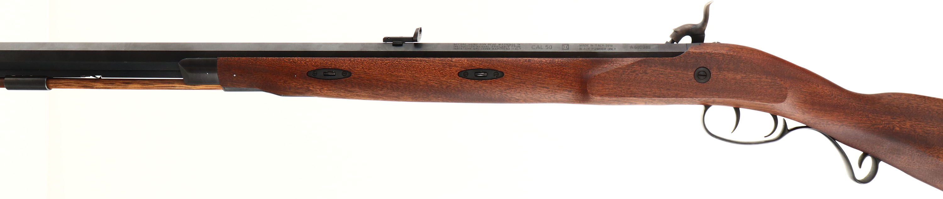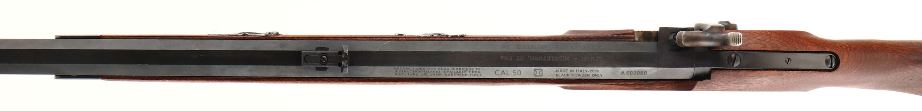 Lyman. Model: Great Plains Hunter. Cal: .50. MFG: modern. S/N: A602080. Percussion Muzzleloader. 32'' octagonal barrel. The straight wrist cheeked wood stock is excellent, two pieces of tape on right side of stock. The metal finish rates 99% overall. Barrel is marked with warning, 'CAL:50'', ''I'' in box, ''MADE IN ITALY-2018 BLACK POWDER ONLY'', S/N, top of barrel is marked ''LYMAN - MIDDLETOWN, CT USA'', right side of barrel is marked ''GREAT PLAINS HUNTER .50''. Bore is excellent. Blade front sight, buckhorn rear sight. Metal buttplate. Comes with ram rod. Muzzleloader No FFL Req. - Value: 100 to 300